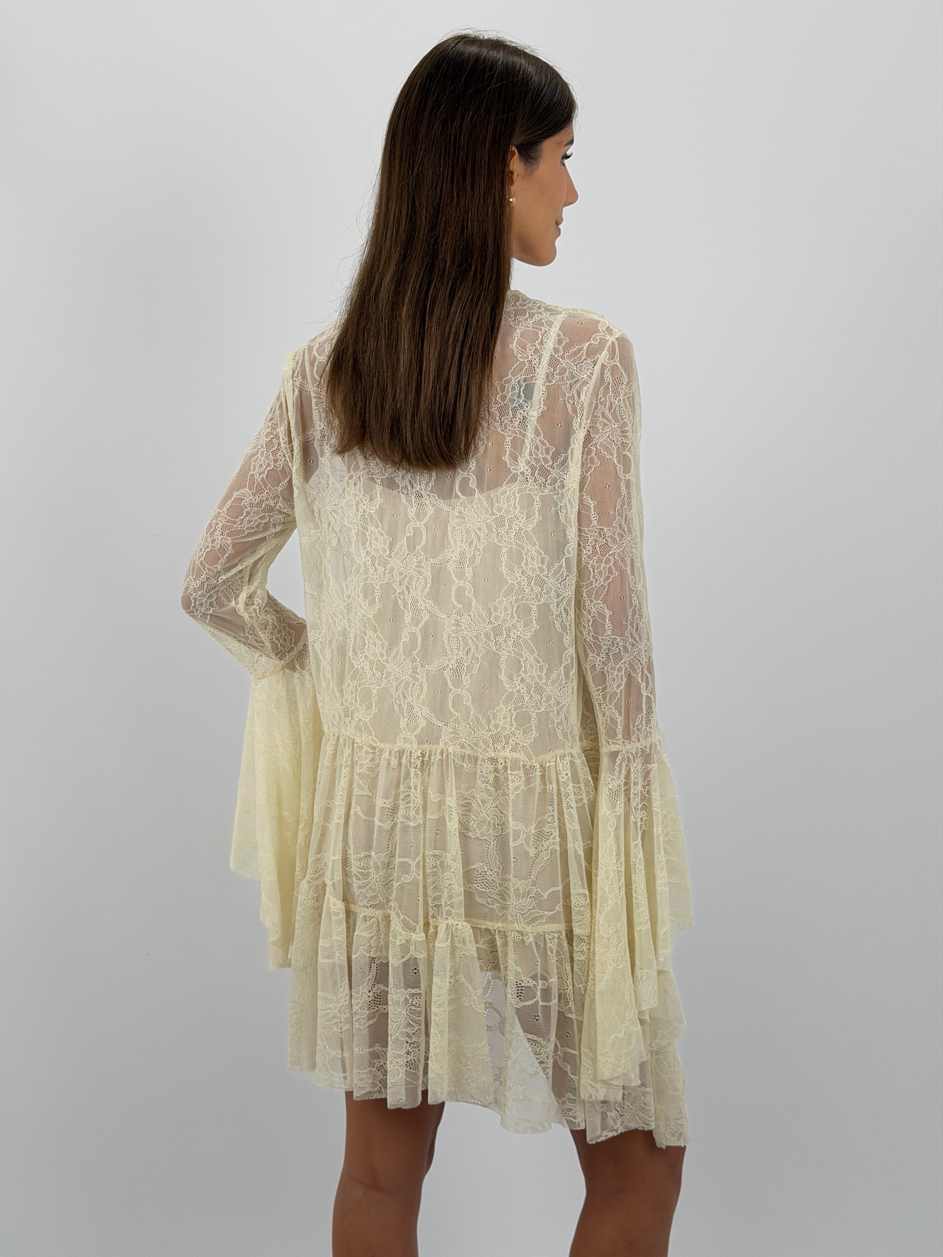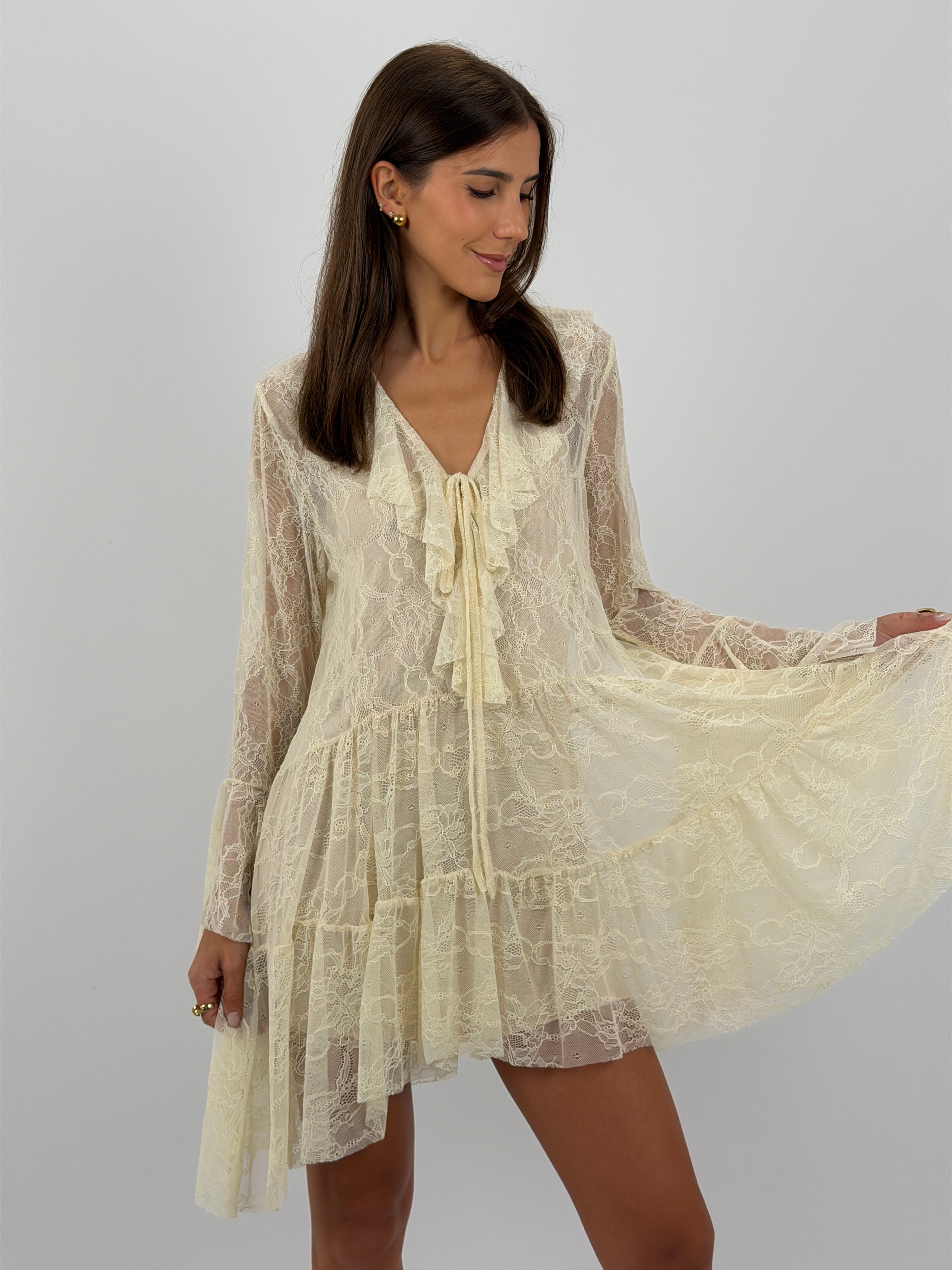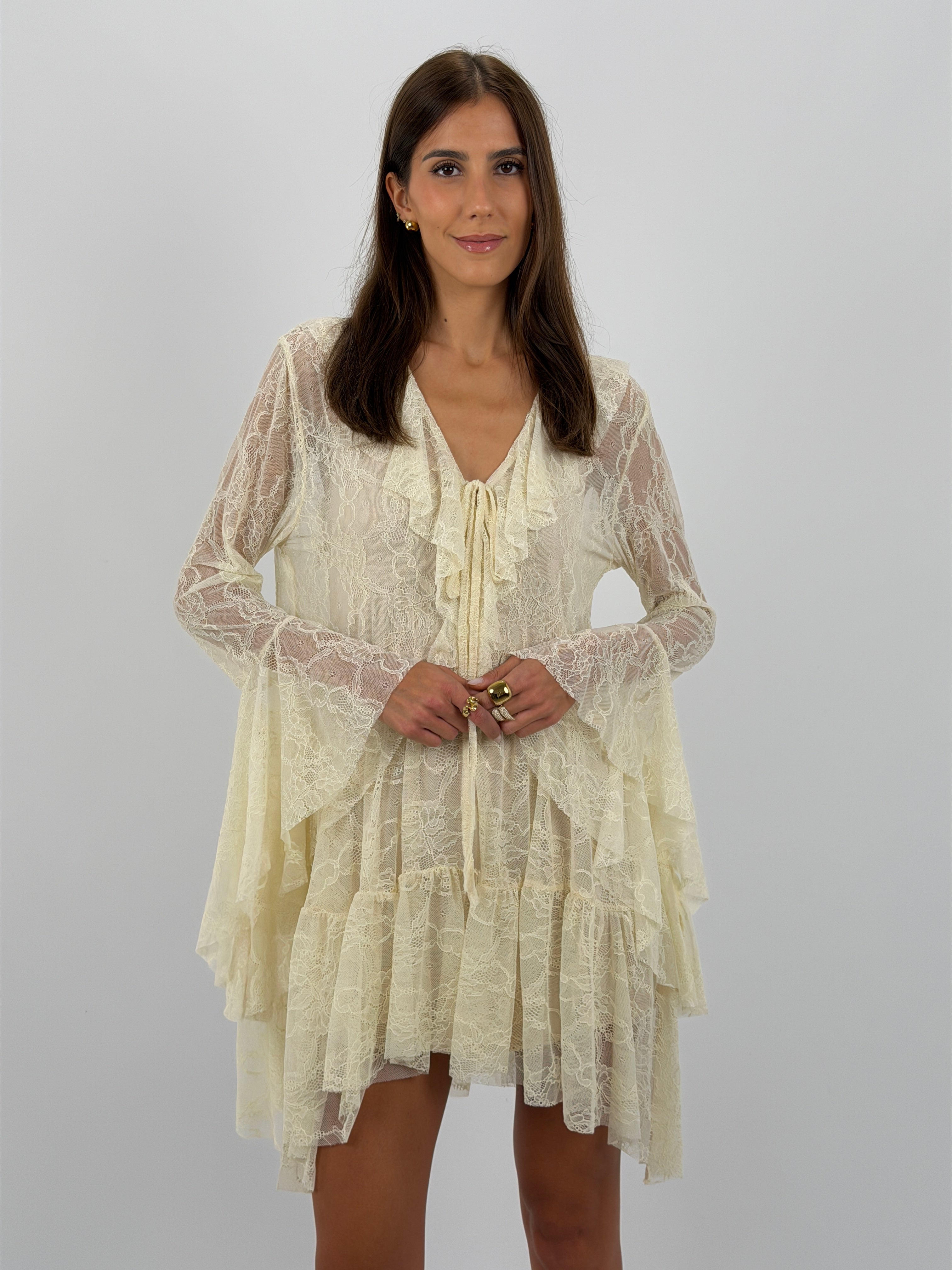 Abito corto in pizzo color crema con volant e sottoveste, scollo a V e laccetto frontale.