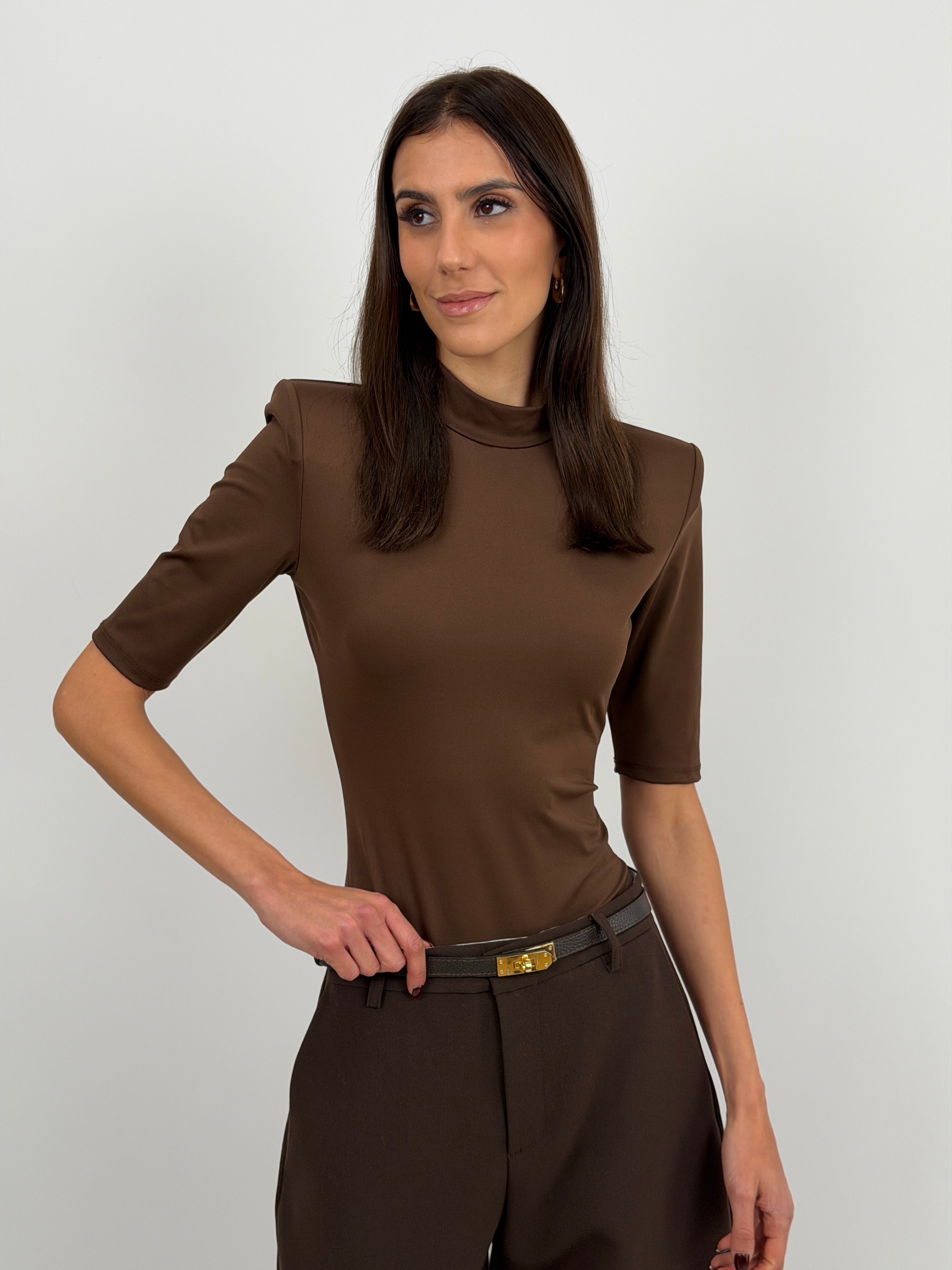 Body marrone in tessuto elasticizzato con spalline imbottite, collo a lupetto e chiusura con gancetti