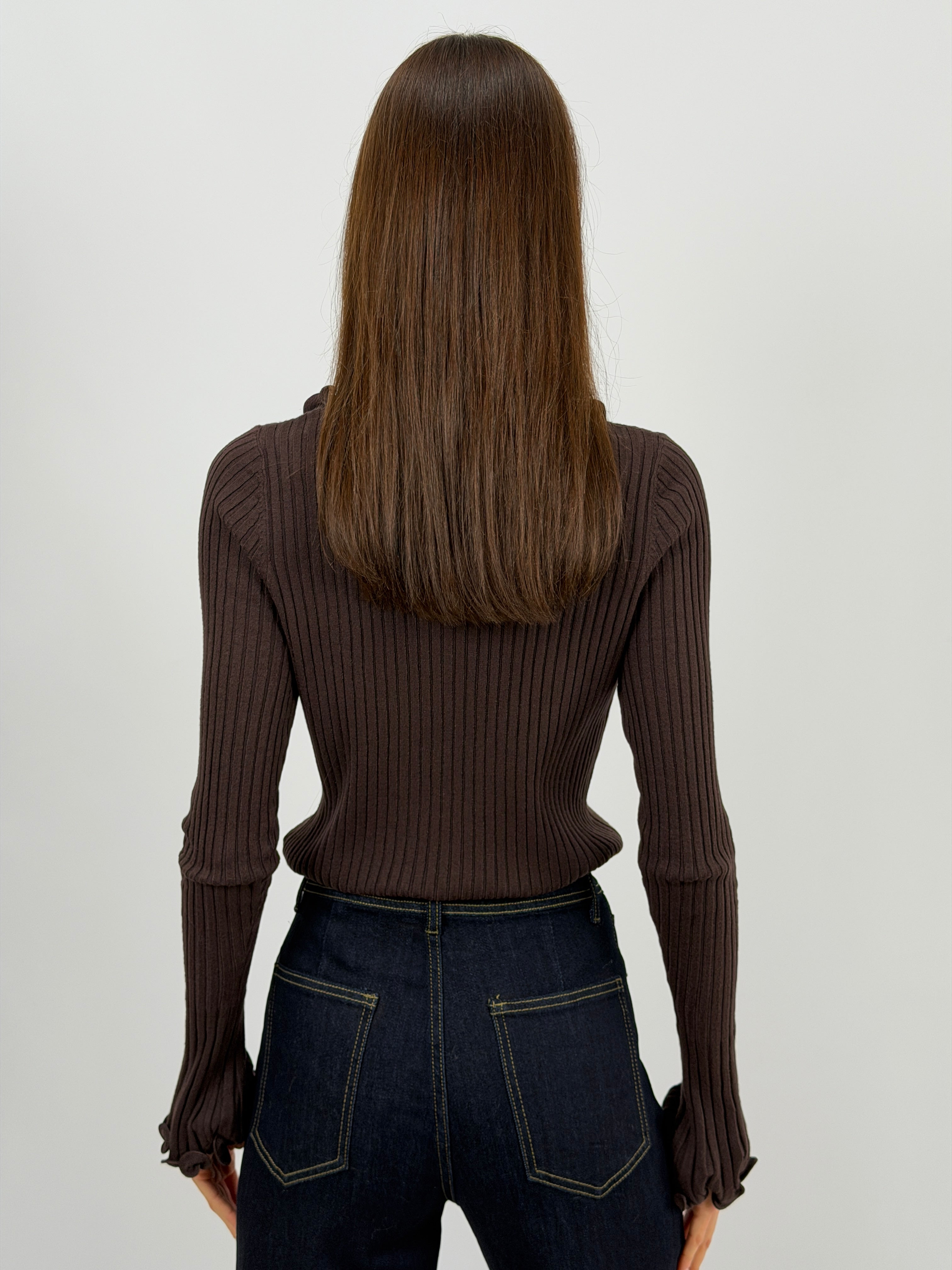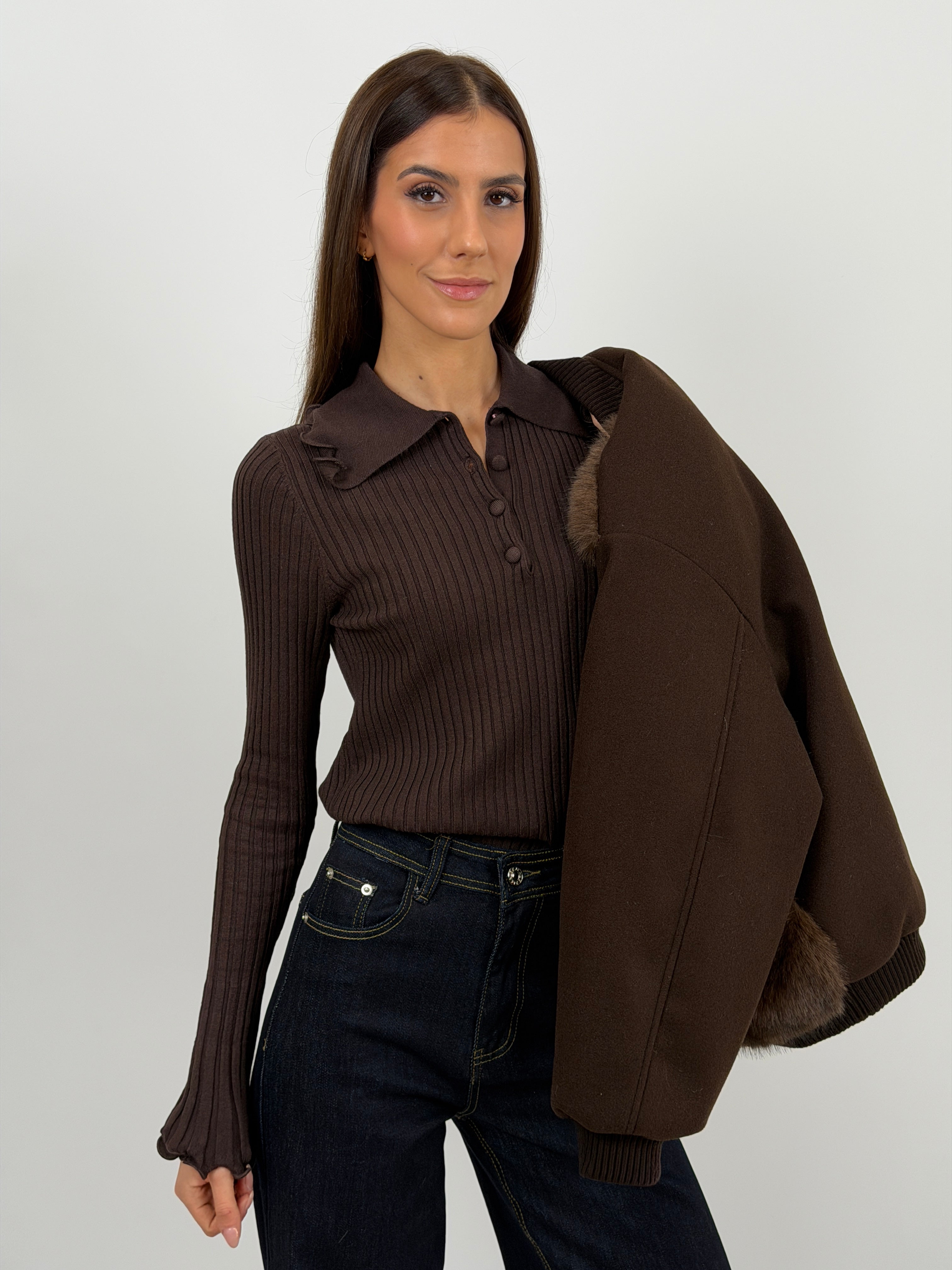 Maglia a polo marrone con bottoncini e colletto arricciato a costine