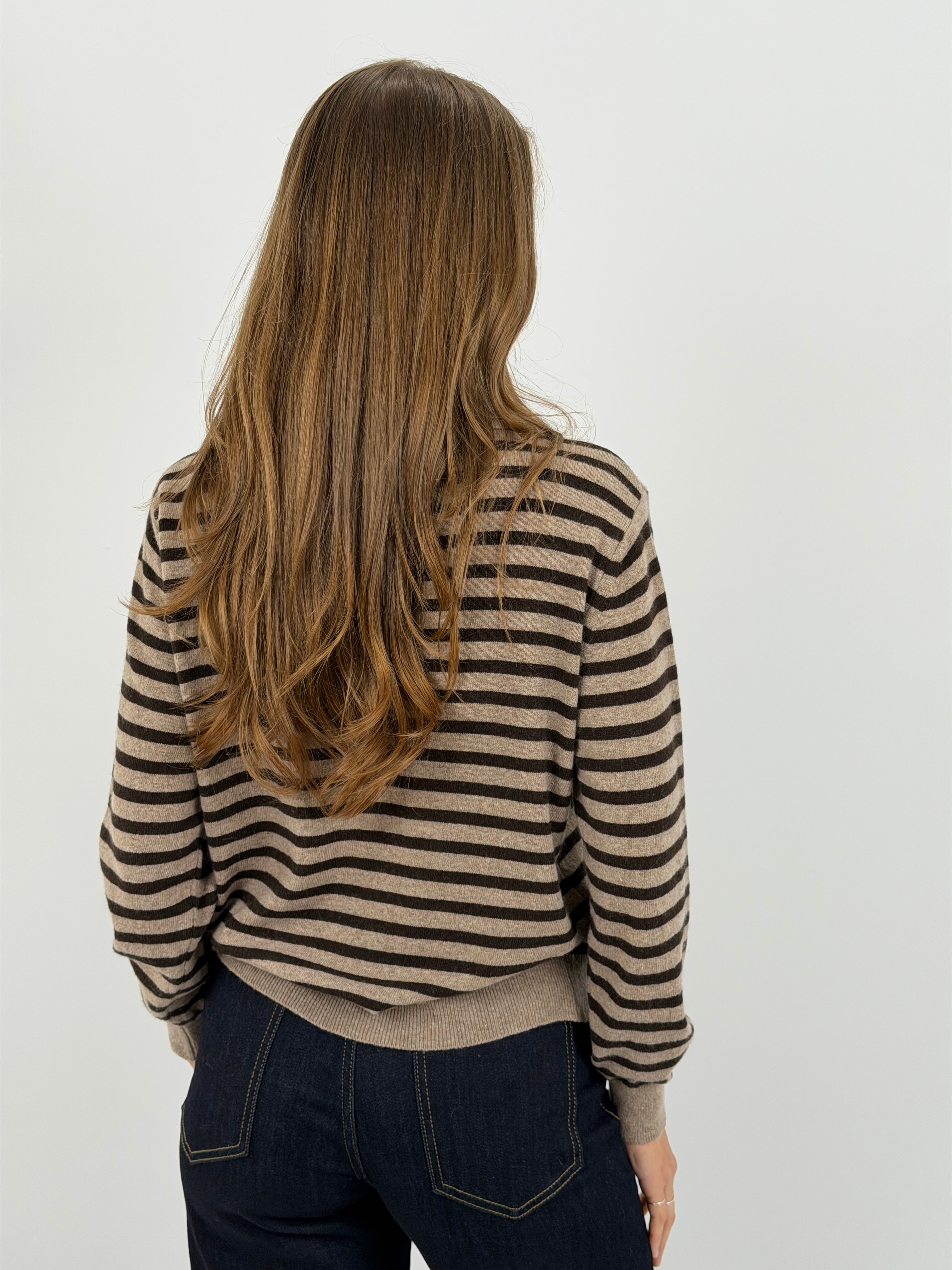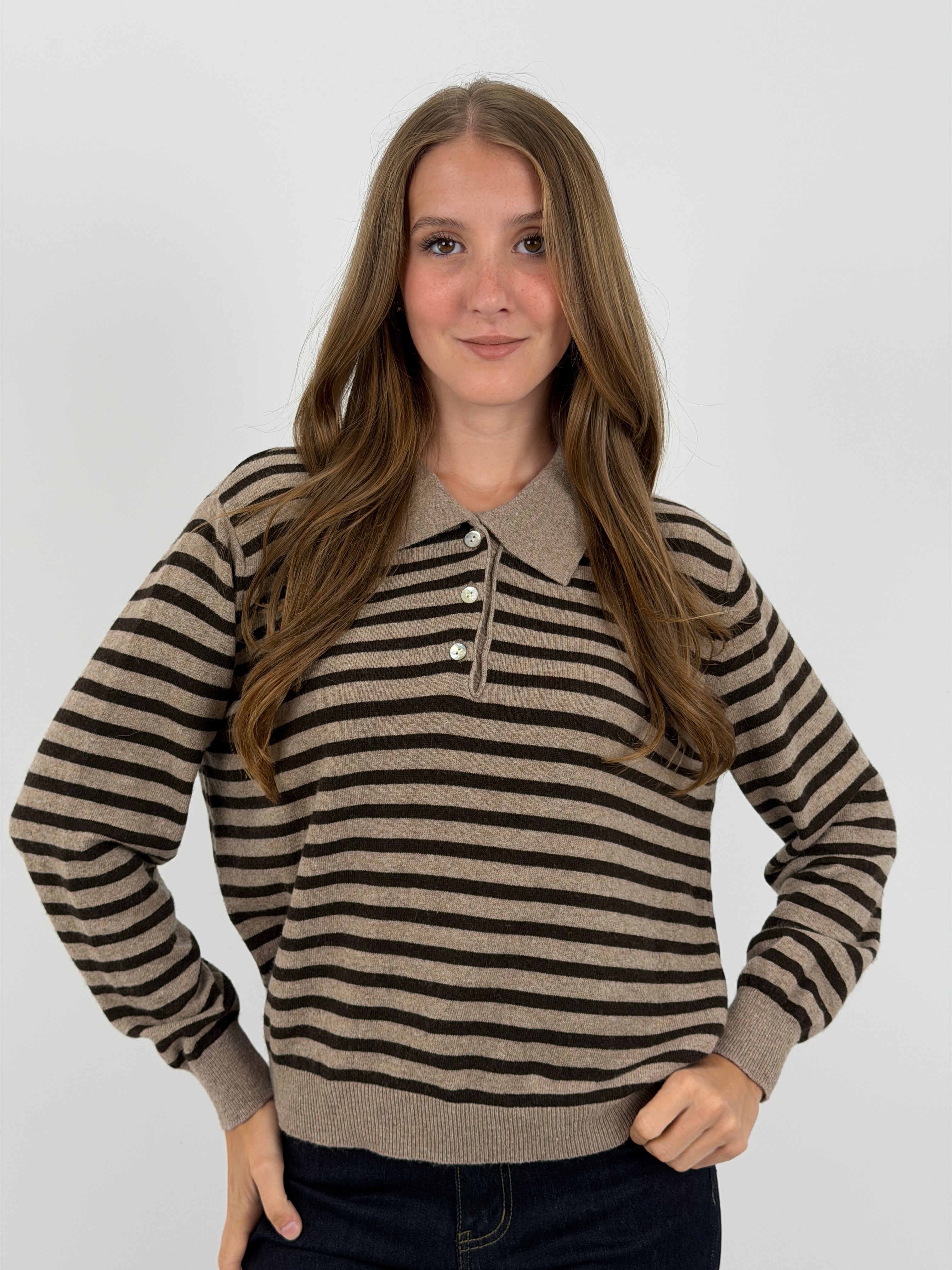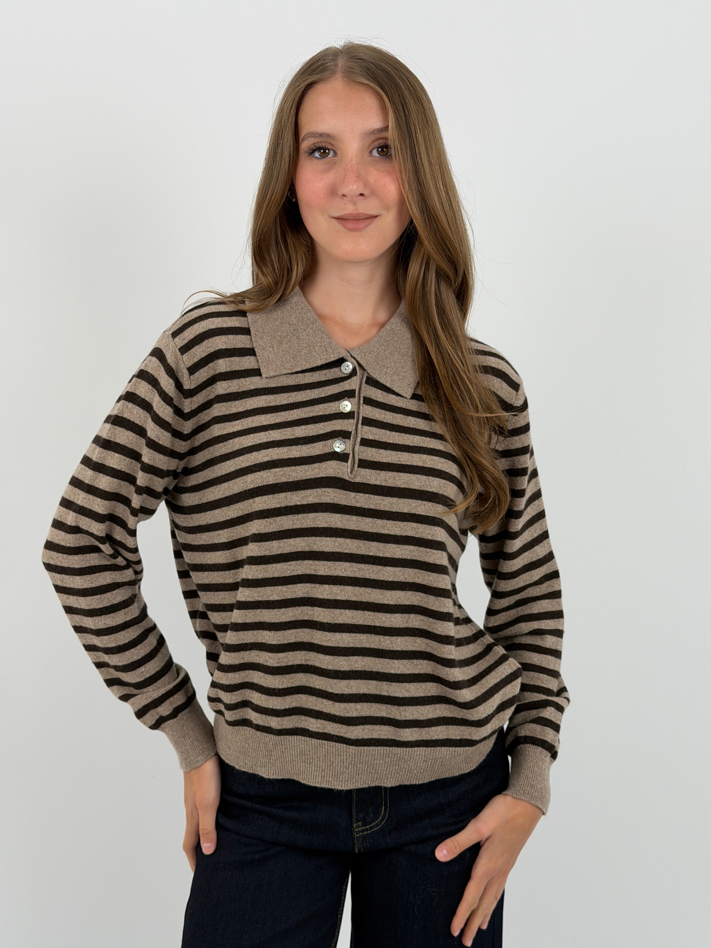 Maglione a polo taupe in lana e cashmere, con manica lunga e righe marroni, colletto classico e chiusura con bottoni.