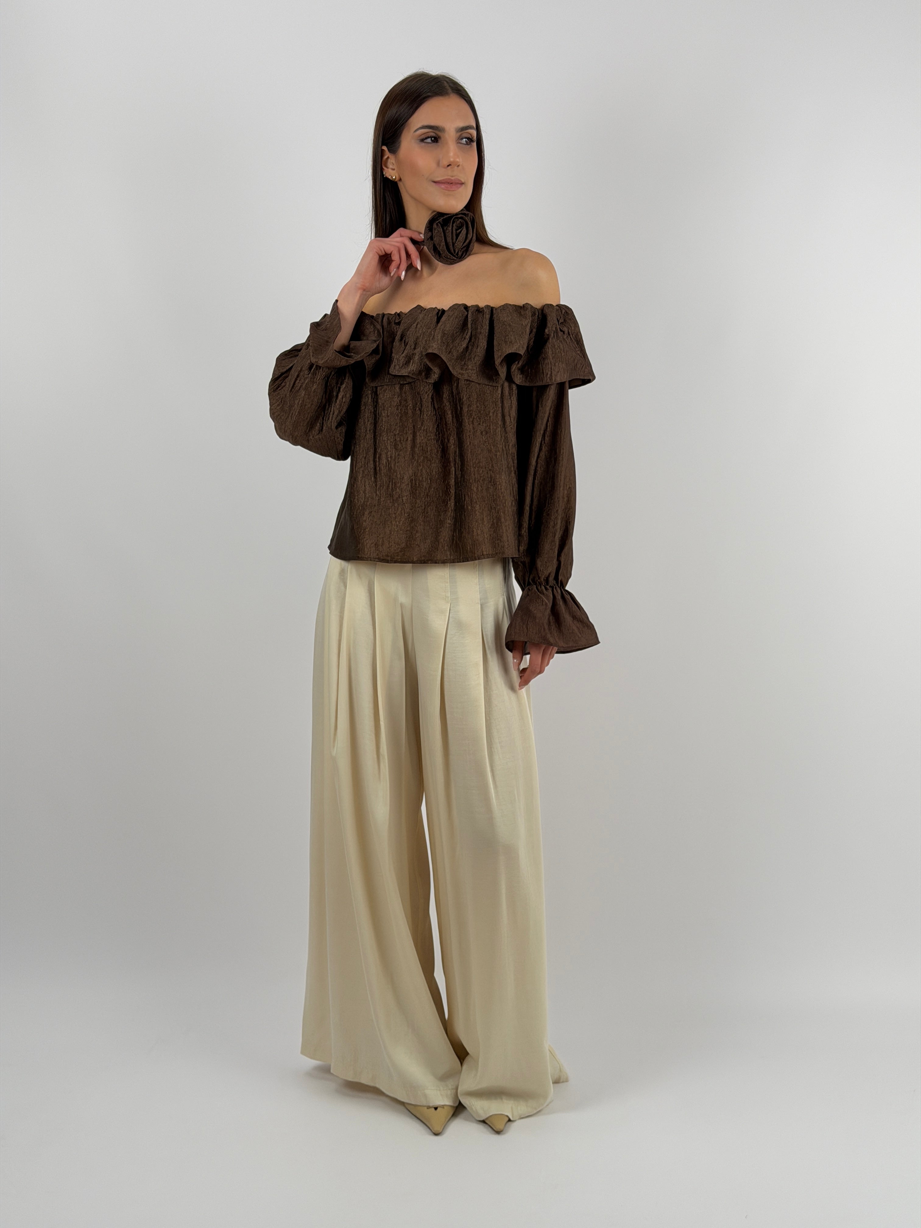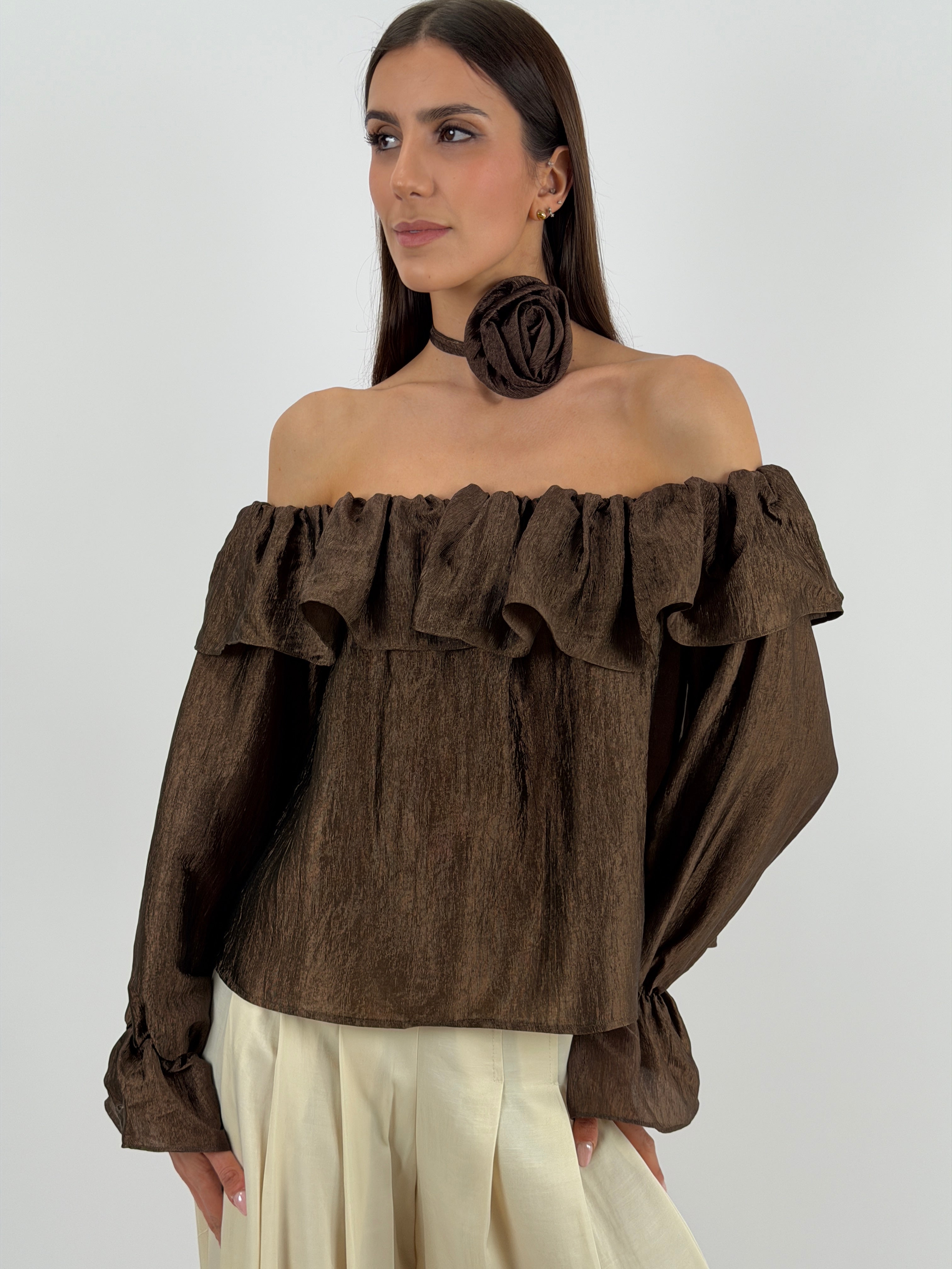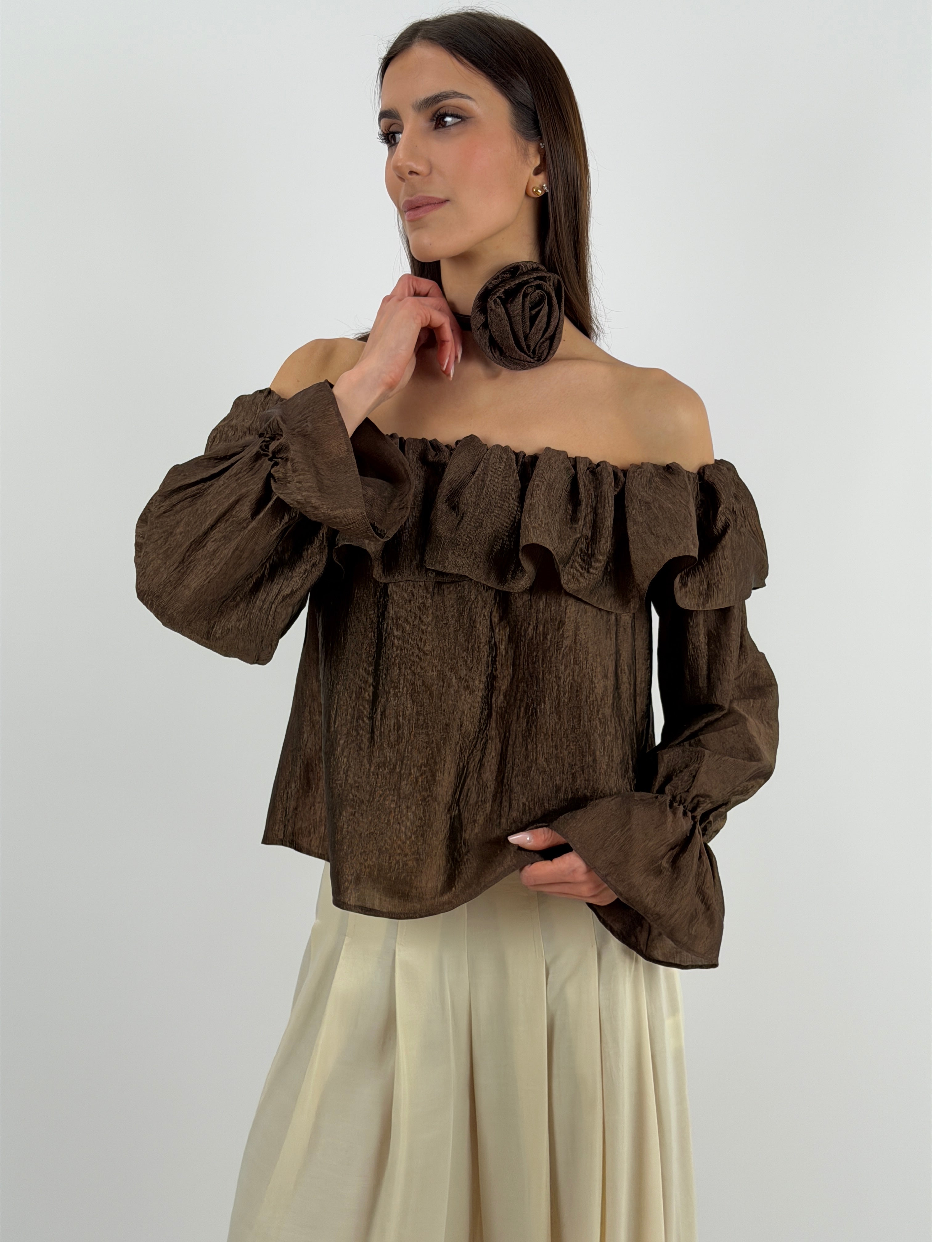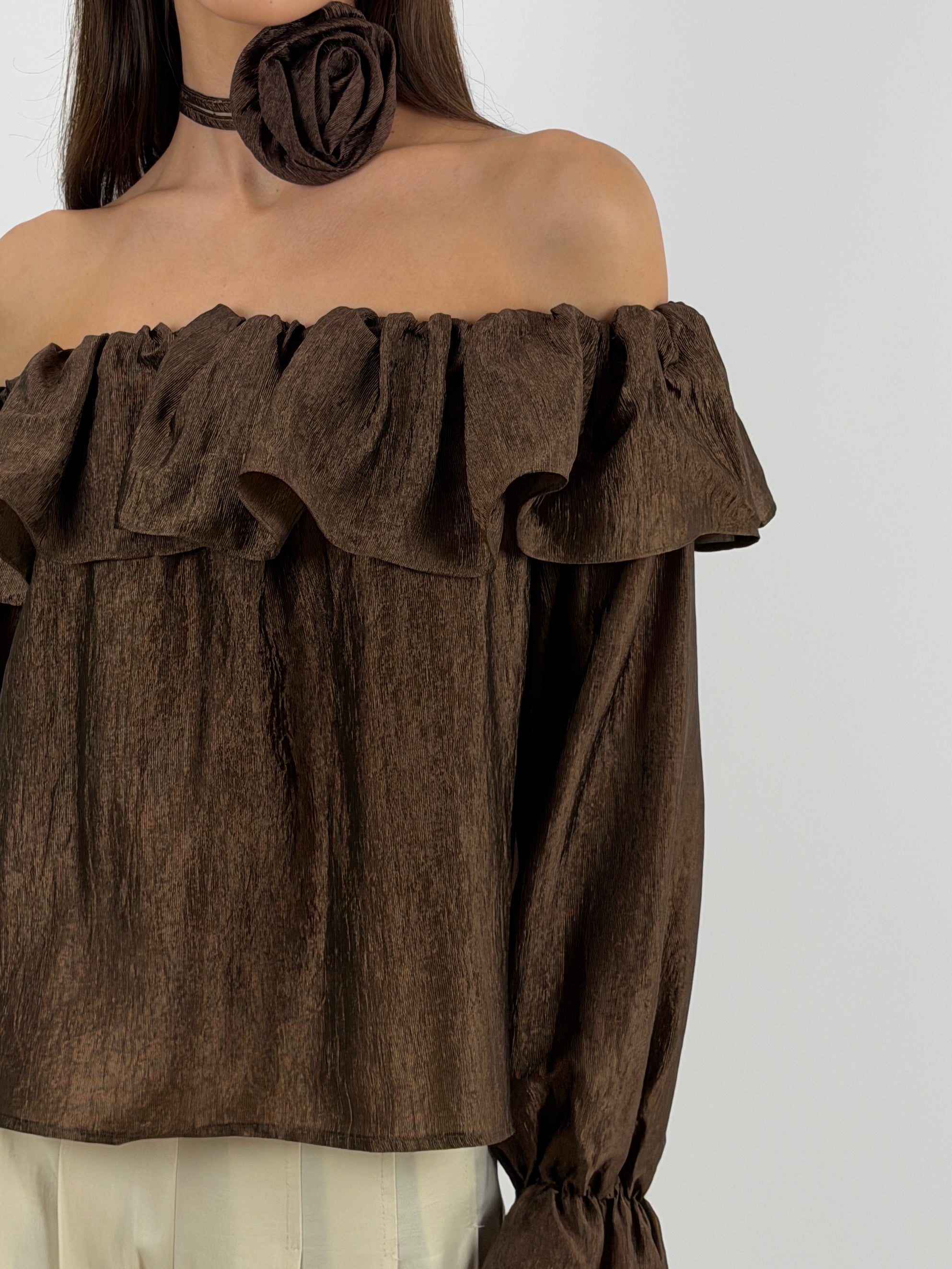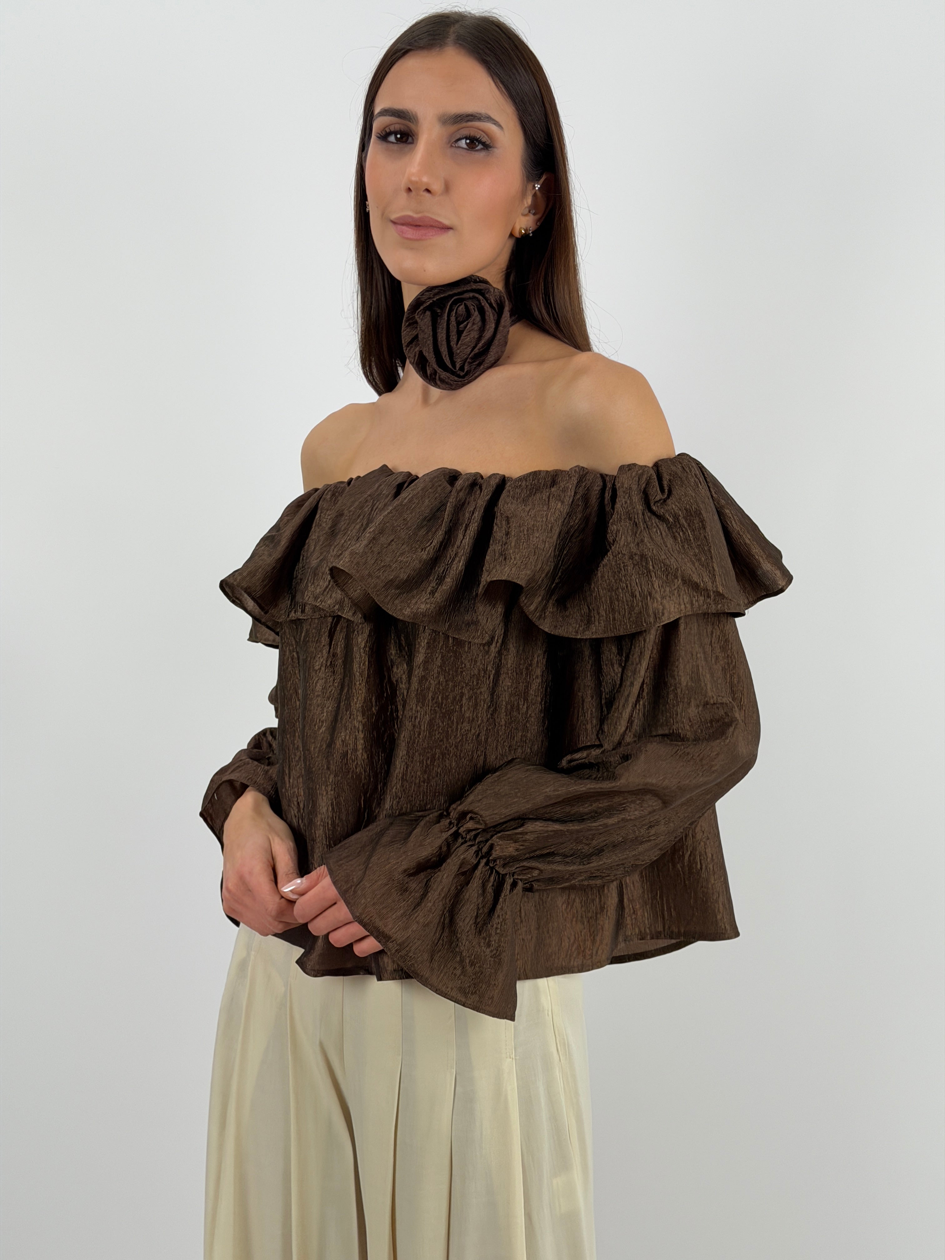 Top Lumina marrone in tessuto satinato, scollo off shoulder con elastico e volant, maniche lunghe con polsini elasticizzati e dettaglio fiore removibile