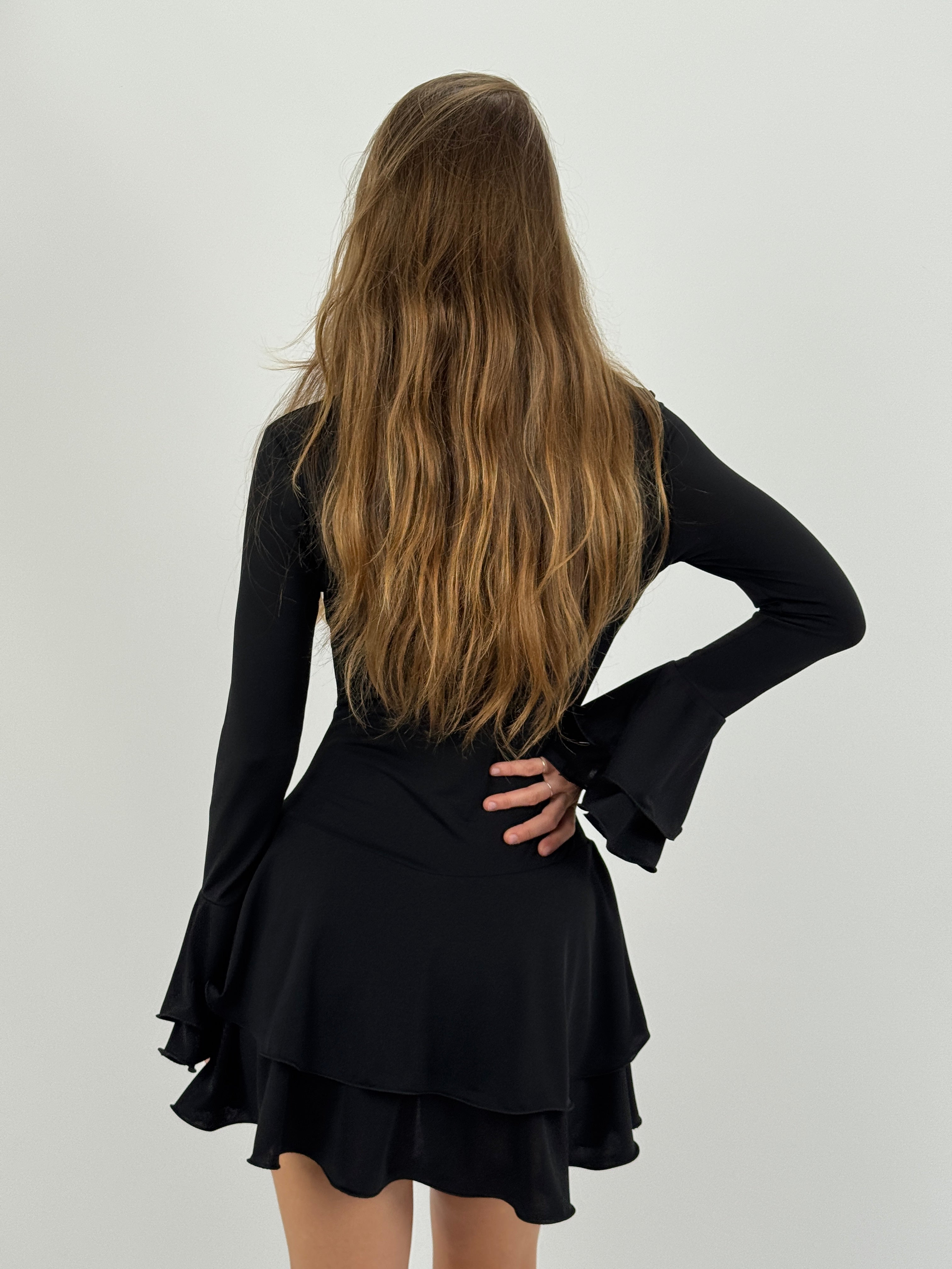 Abito corto nero con volant, maniche lunghe e bottoncini frontali. Modello con coulotte incorporata.