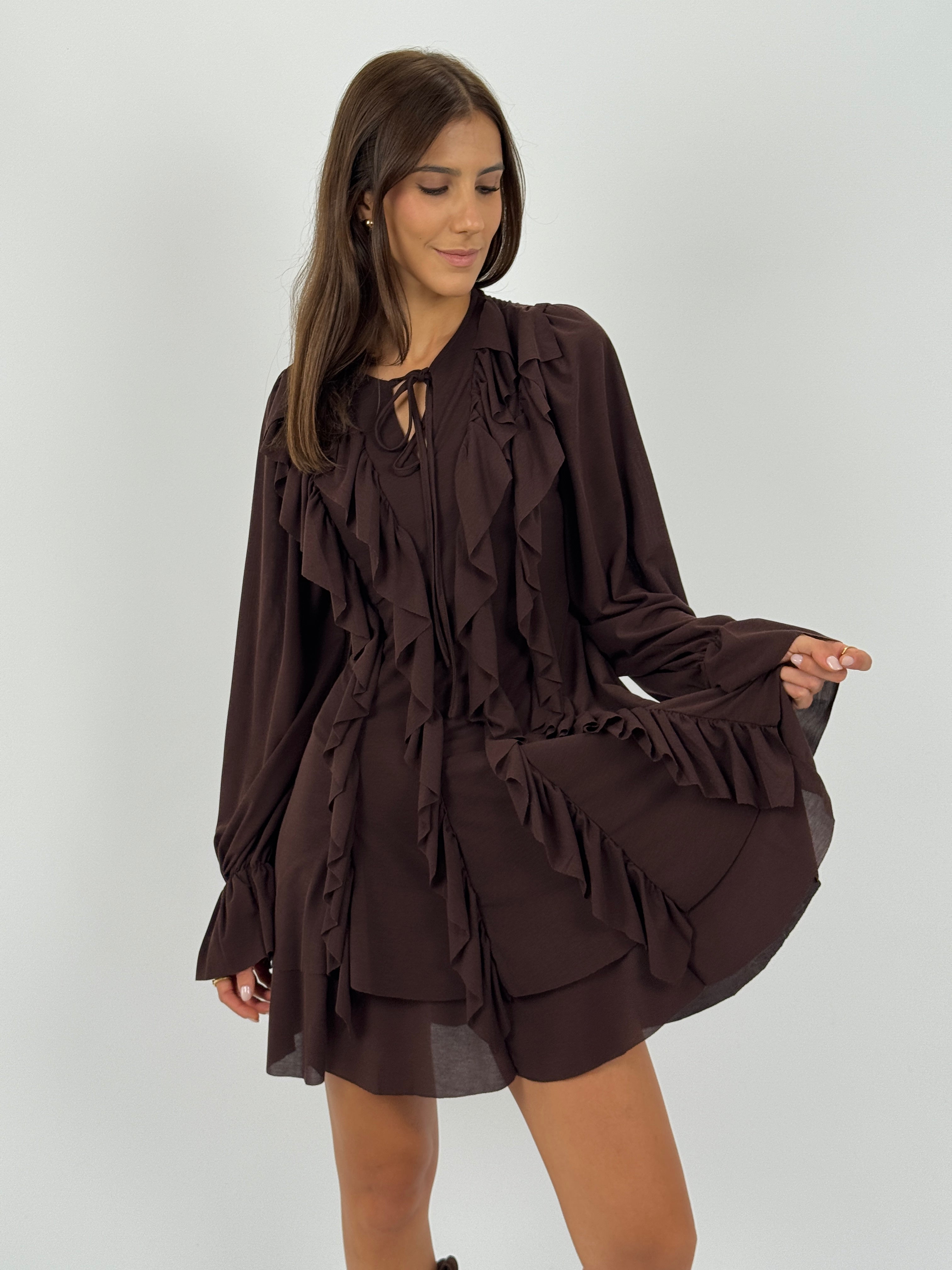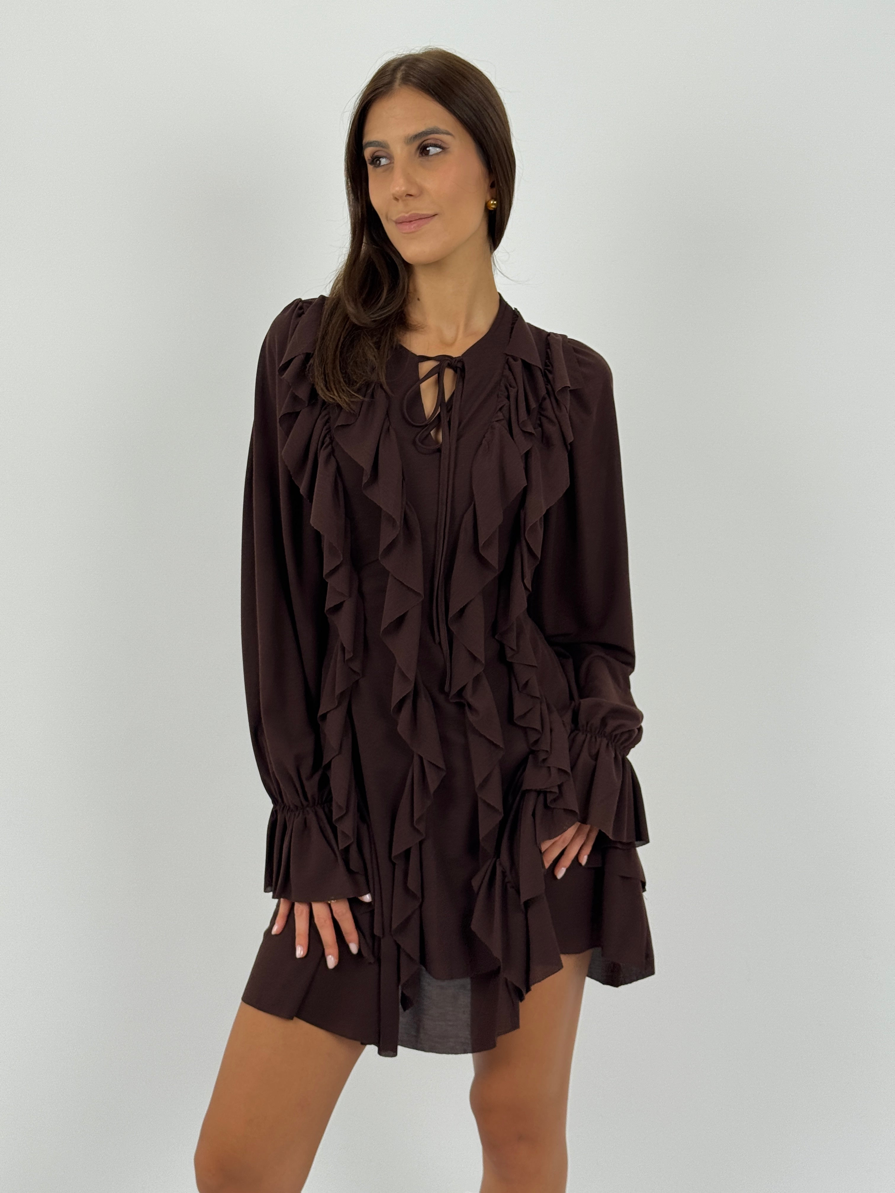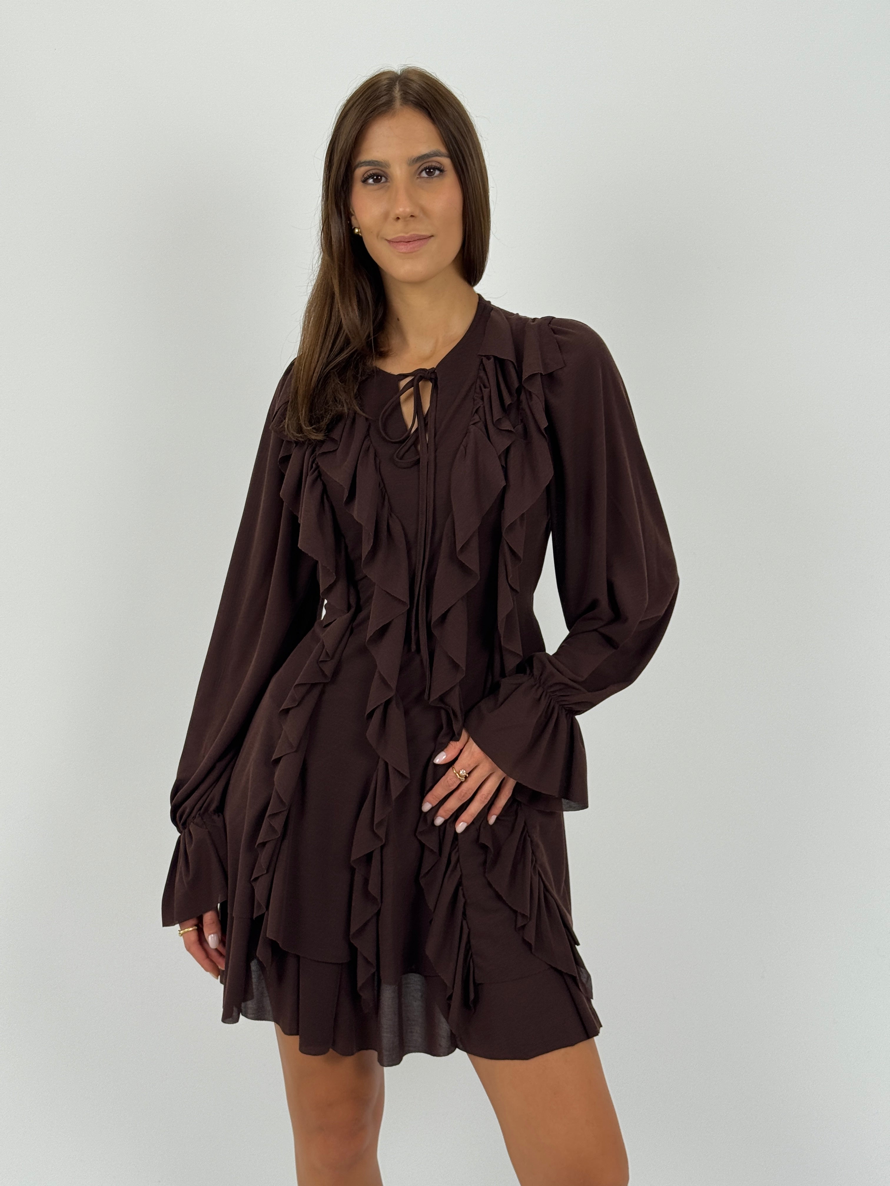 Abito corto marrone con maniche lunghe, volant frontali e laccetto sul collo. Elastico sul retro in vita per una vestibilità comoda e femminile.