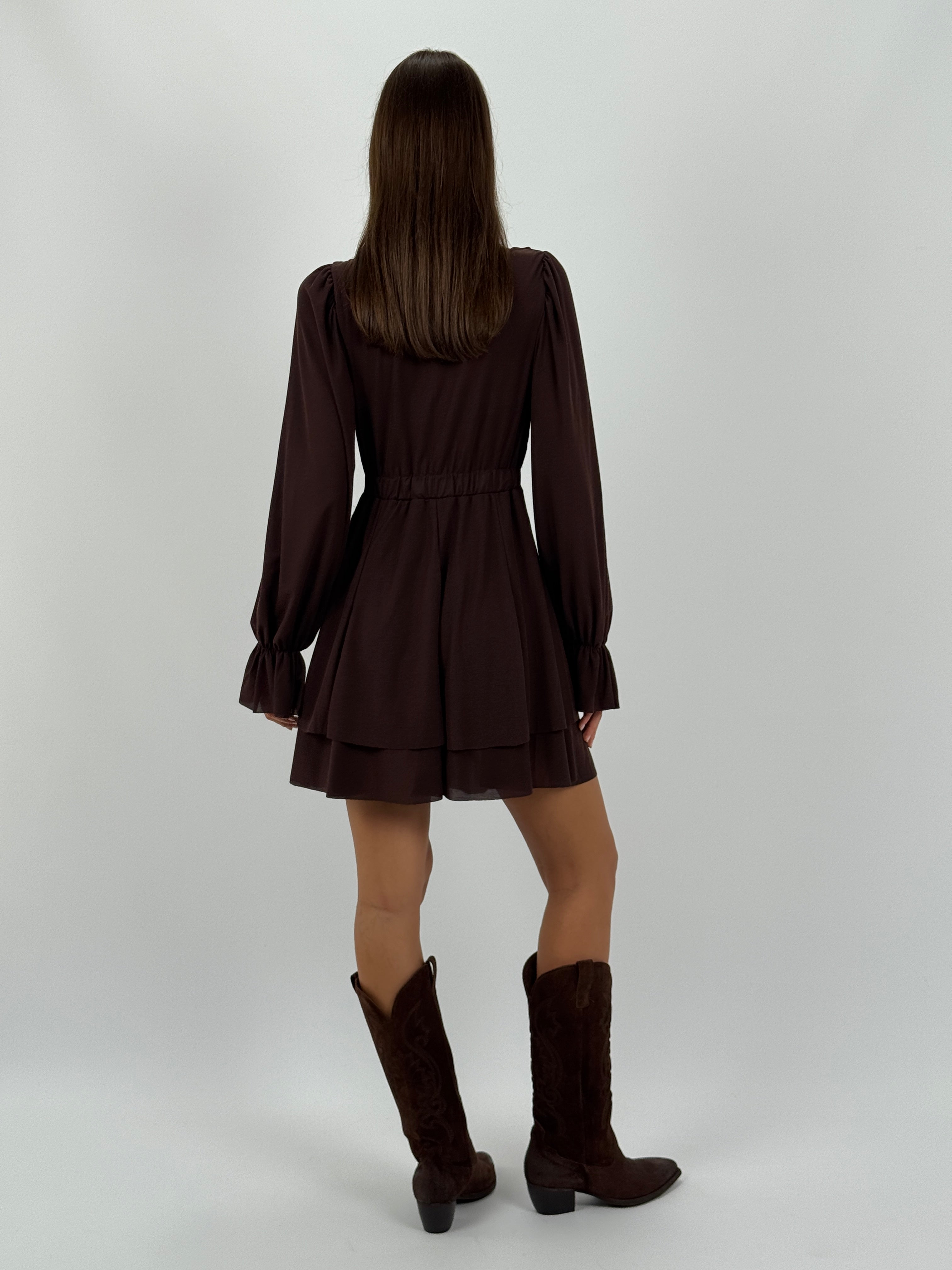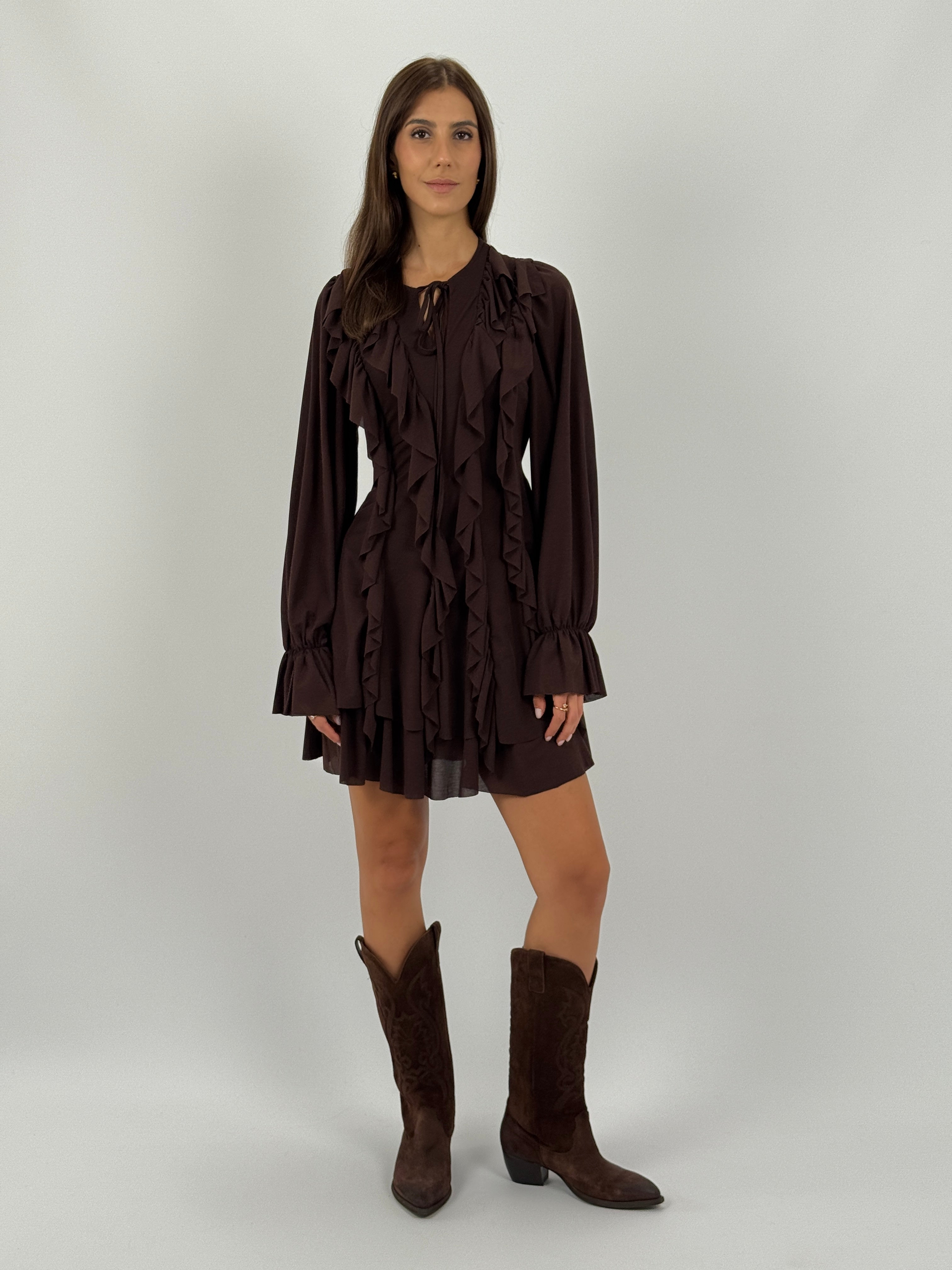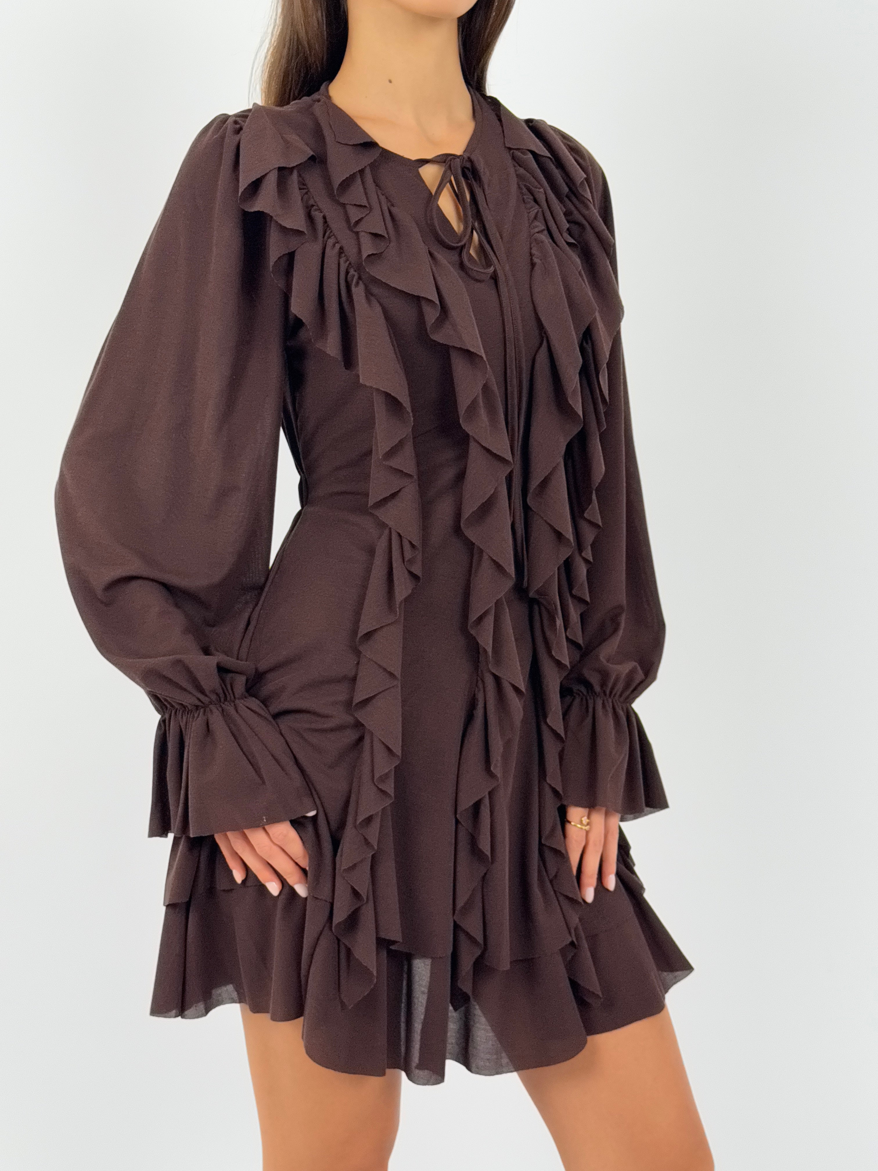 Abito corto marrone con maniche lunghe, volant frontali e laccetto sul collo. Elastico sul retro in vita per una vestibilità comoda e femminile.