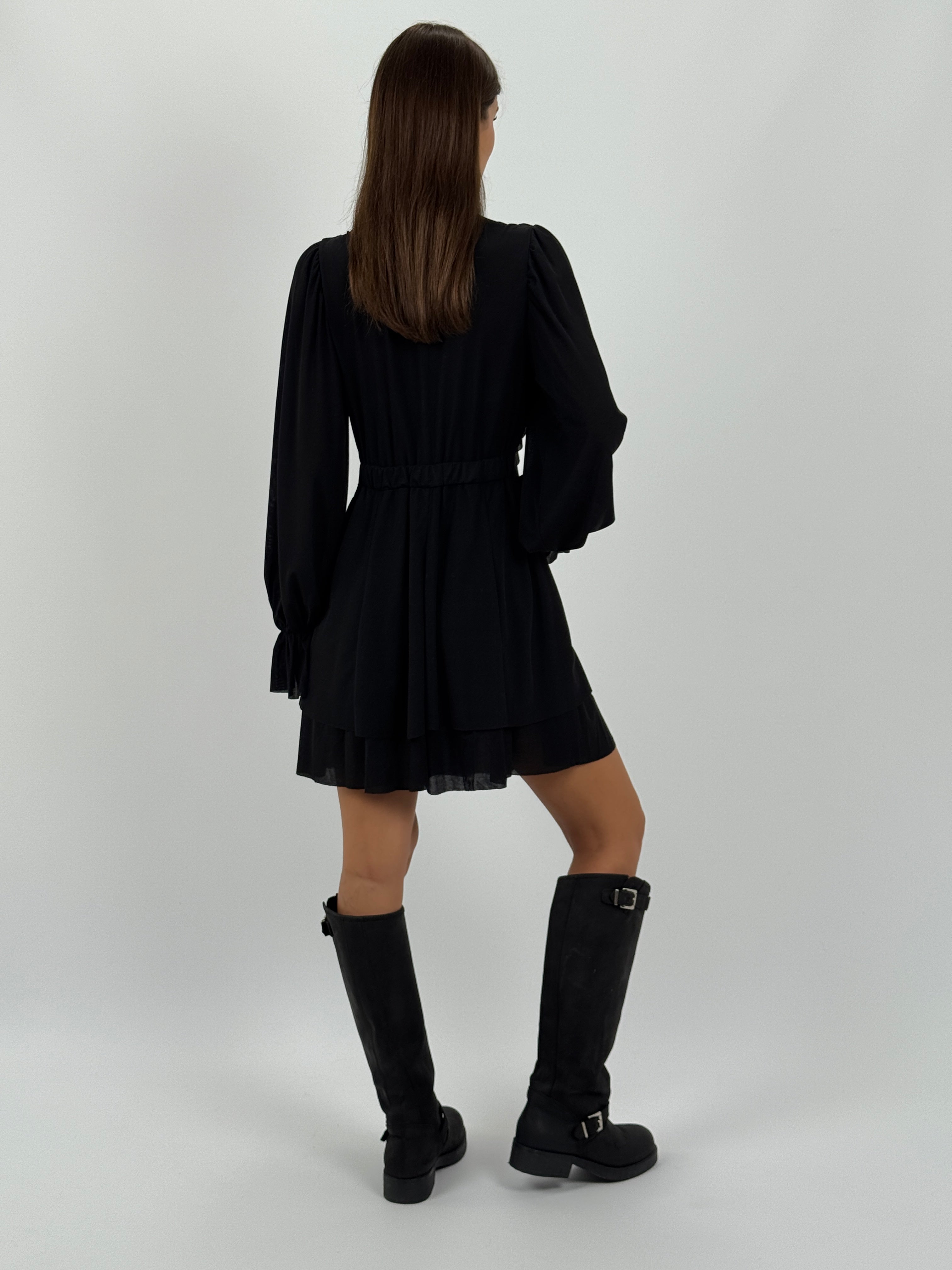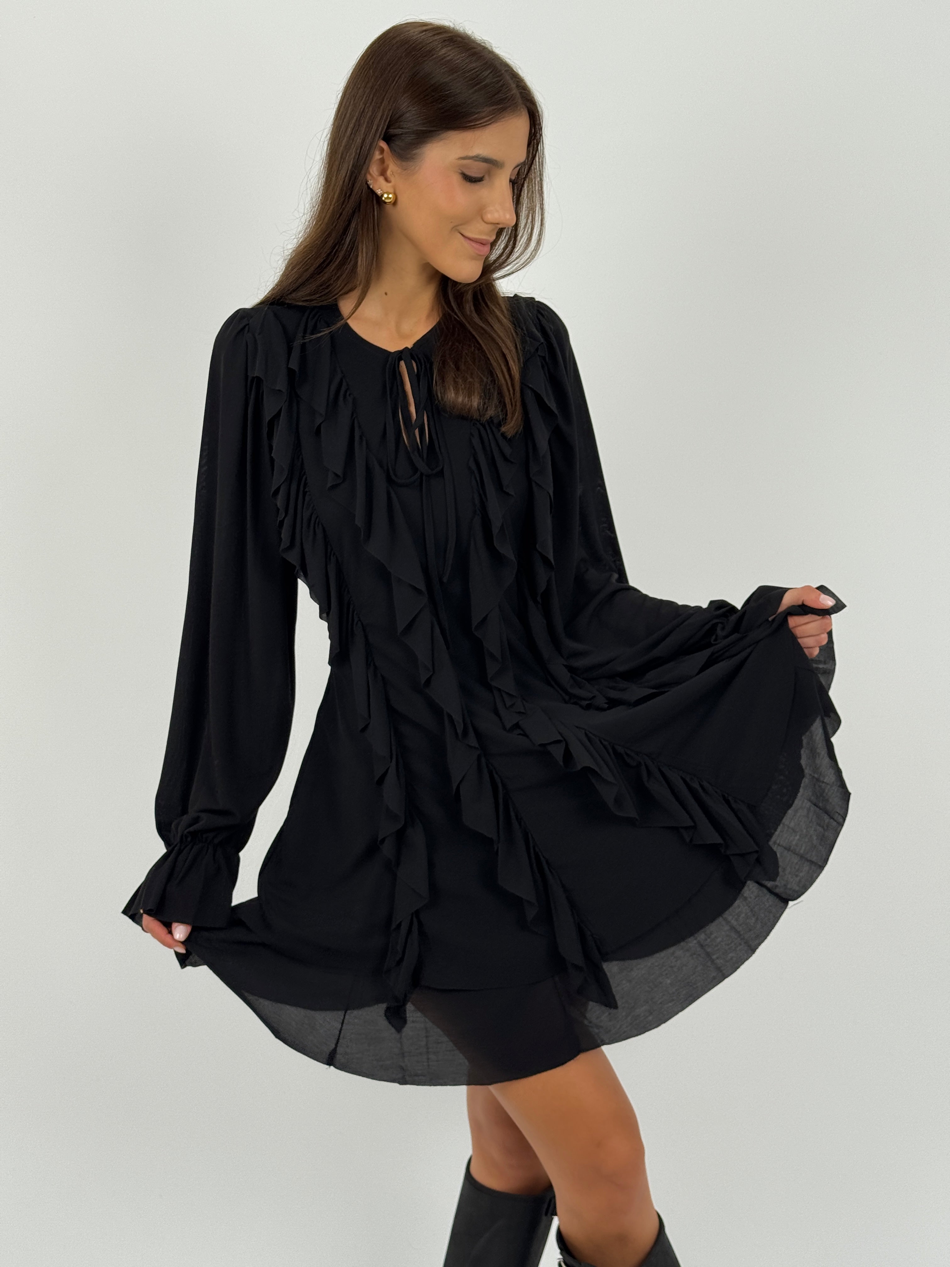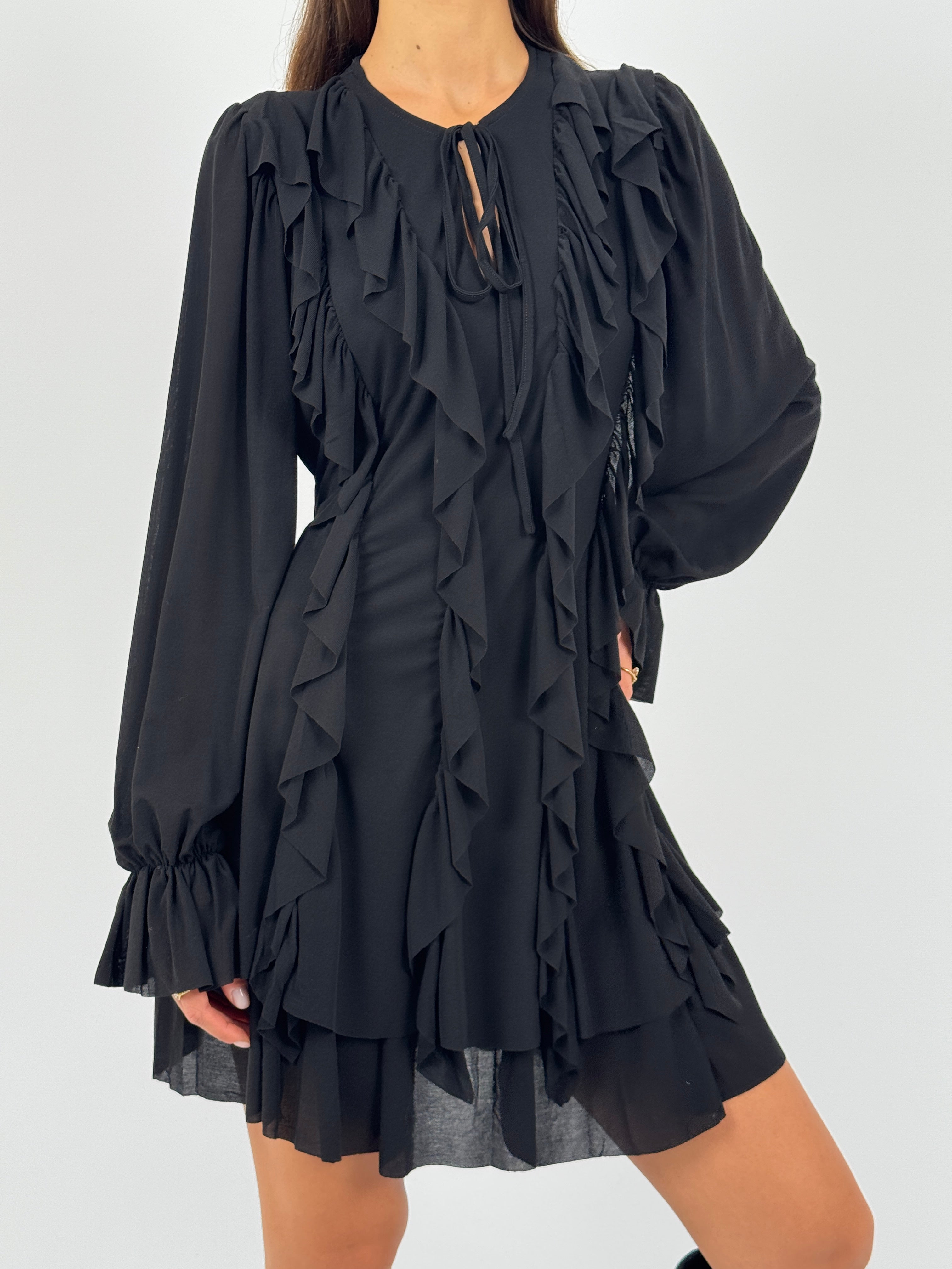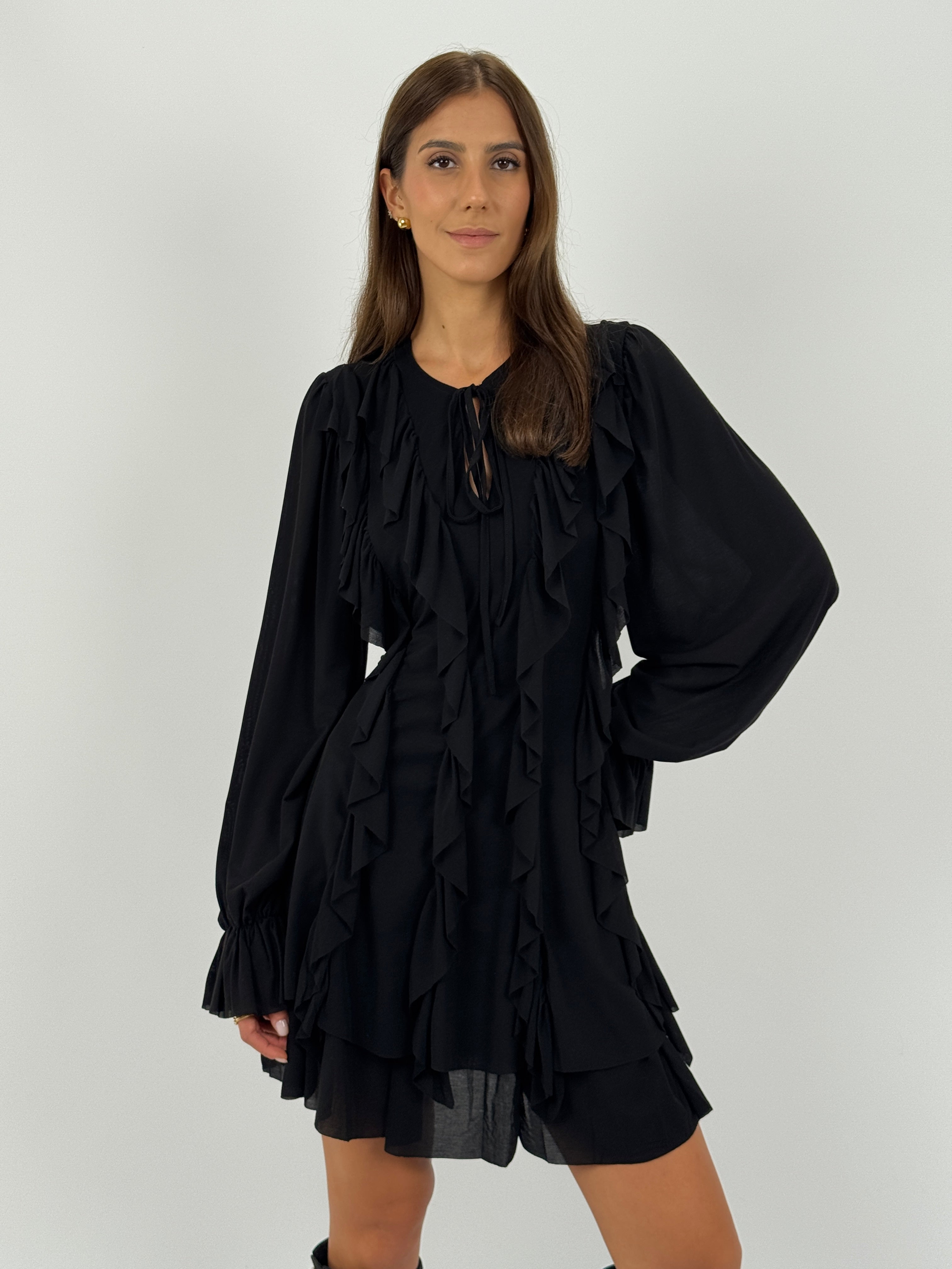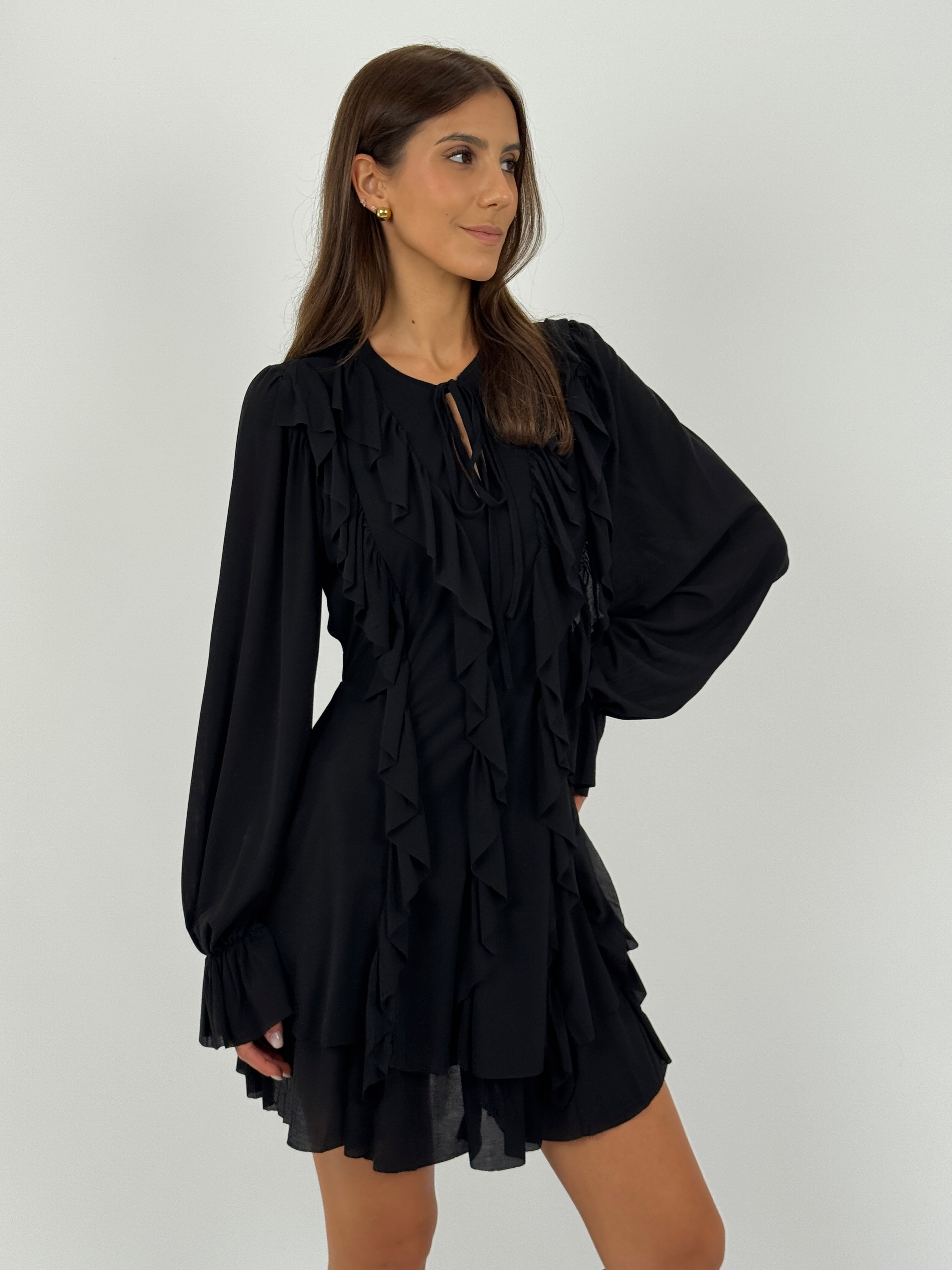 Abito corto nero con maniche lunghe, volant frontali e laccetto sul collo. Elastico sul retro in vita per una vestibilità comoda e femminile.