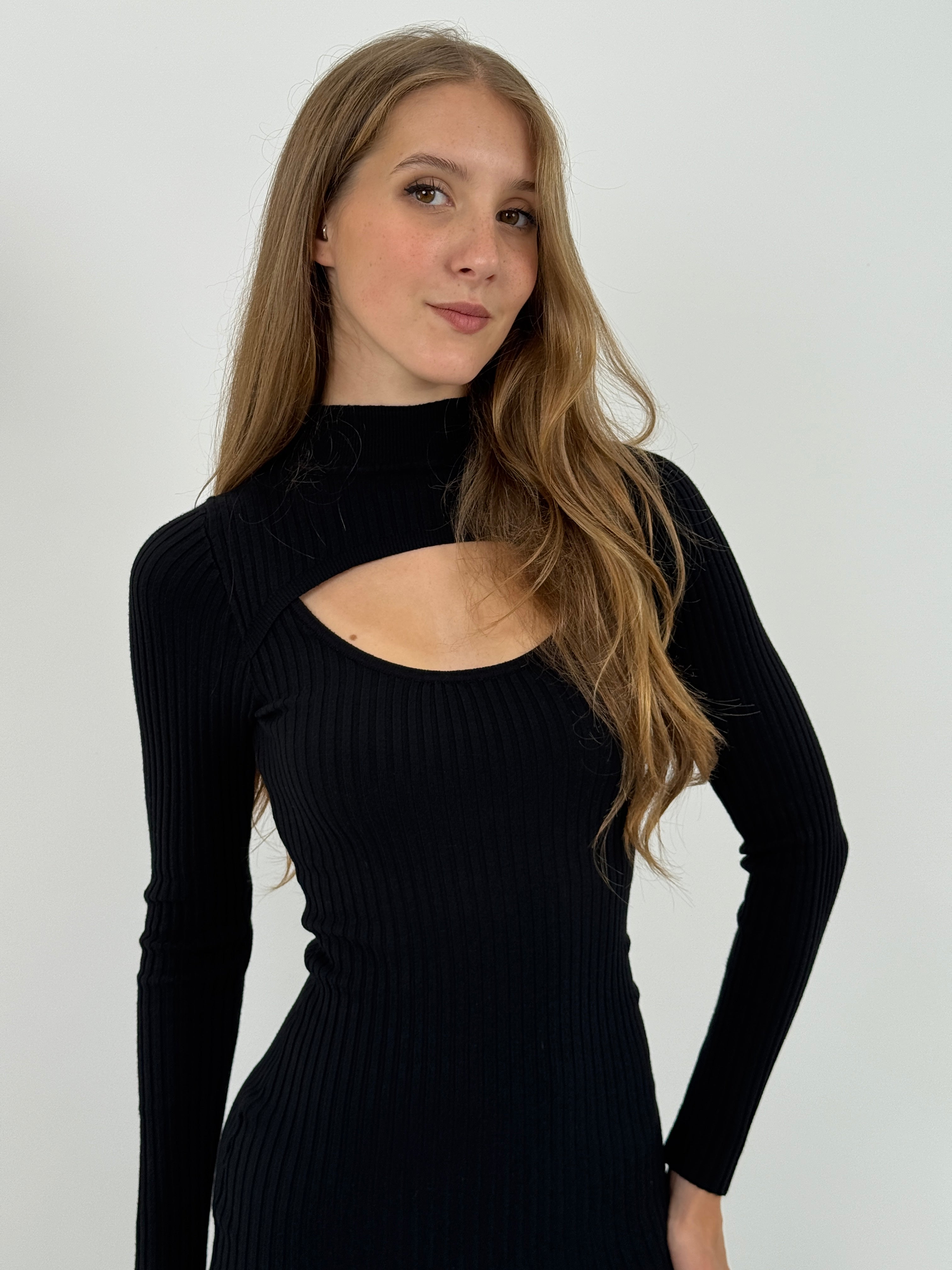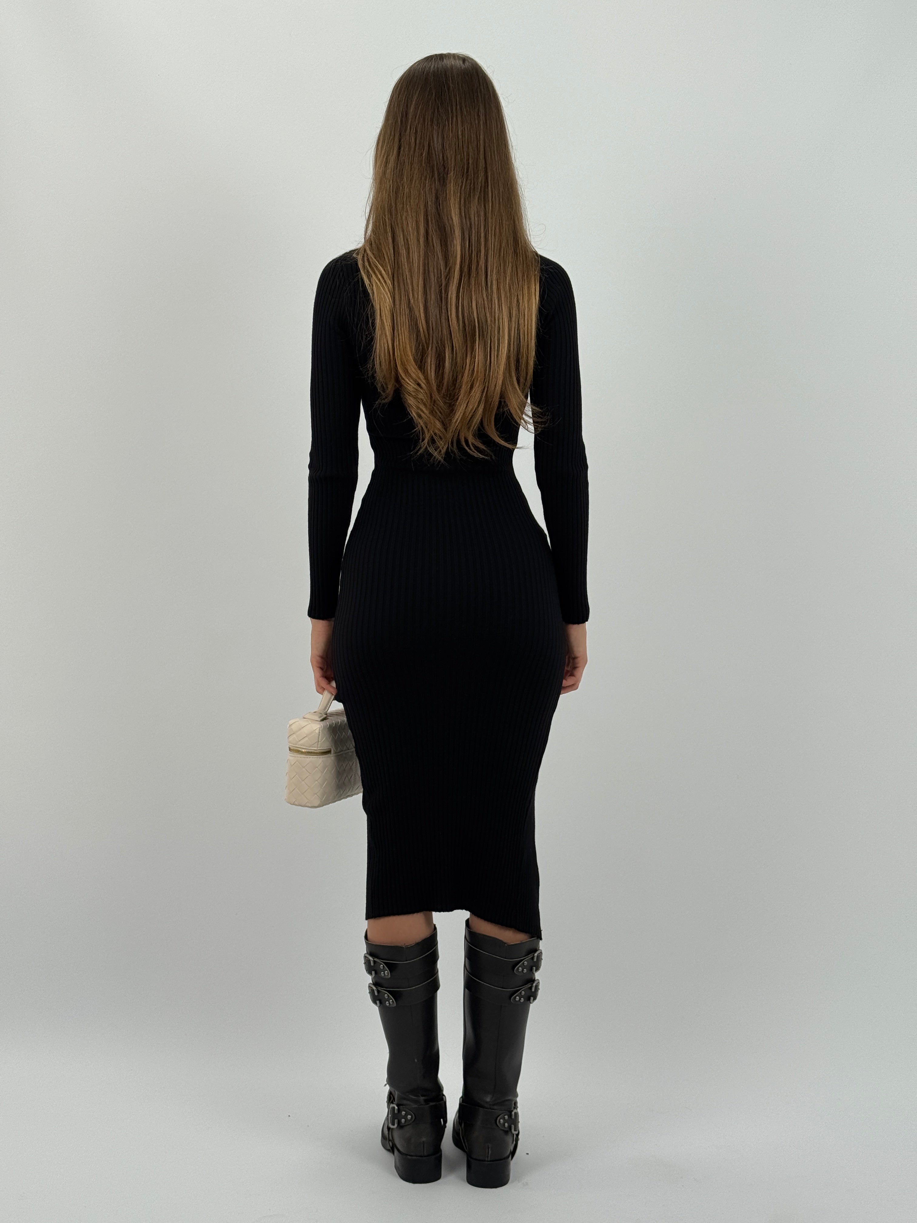 Abito midi nero in maglia a costine con maniche lunghe, tessuto morbido, cut out frontale e spacco laterale