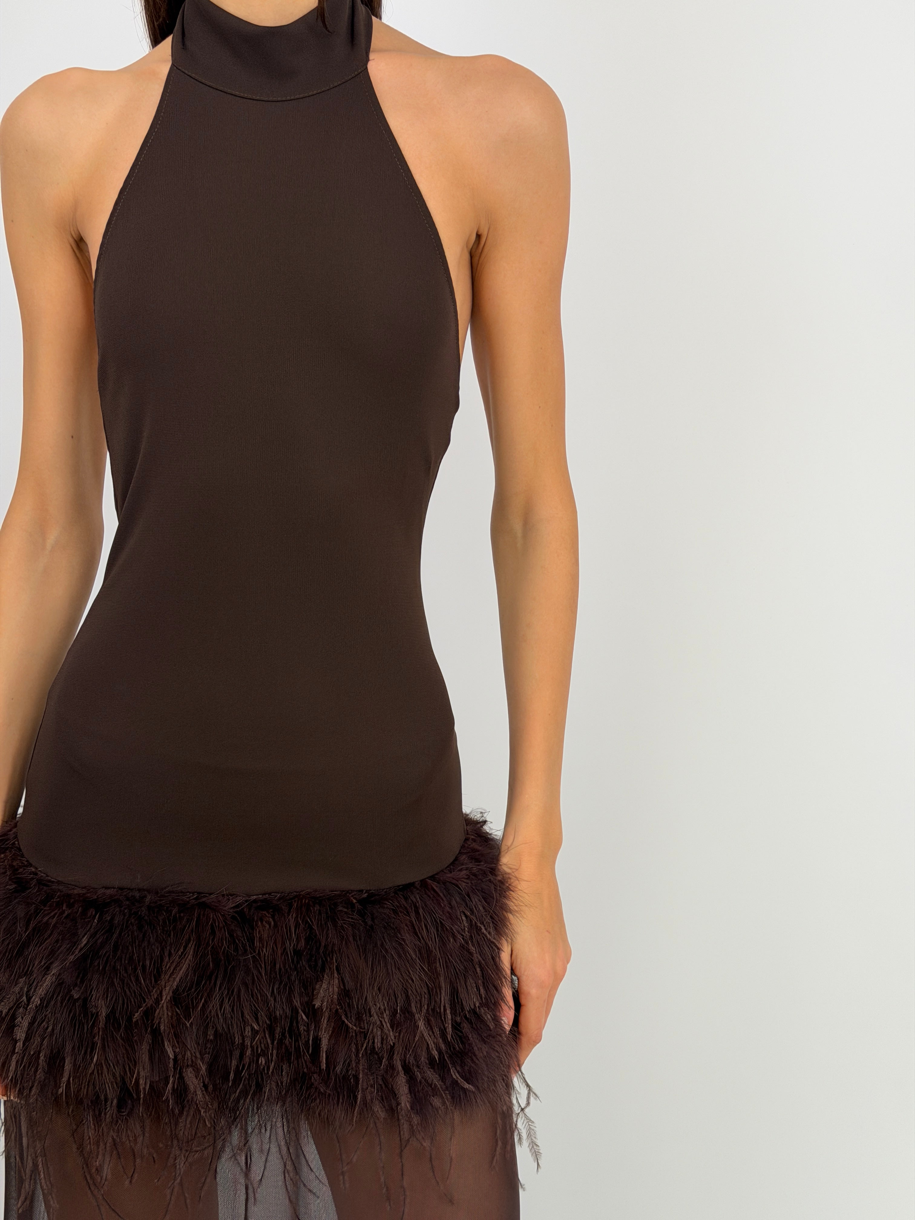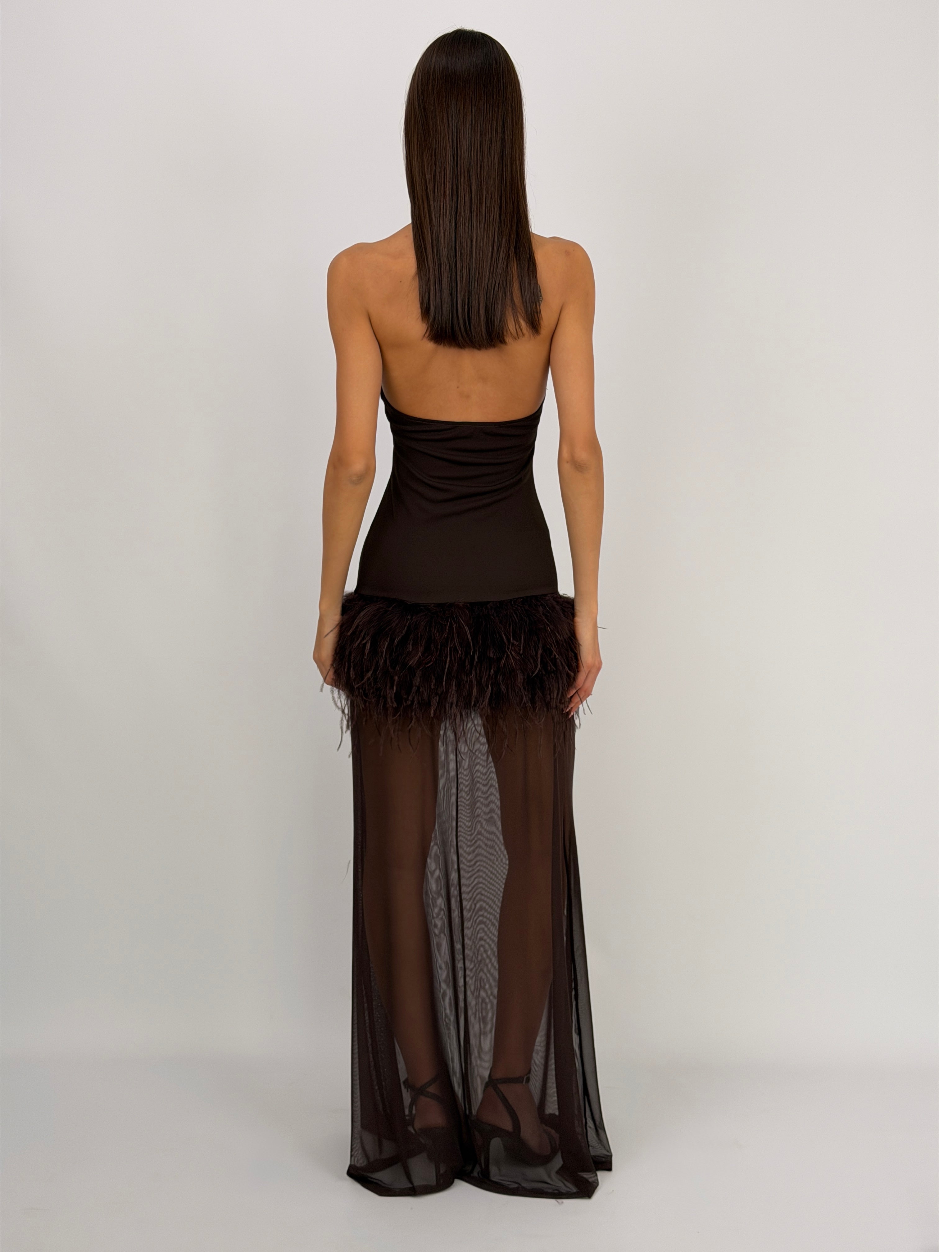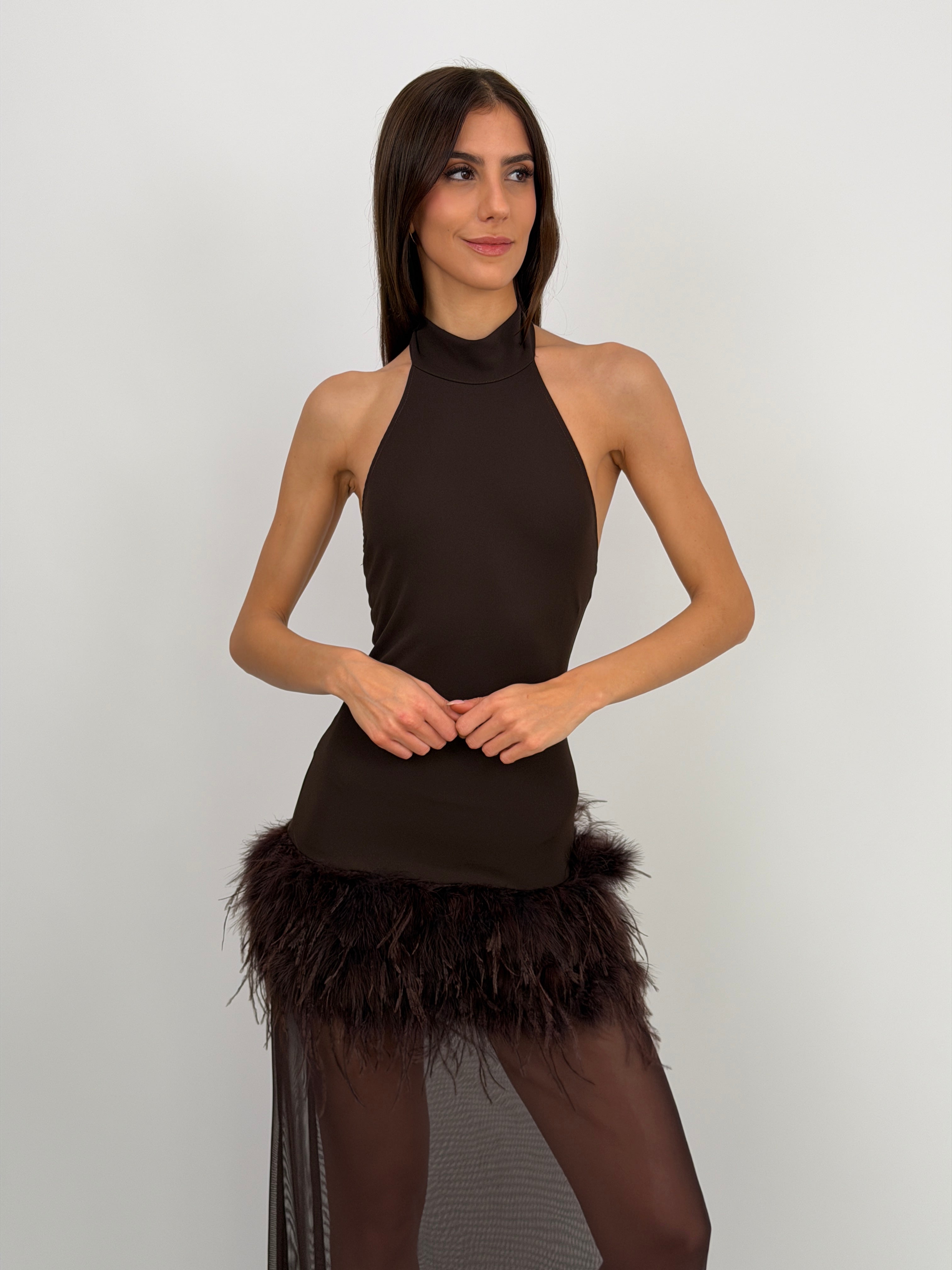 Abito lungo marrone con collo halter, tessuto elasticizzato e gonna in tulle con body, applicazioni di piume tono su tono e chiusura con bottoncini