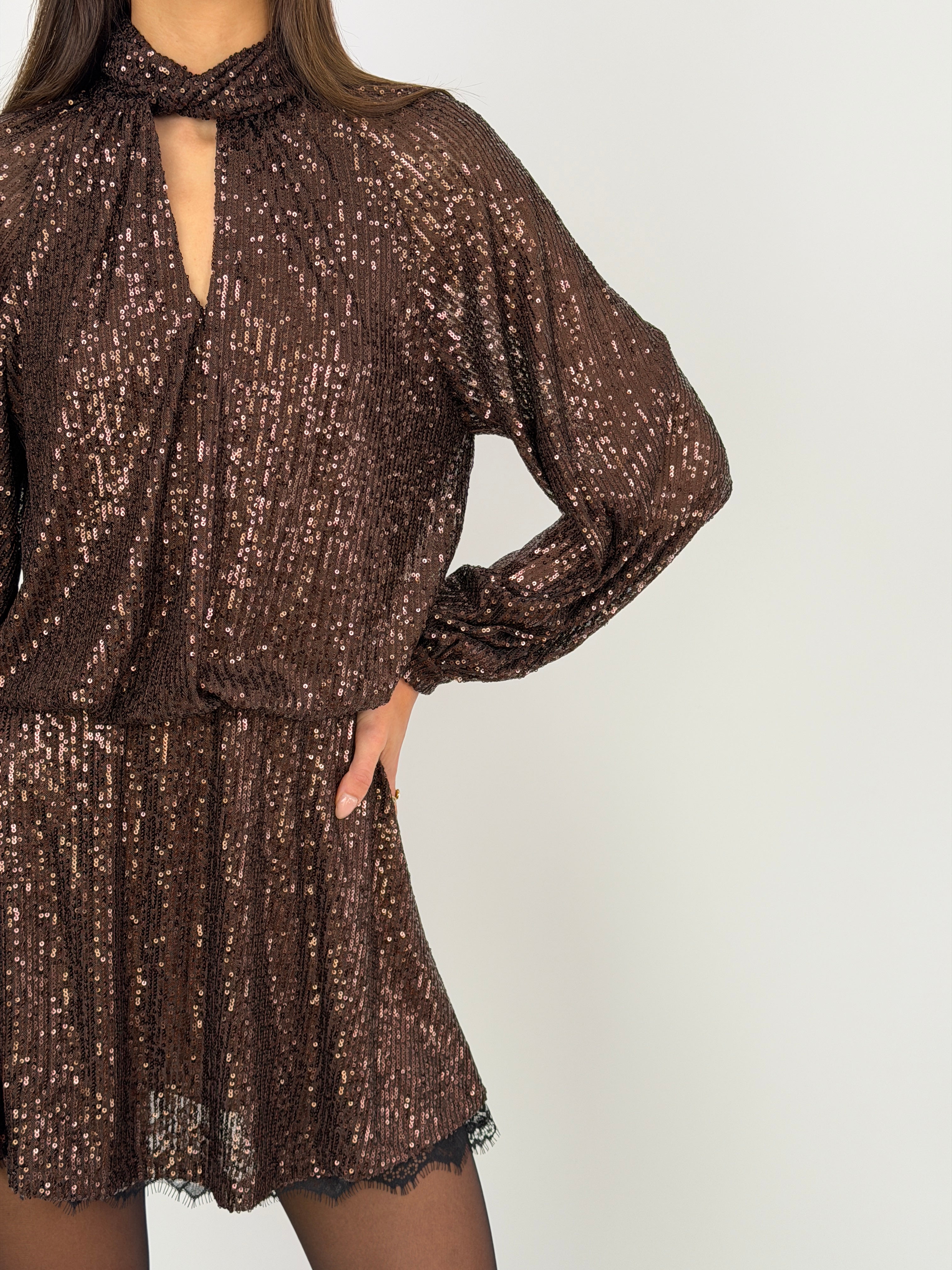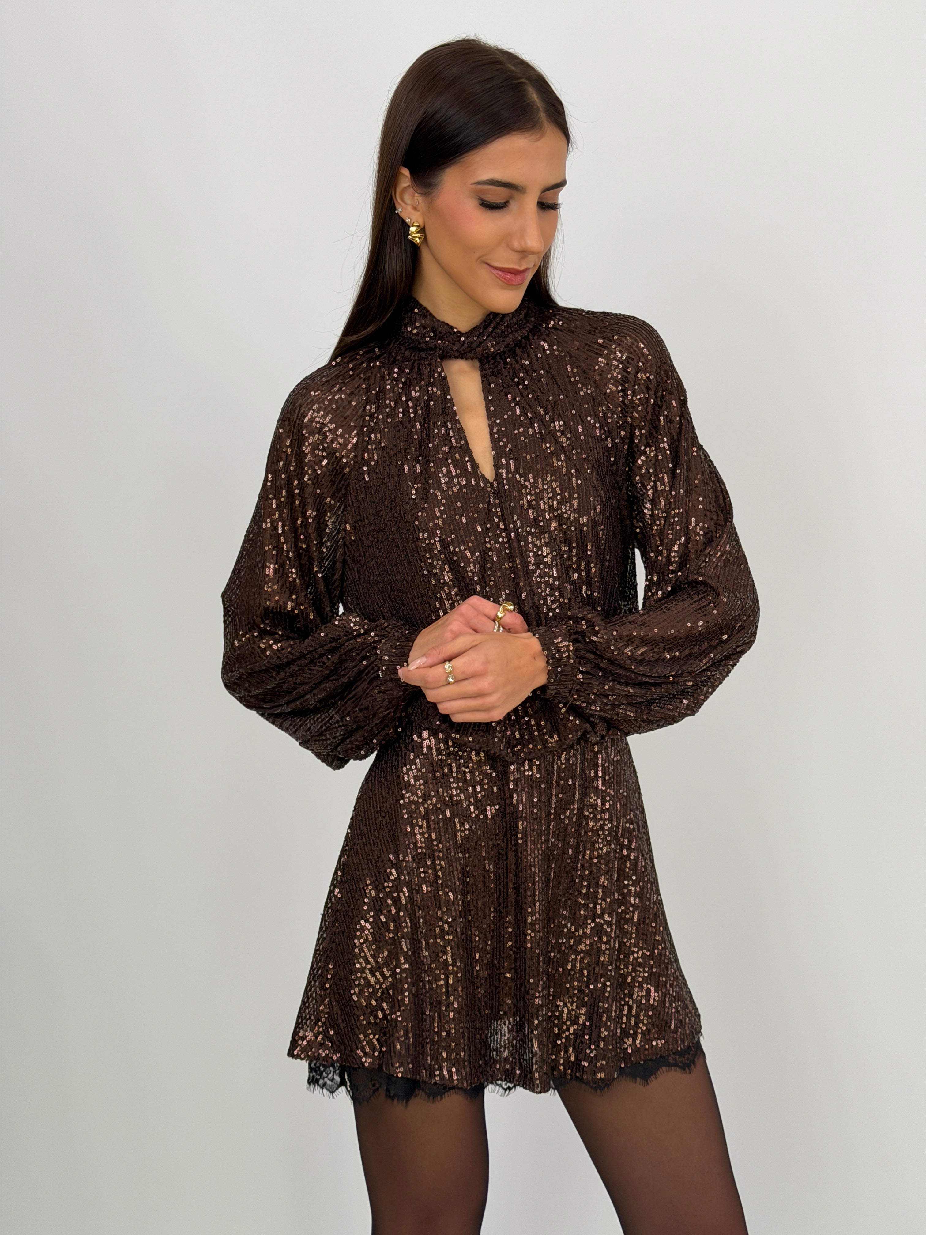 Abito Lumina corto marrone con maniche lunghe, paillettes, bordo in pizzo sul fondo e cut out a goccia sul davanti