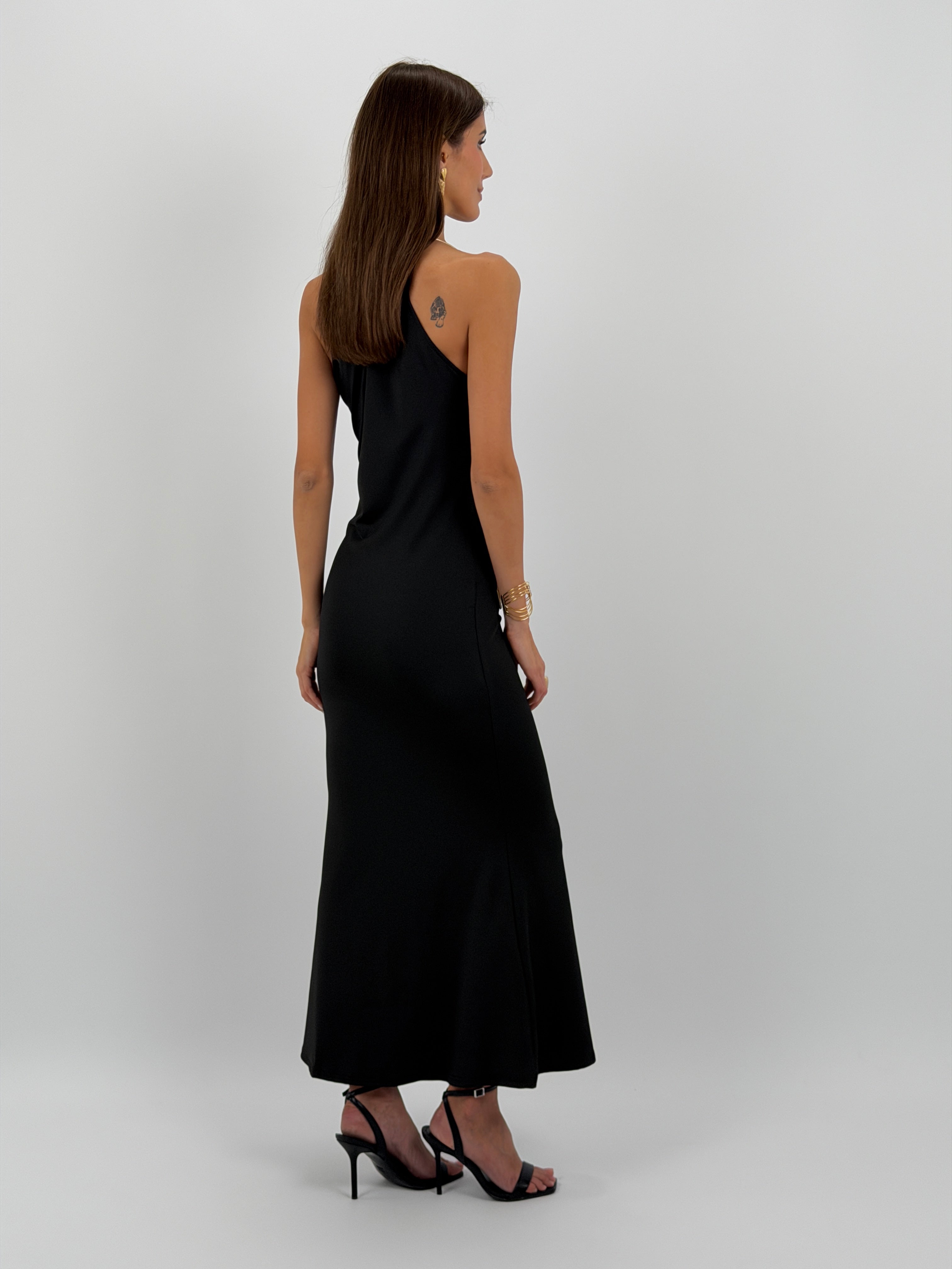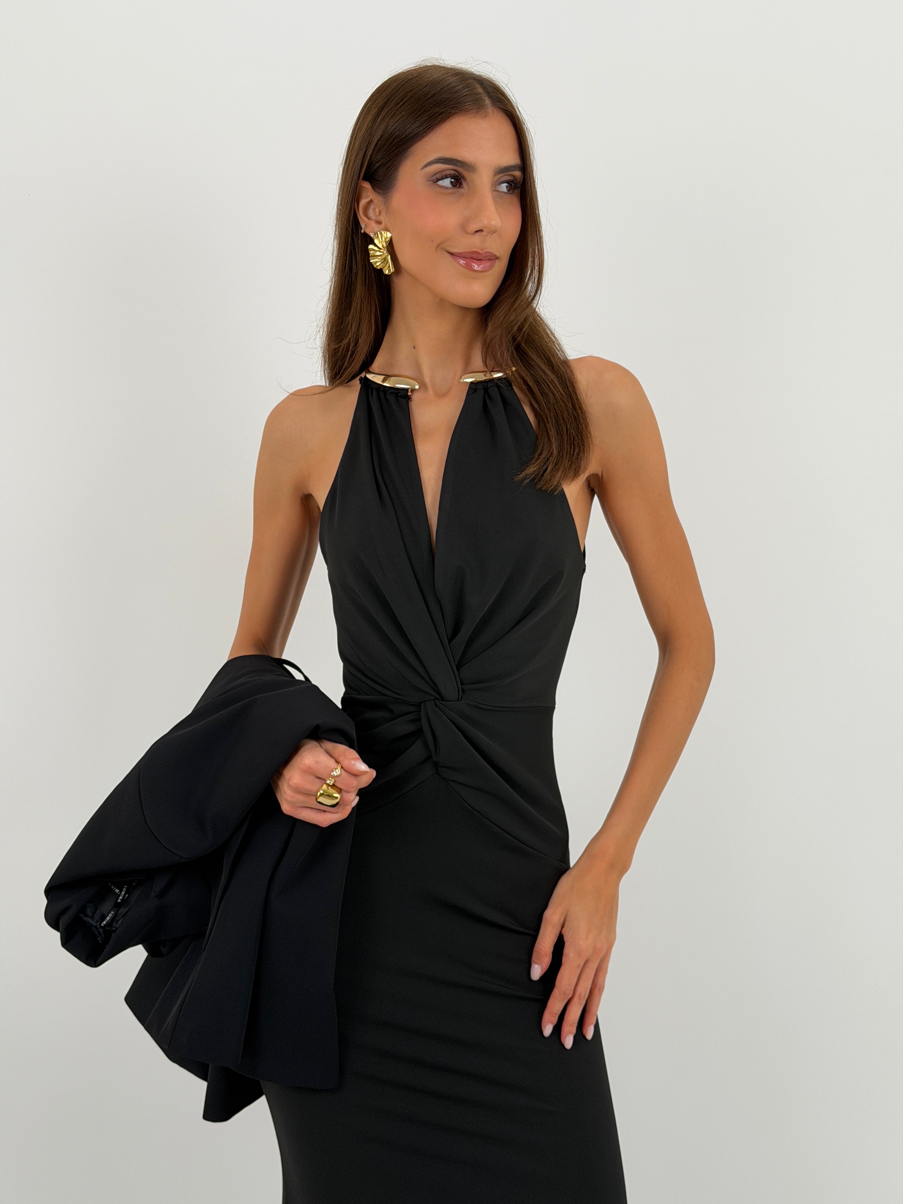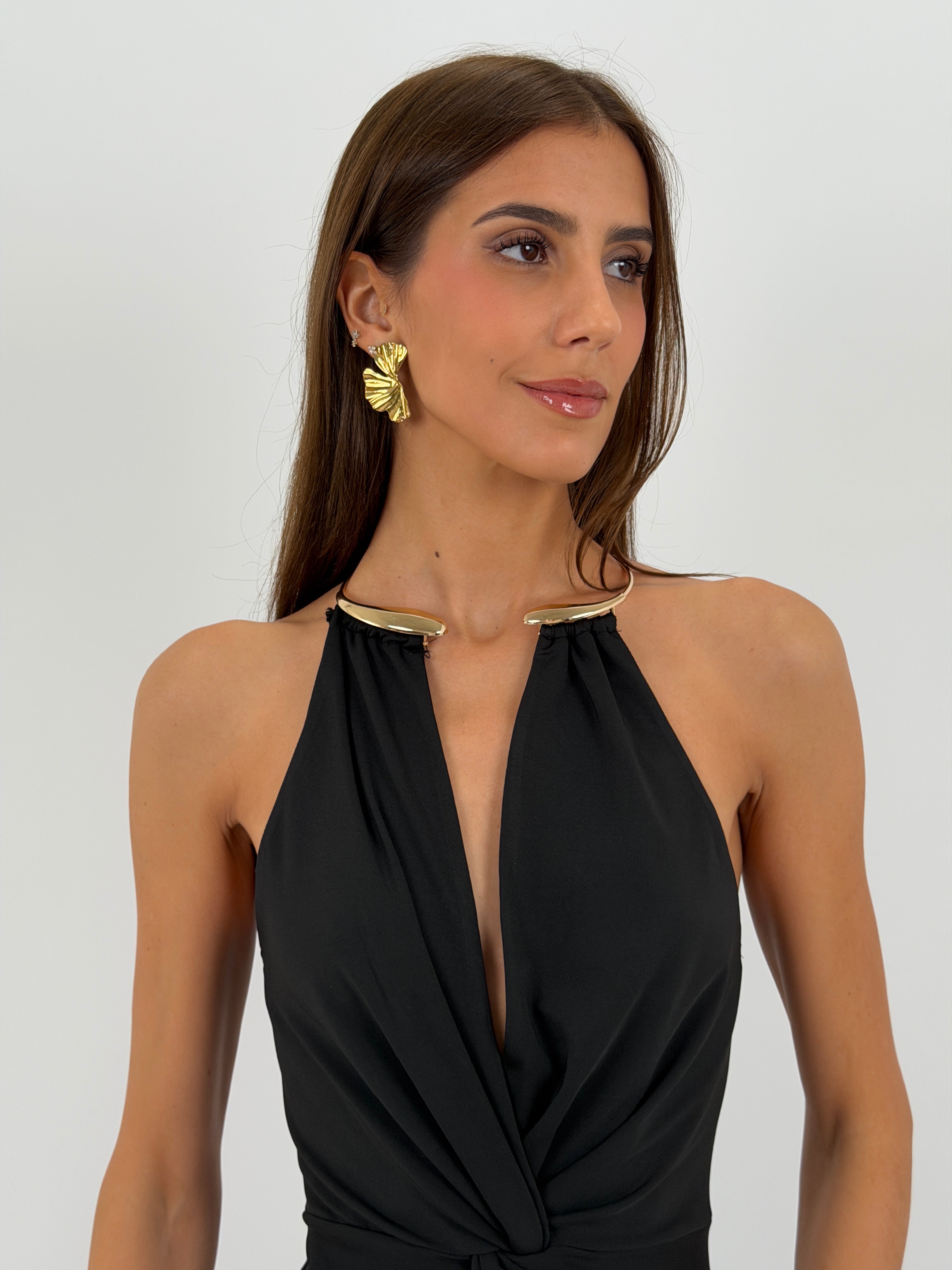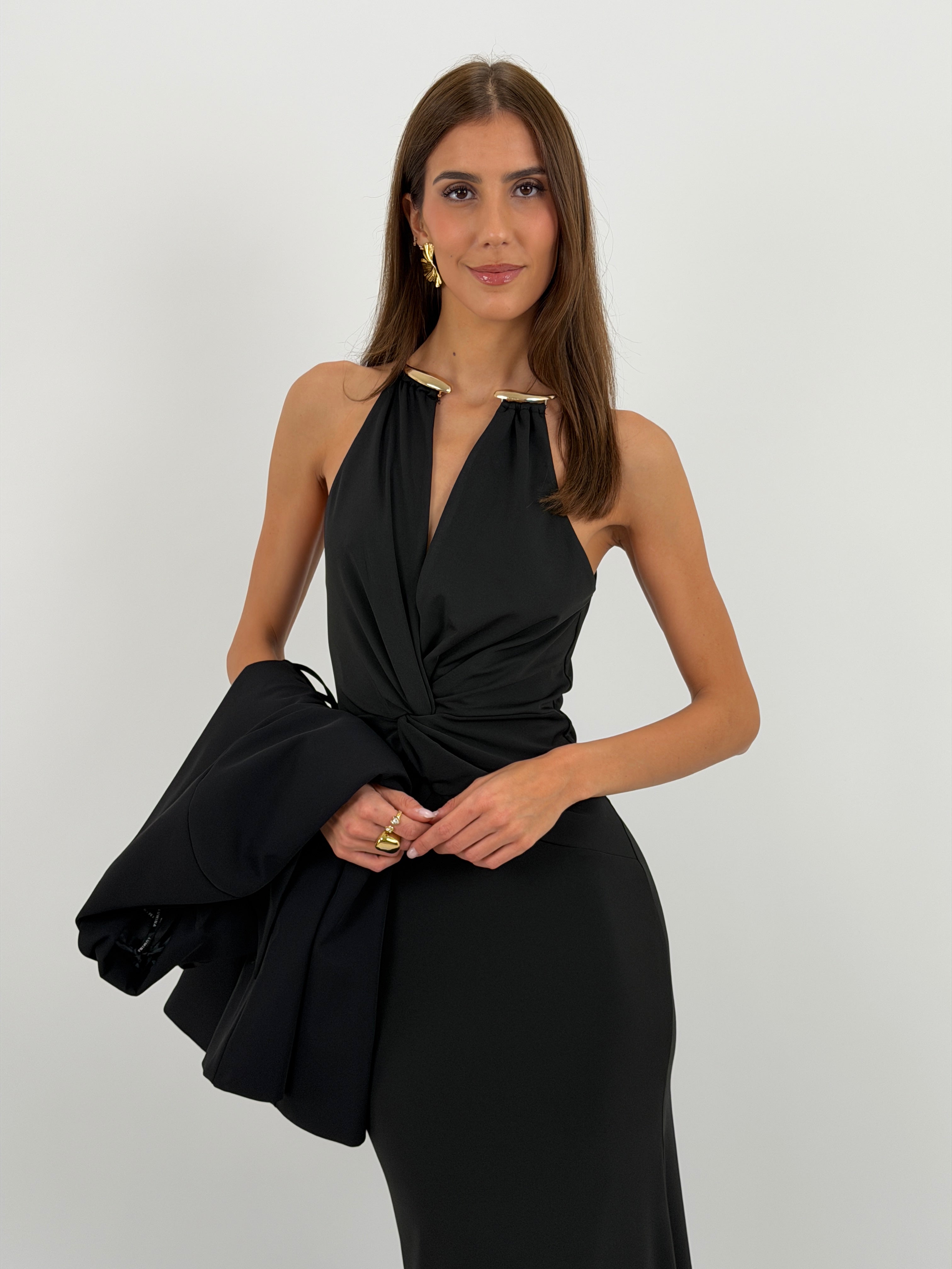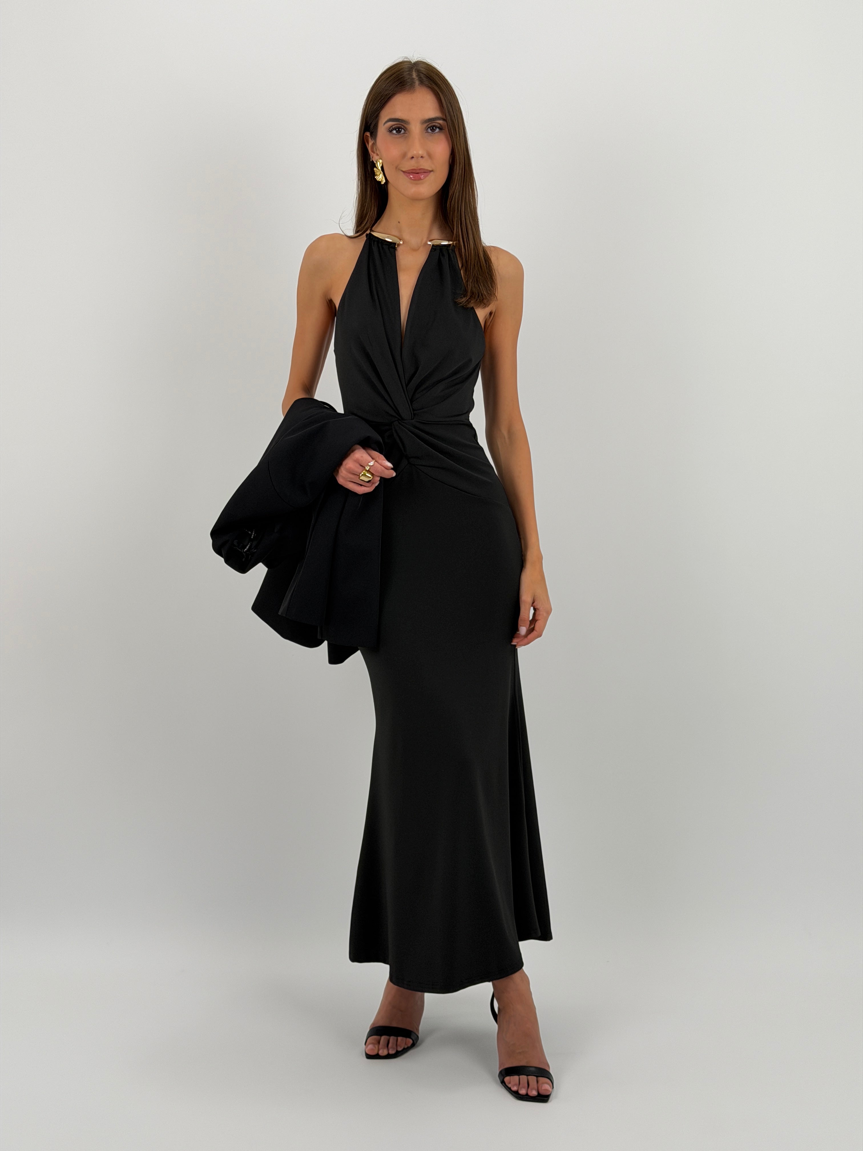Abito lungo nero in tessuto elasticizzato con collo halter e choker metallico, scollo drappeggiato, arricciature e applicazione gioiello.