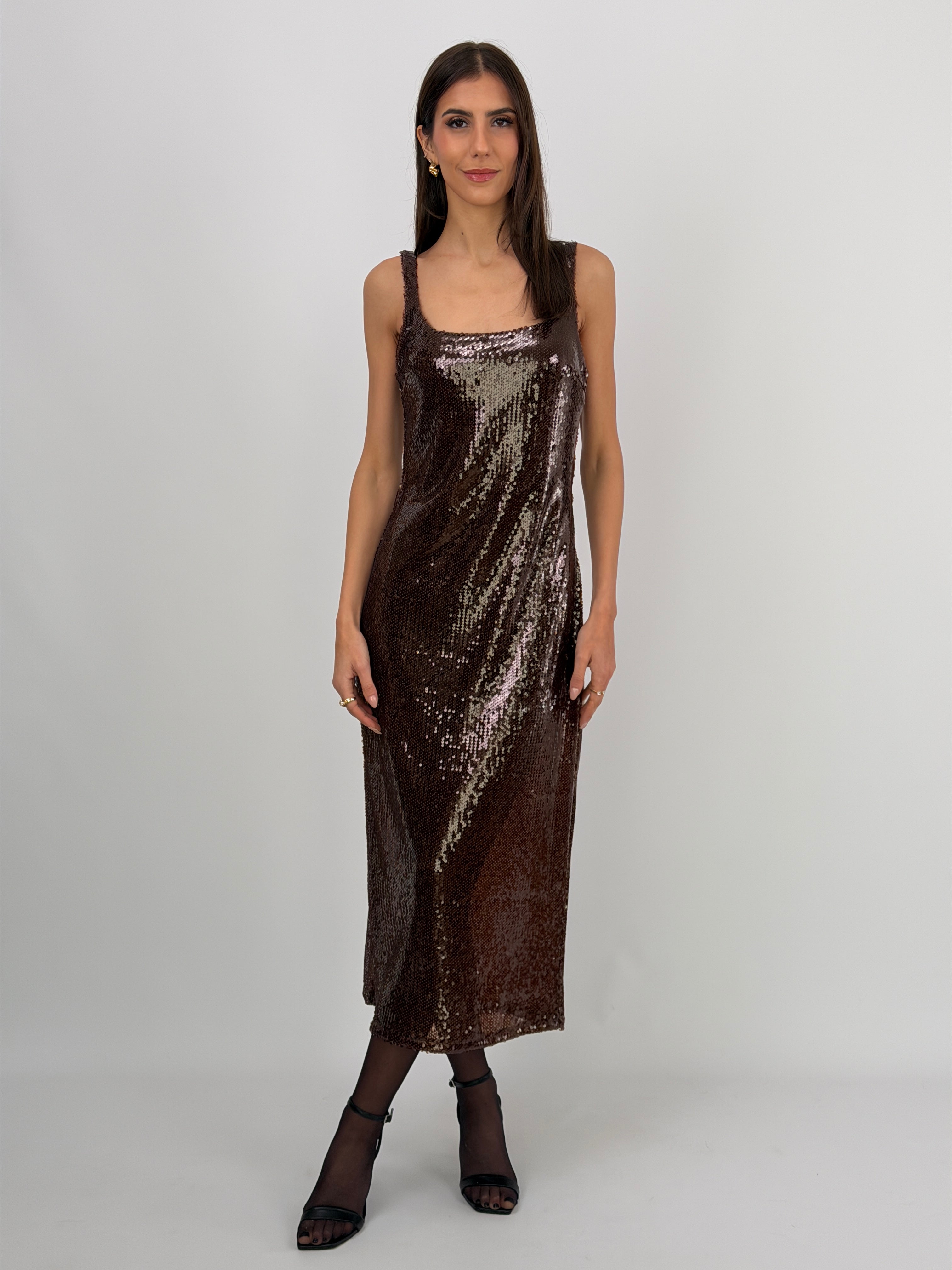 Abito Lumina lungo marrone a tubino con paillettes tono su tono, chiusura con zip laterale e spacco sul retro.