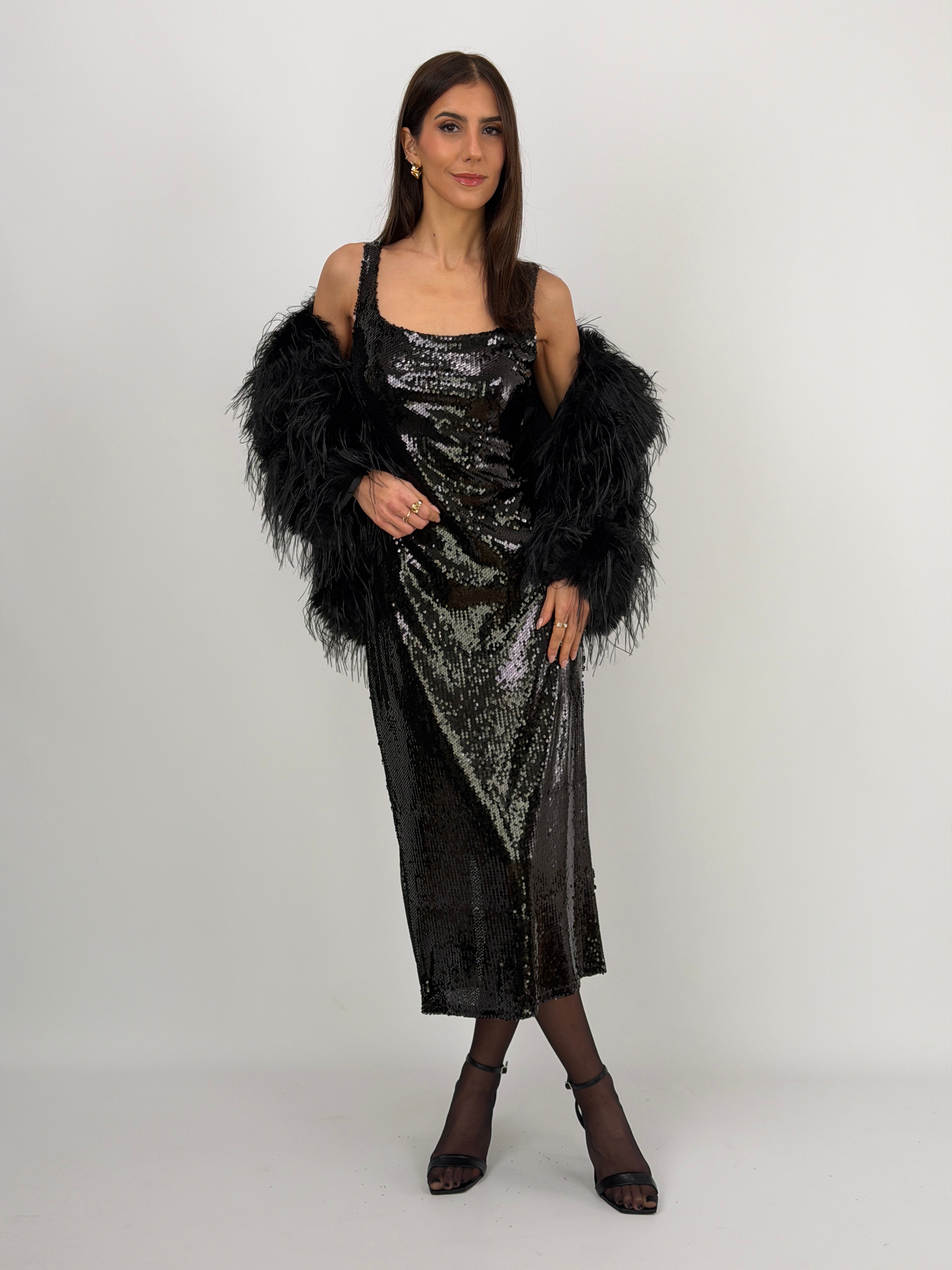 Abito Lumina lungo nero a tubino con paillettes tono su tono, chiusura con zip laterale e spacco sul retro.