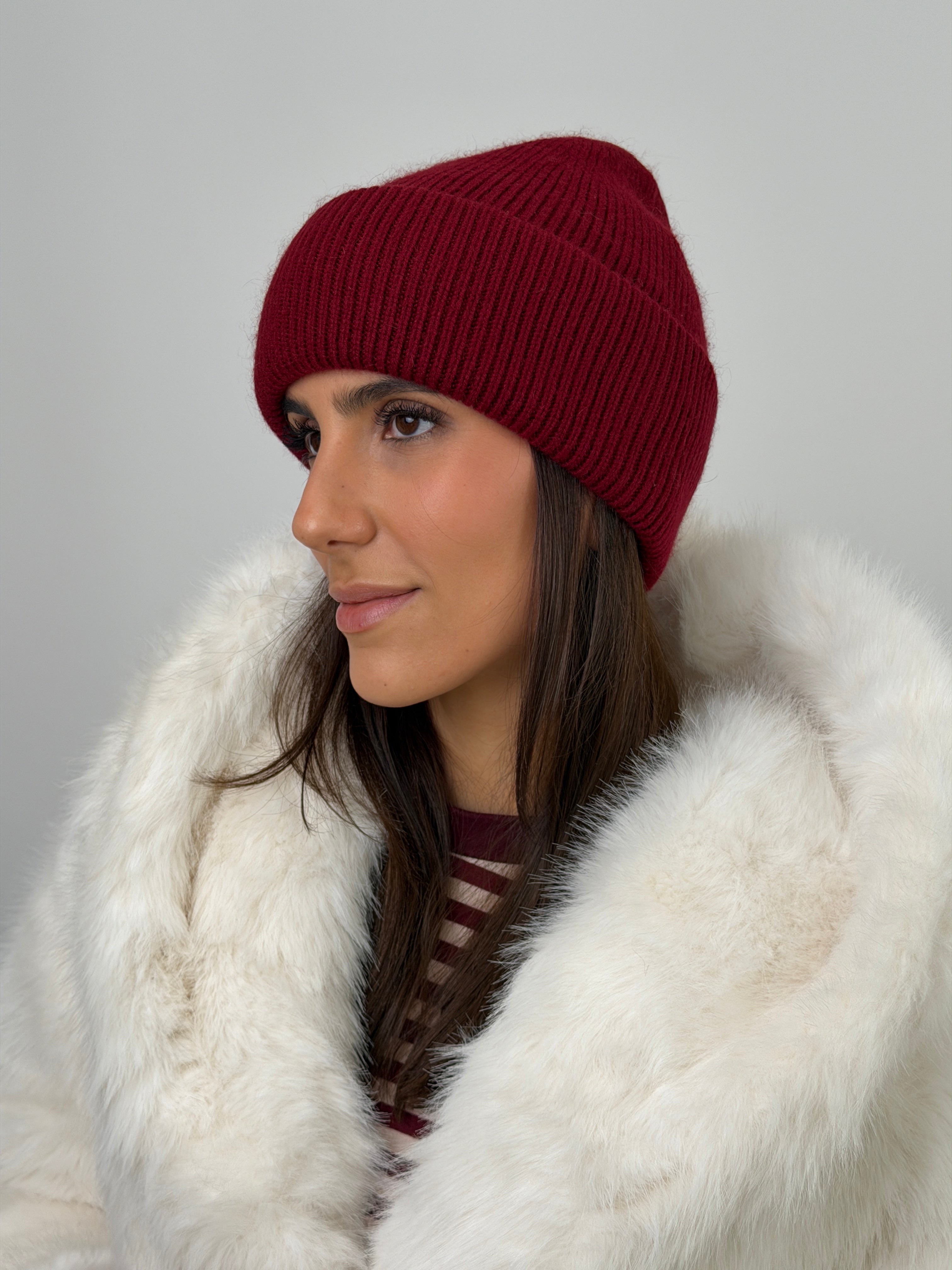 Berretto beanie bordeaux in caldo tessuto a costine con cashmere e fascia regolabile