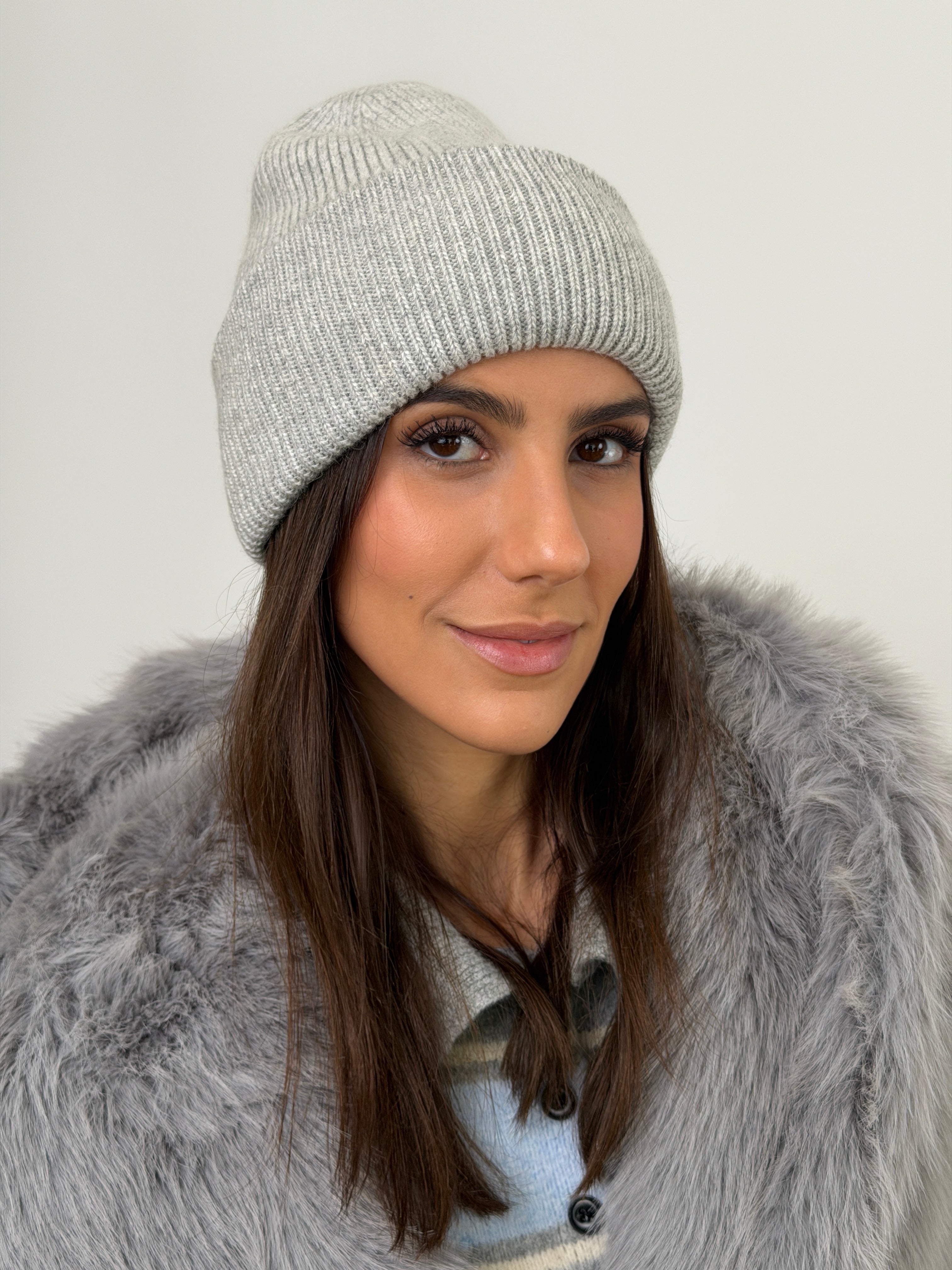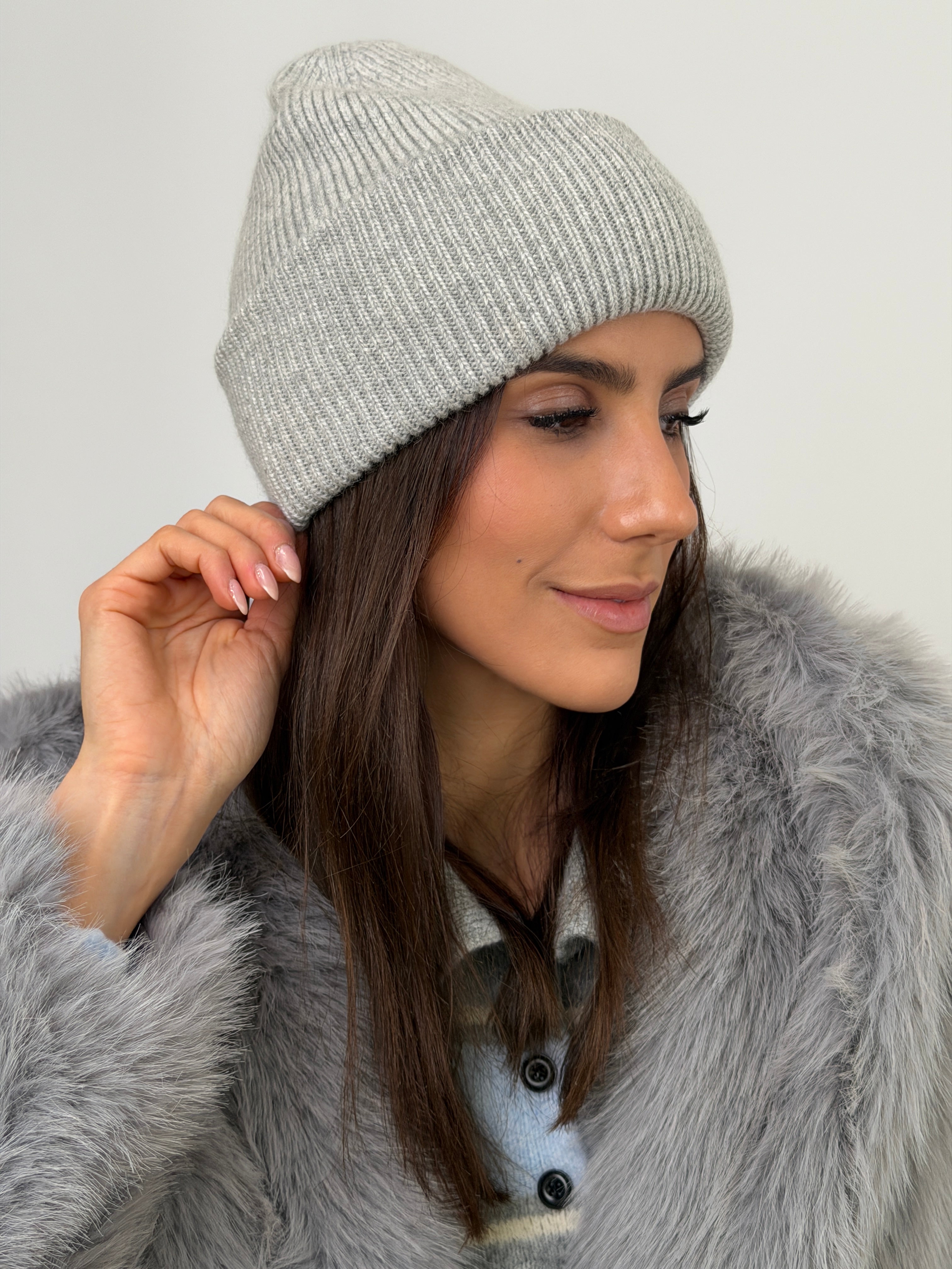 Berretto beanie grigio chiaro in caldo tessuto a costine con cashmere e fascia regolabile