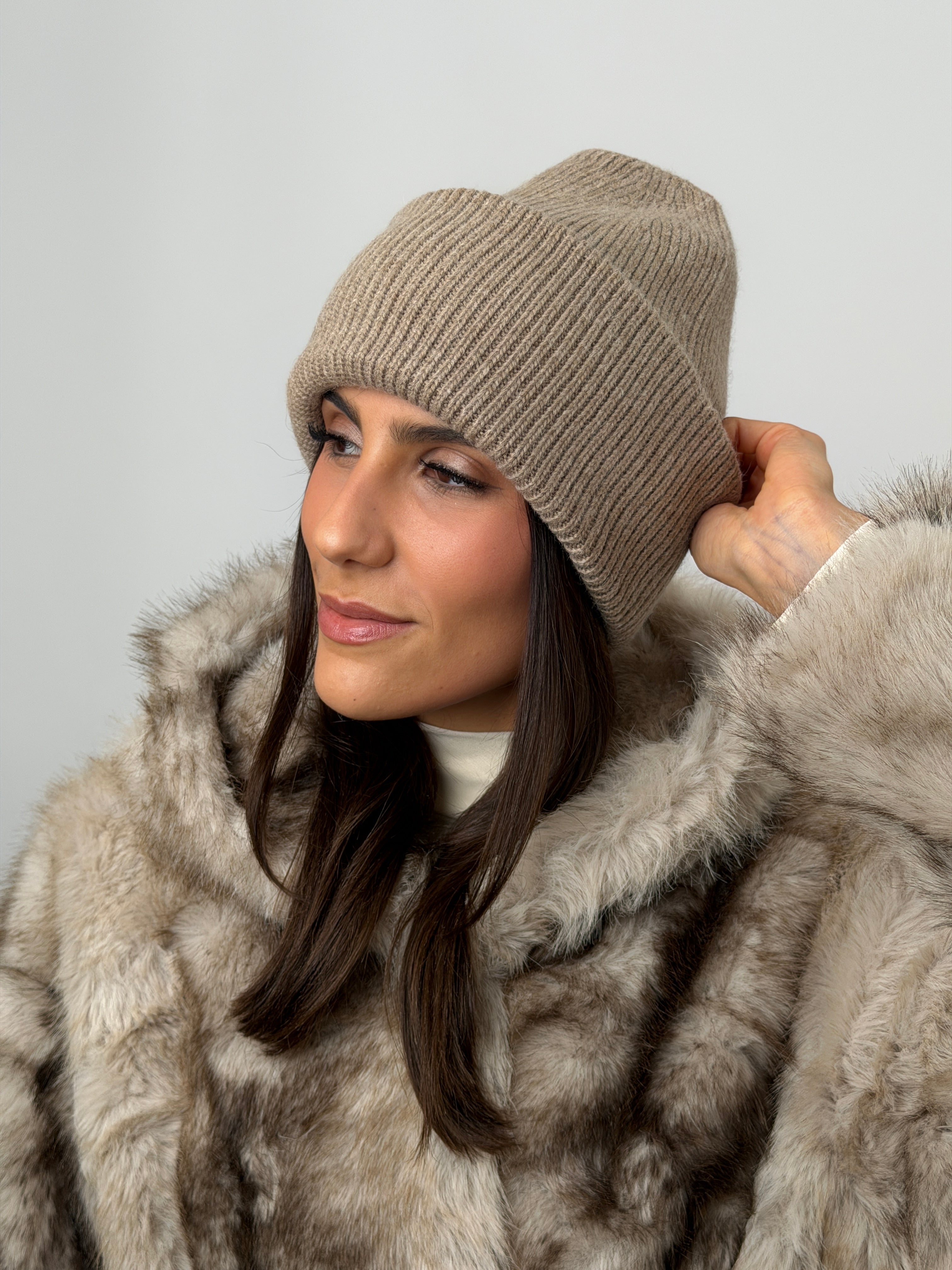 Berretto beanie sabbia in caldo tessuto a costine con cashmere e fascia regolabile
