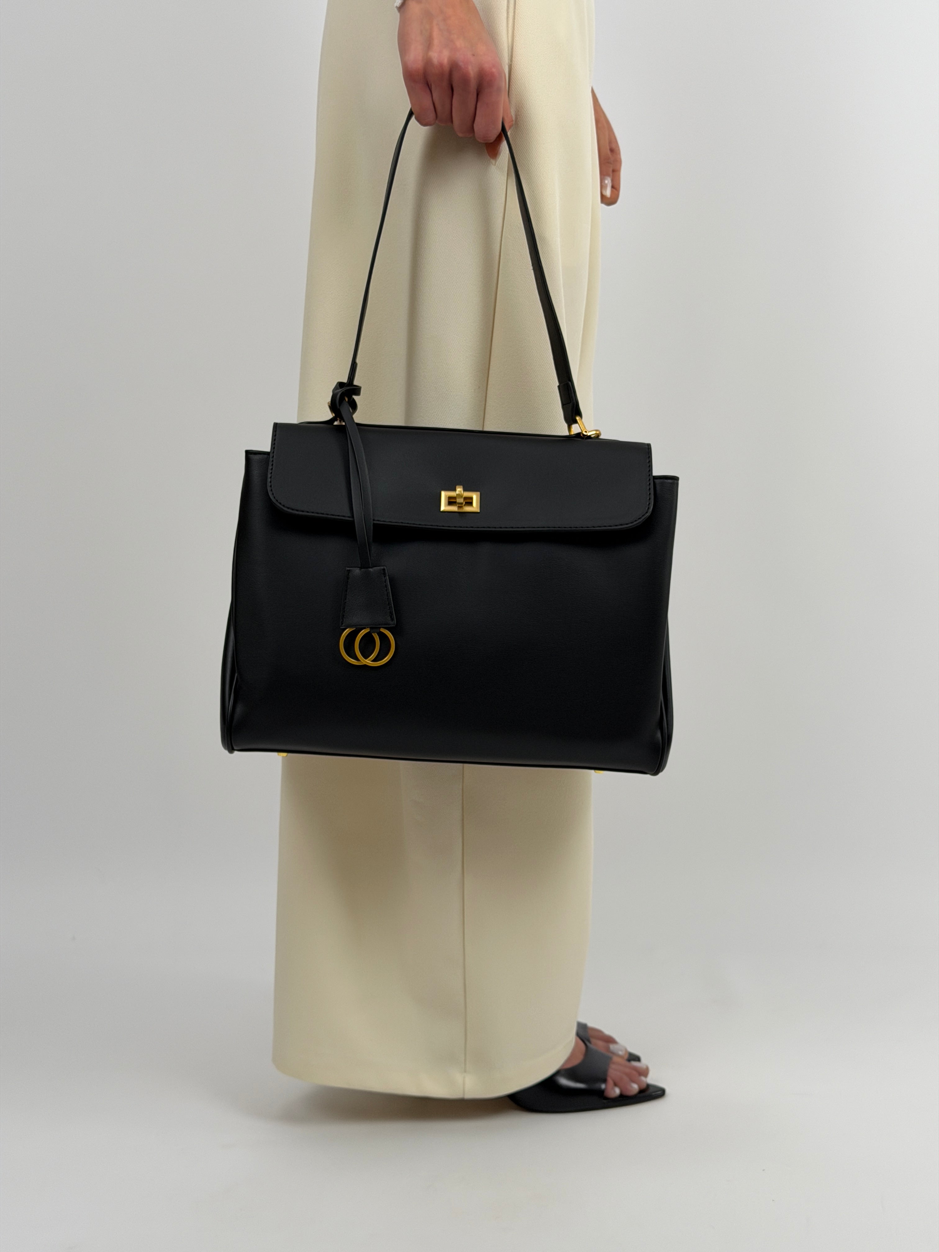 Borsa nera in pelle vegana con doppio scomparto con chiusura, manico e tracolla rimovibile. Tasca interna con zip, due tasche piatte sul retro. Spessore espandibile tramite bottoncini a pressione sui lati.