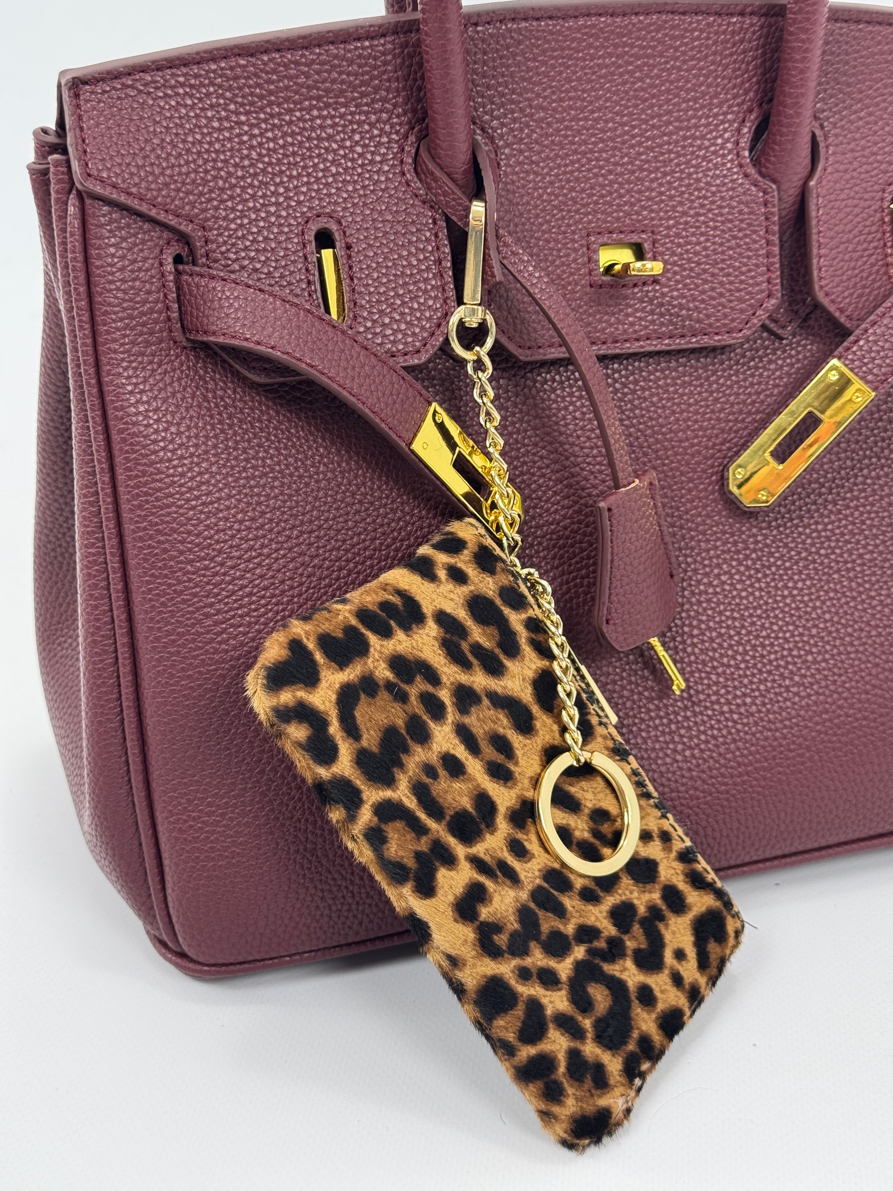 Mini pochette con motivo leopardato in cavallino con portamonete, portachiavi e ganci per aggancio interno o esterno alle borse, pratica e versatile.