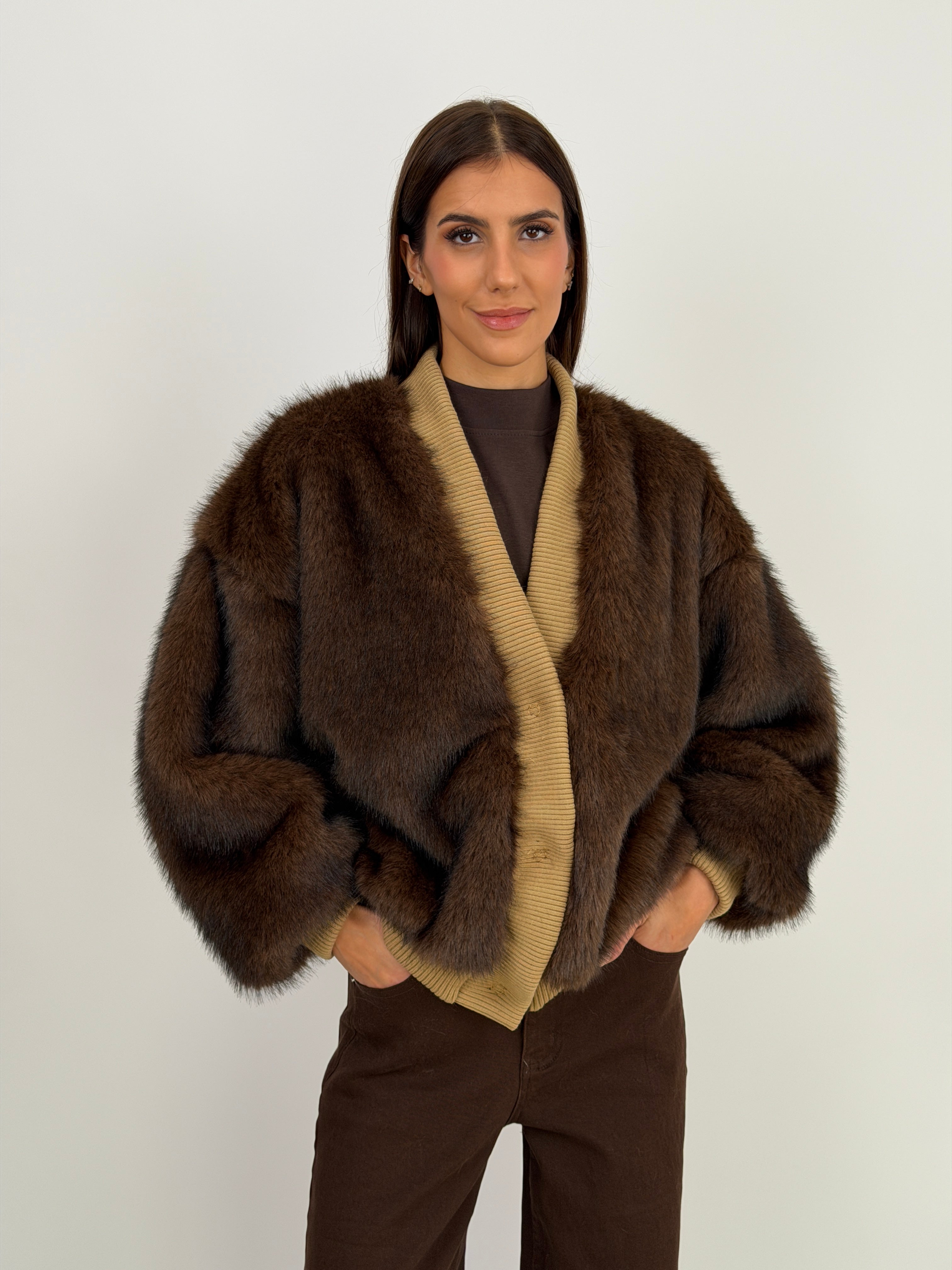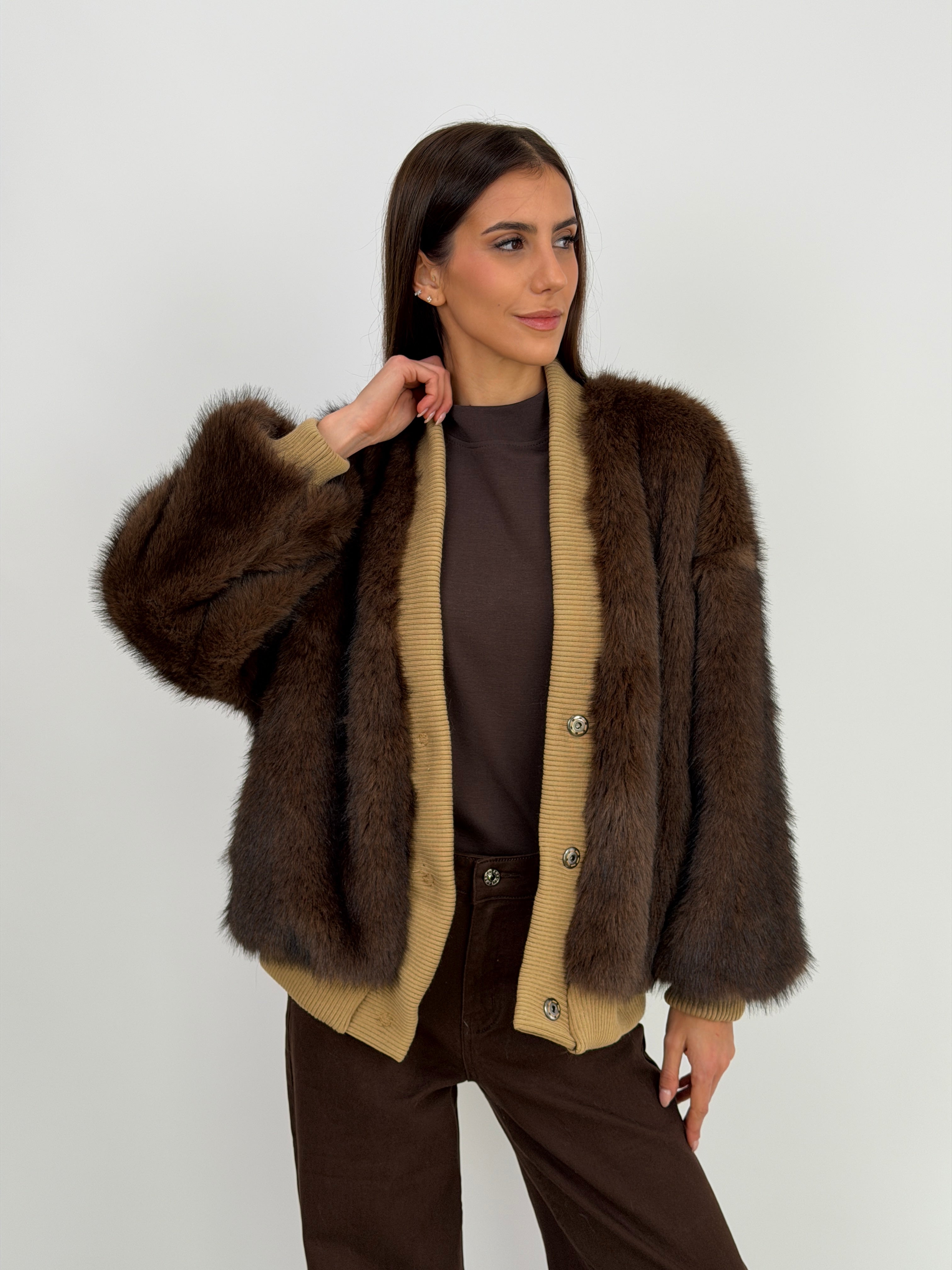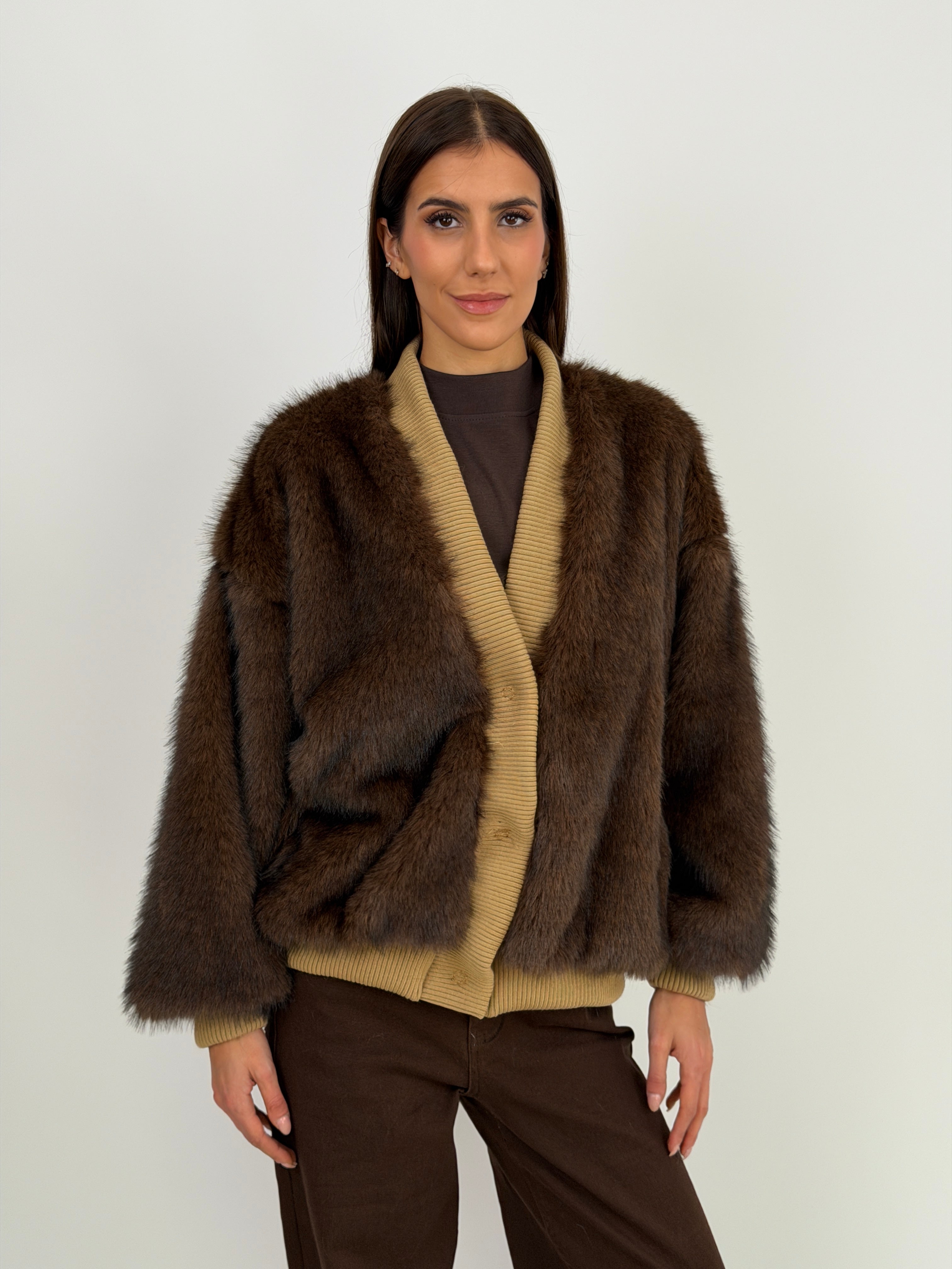 Giaccone in eco pelliccia marrone con taglio a giacca senza collo, bordi elasticizzati e chiusura con bottoni