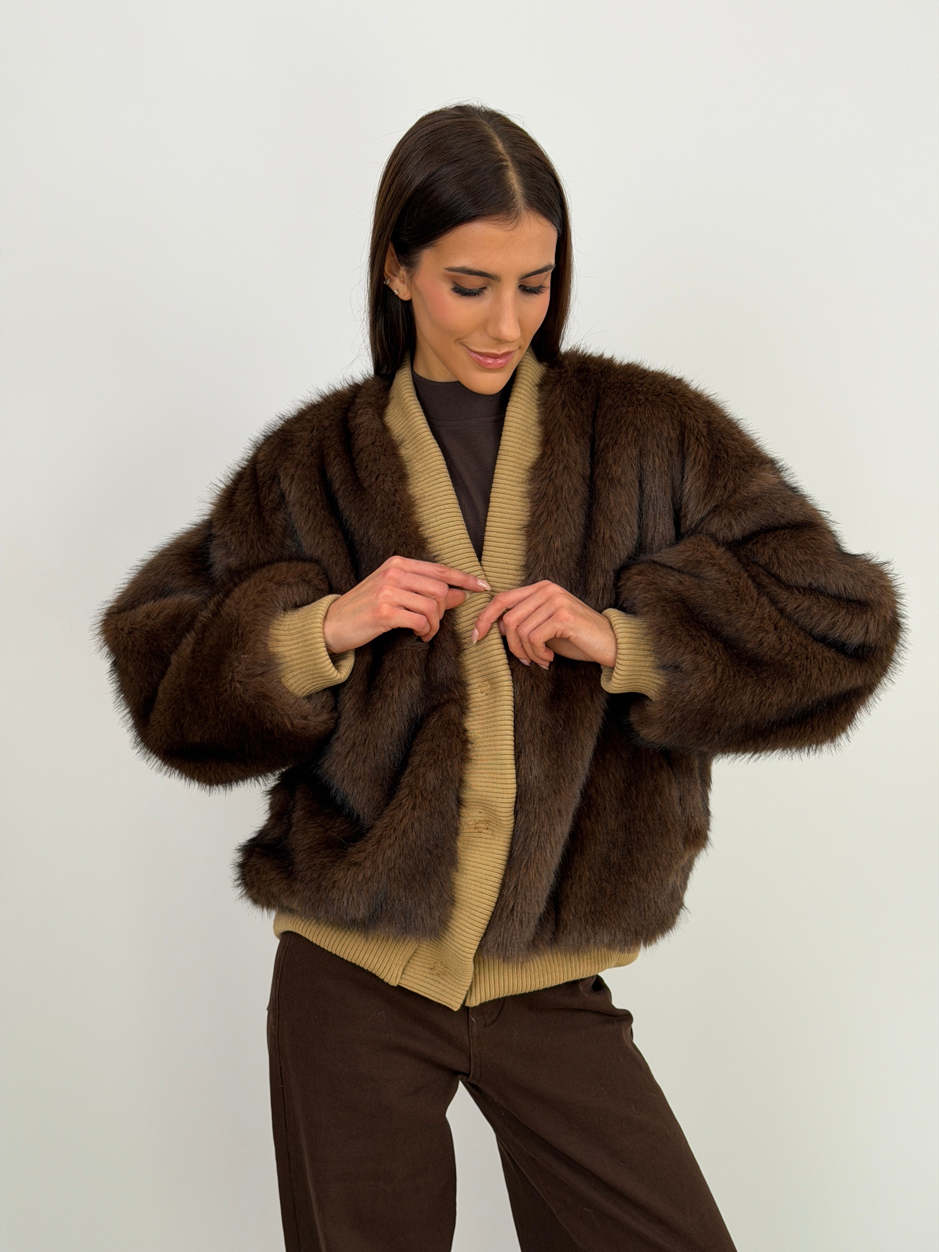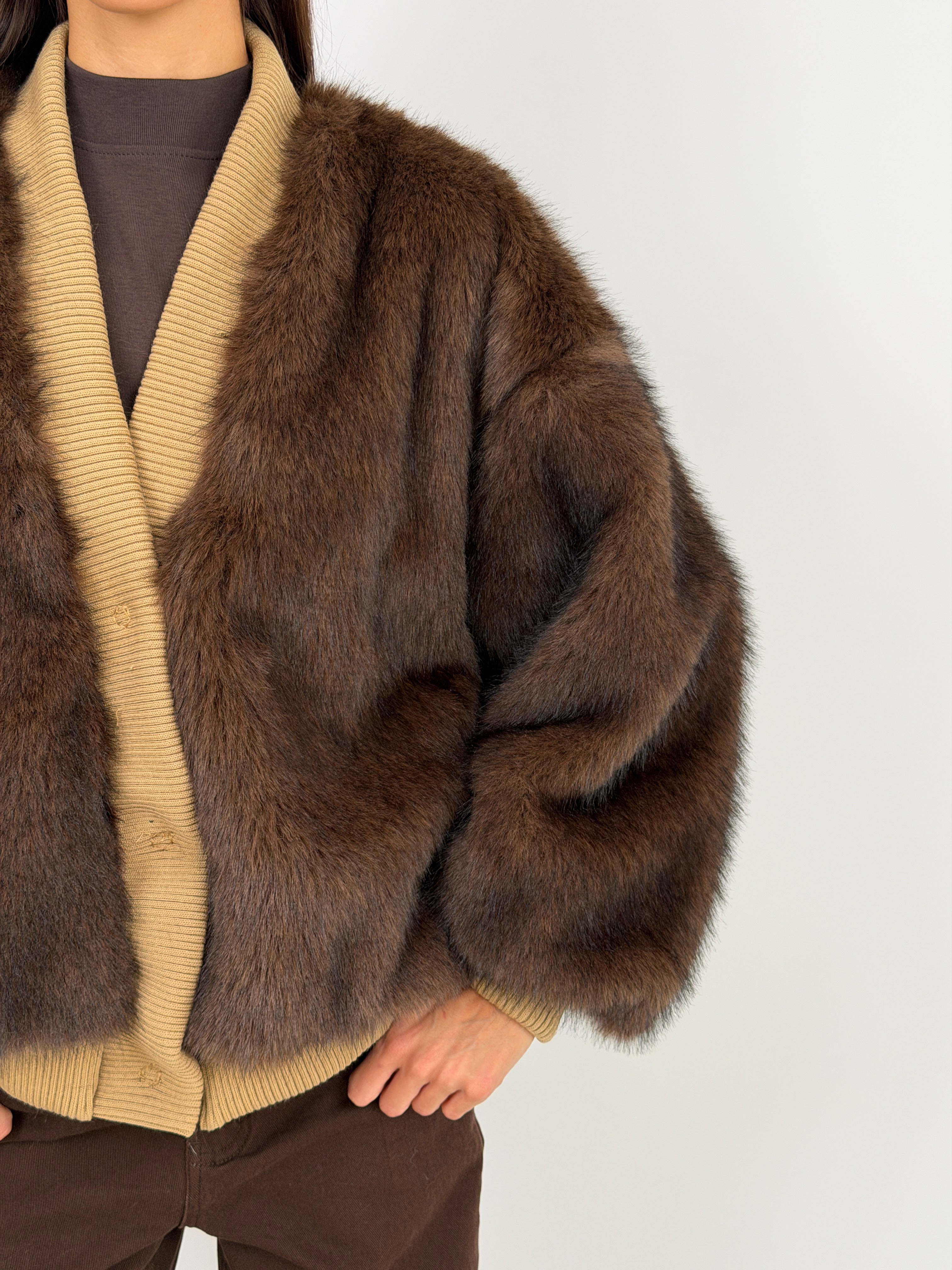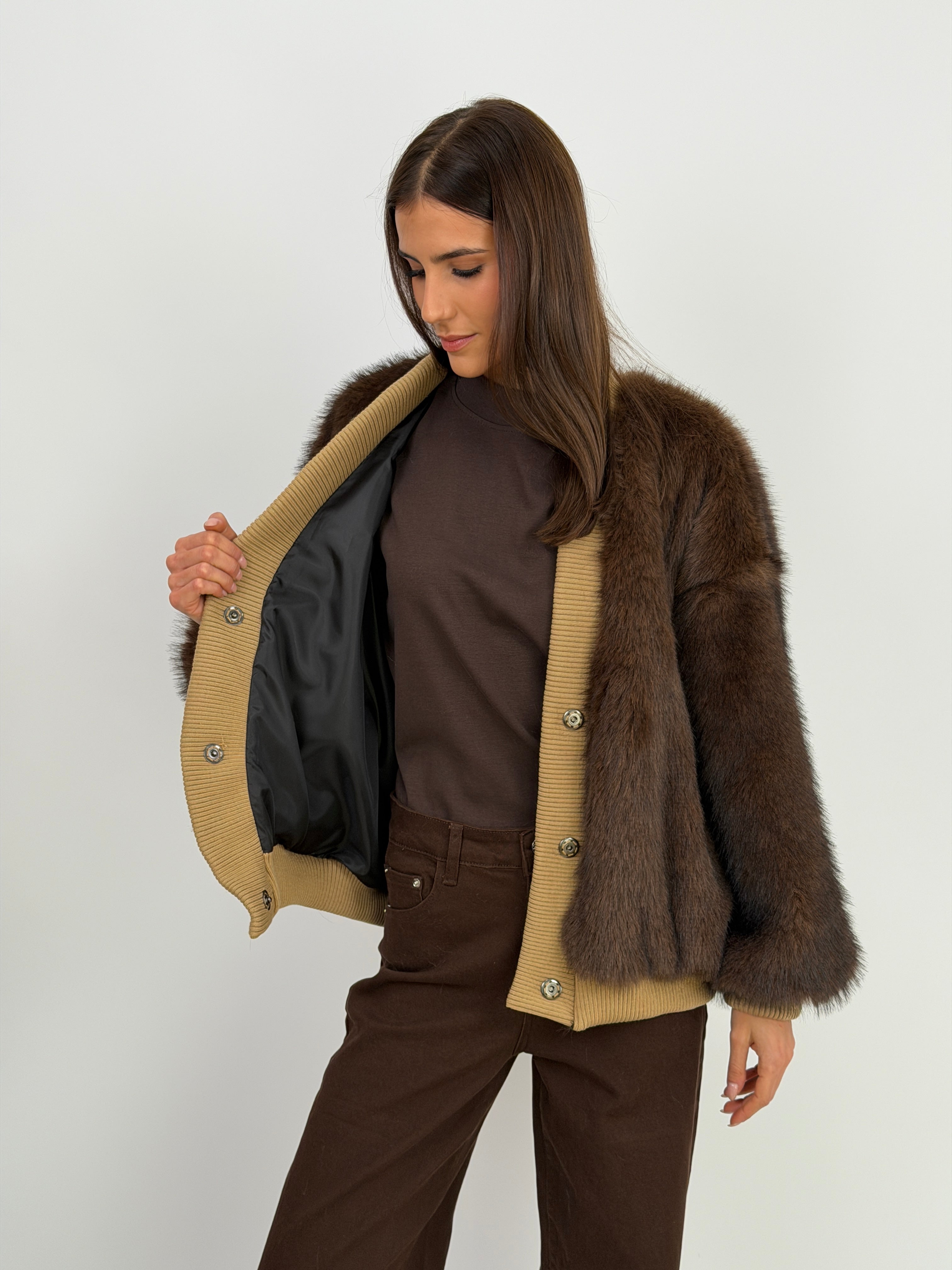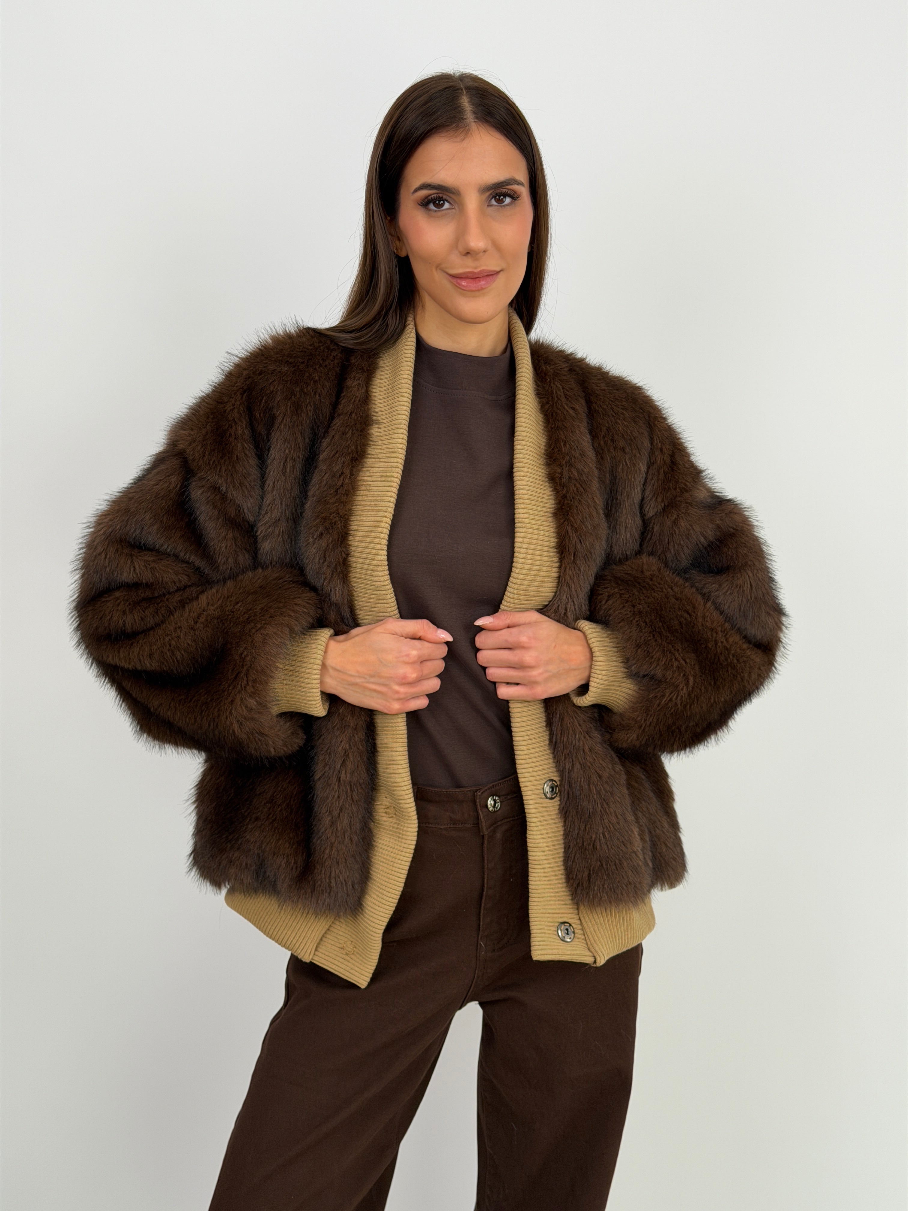 Giaccone in eco pelliccia marrone con taglio a giacca senza collo, bordi elasticizzati e chiusura con bottoni
