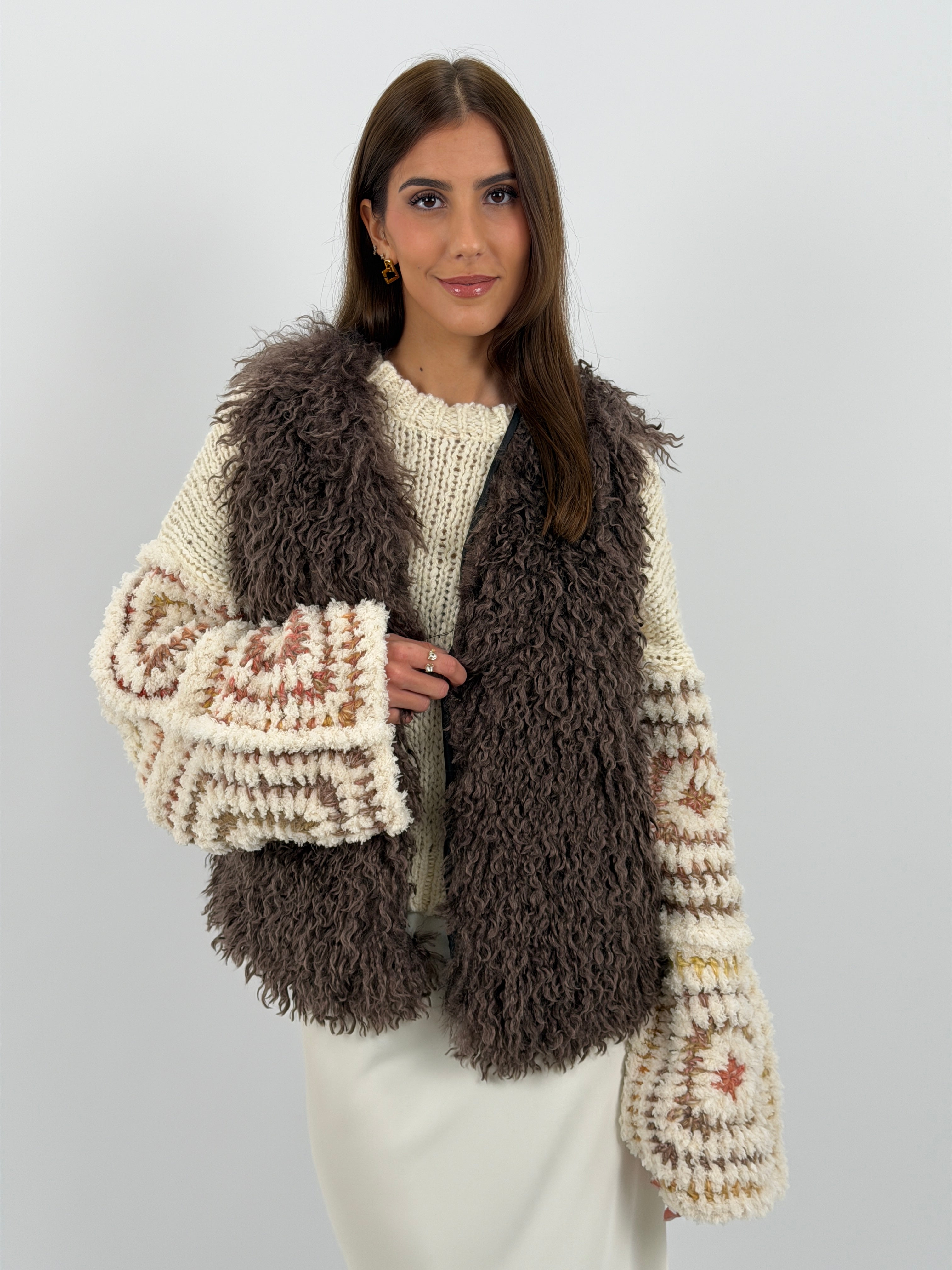 Gilet in eco pelliccia Mongolia marrone con fodera interna, tasche laterali e chiusura con gancetto.