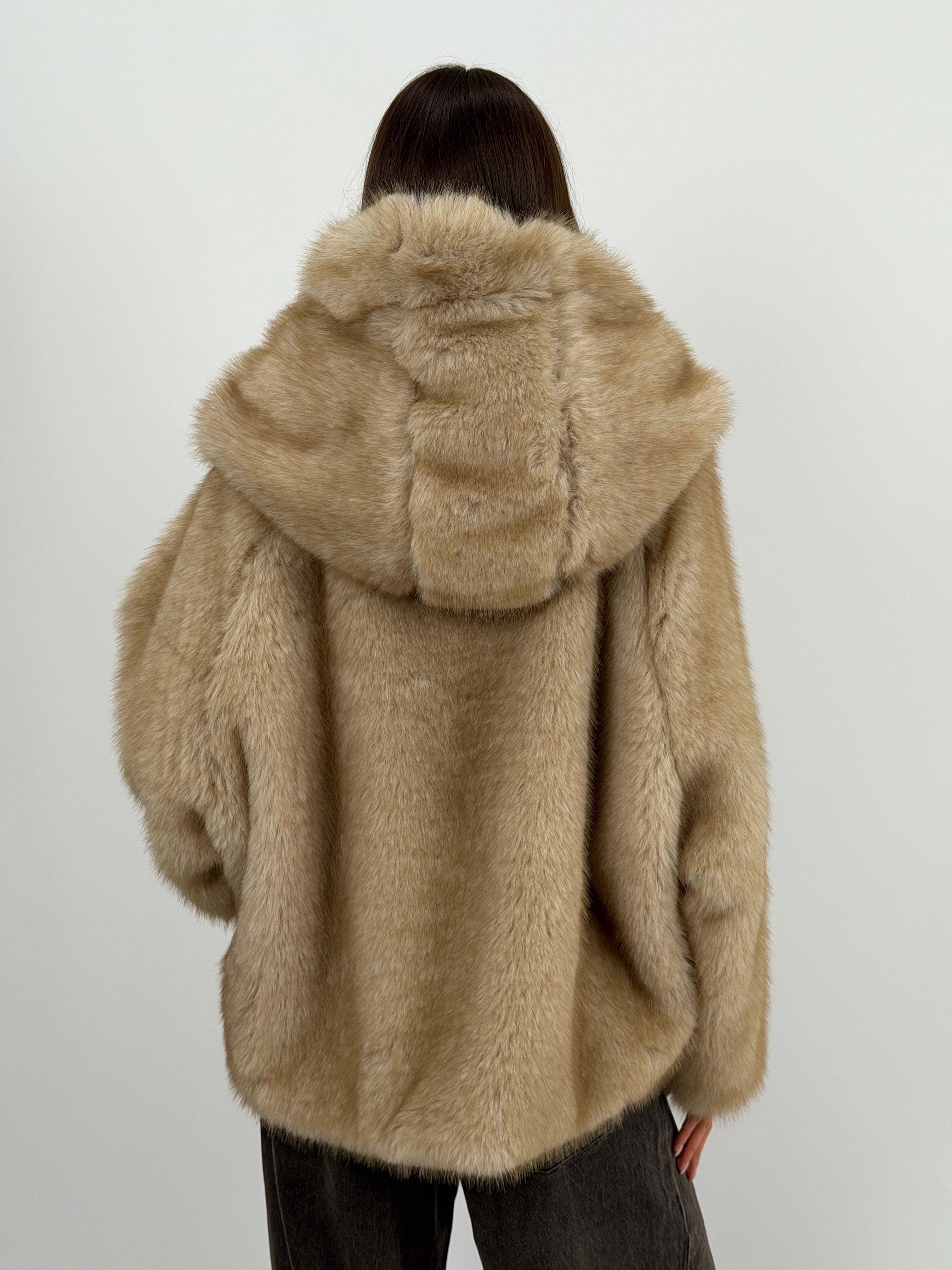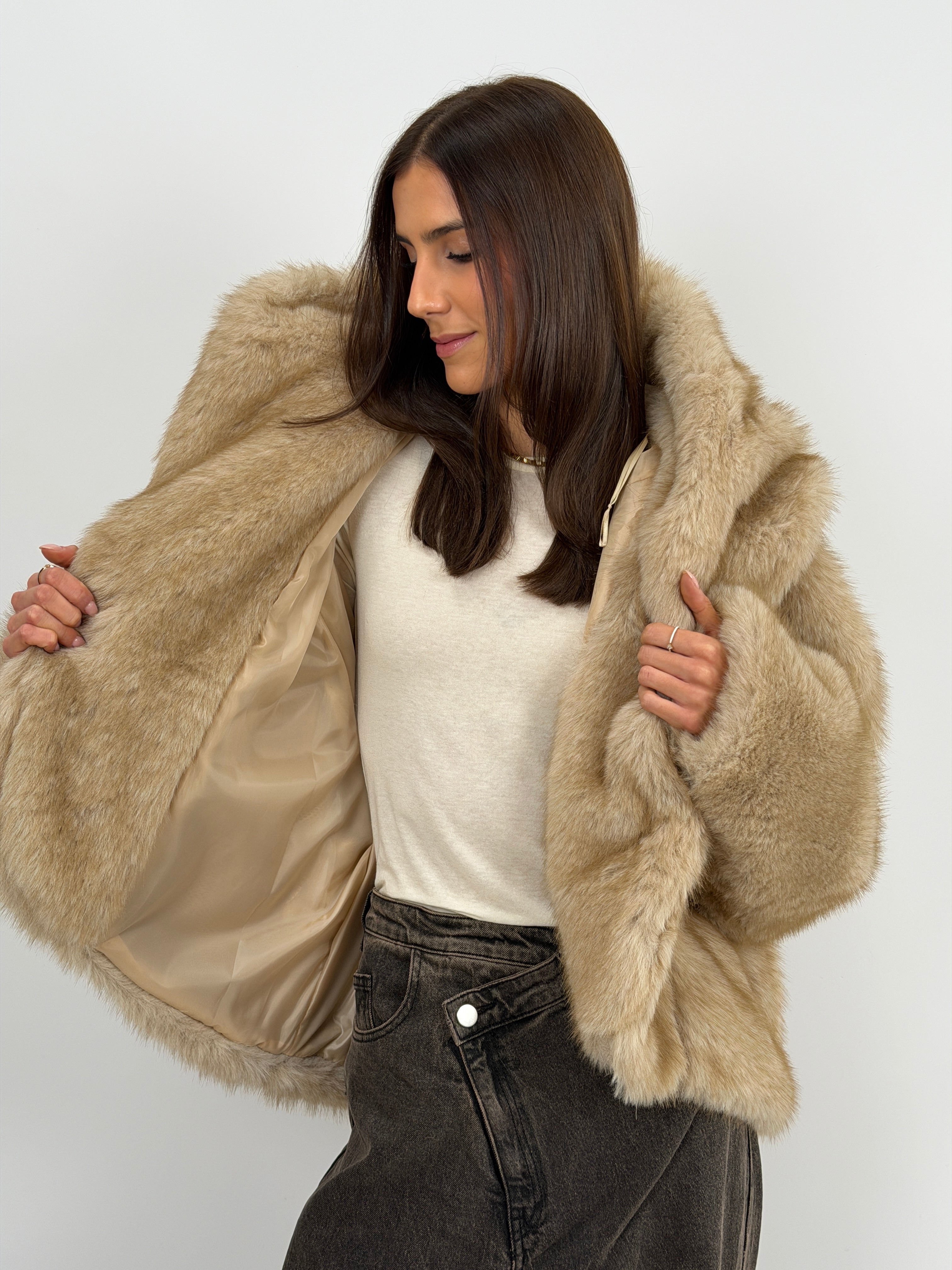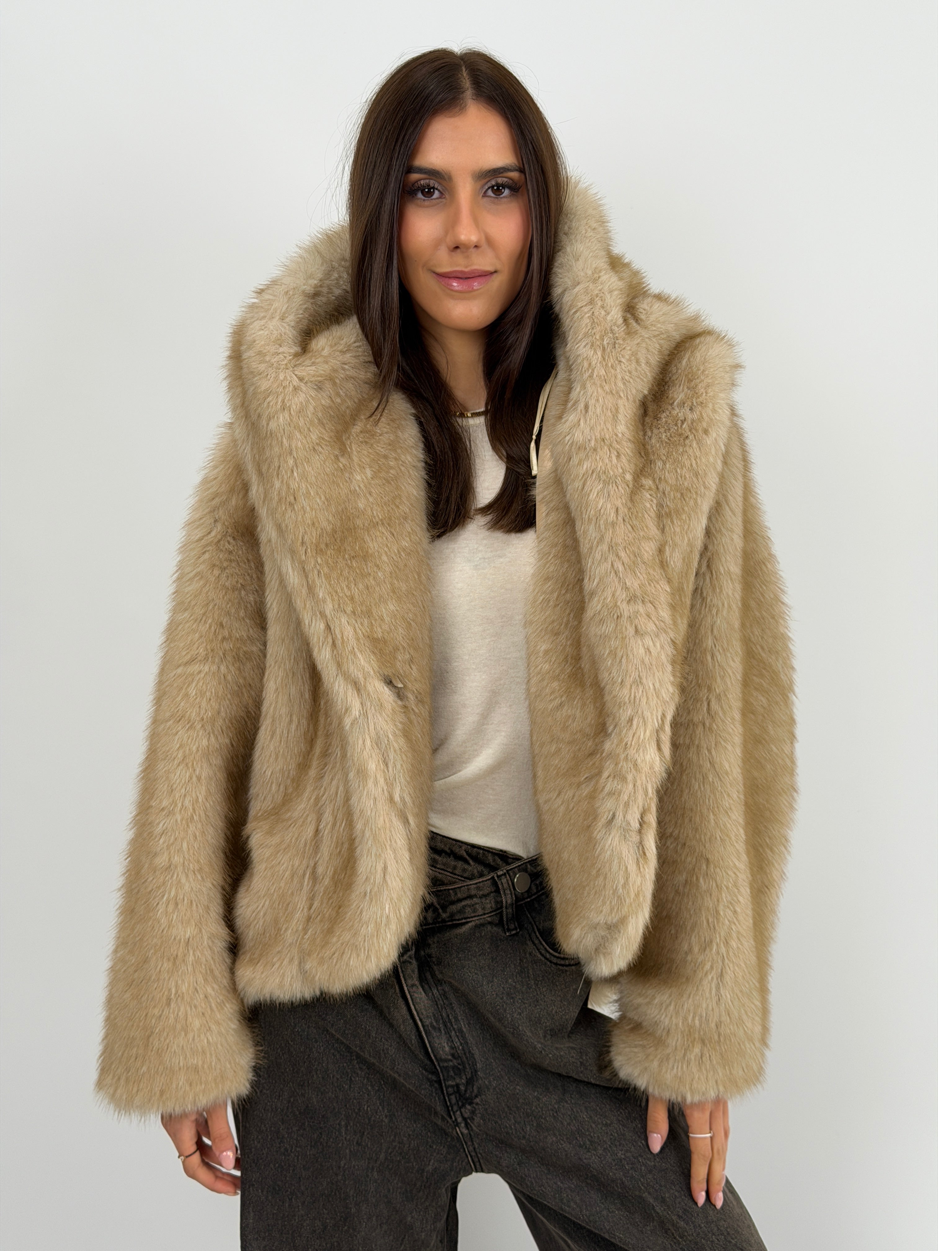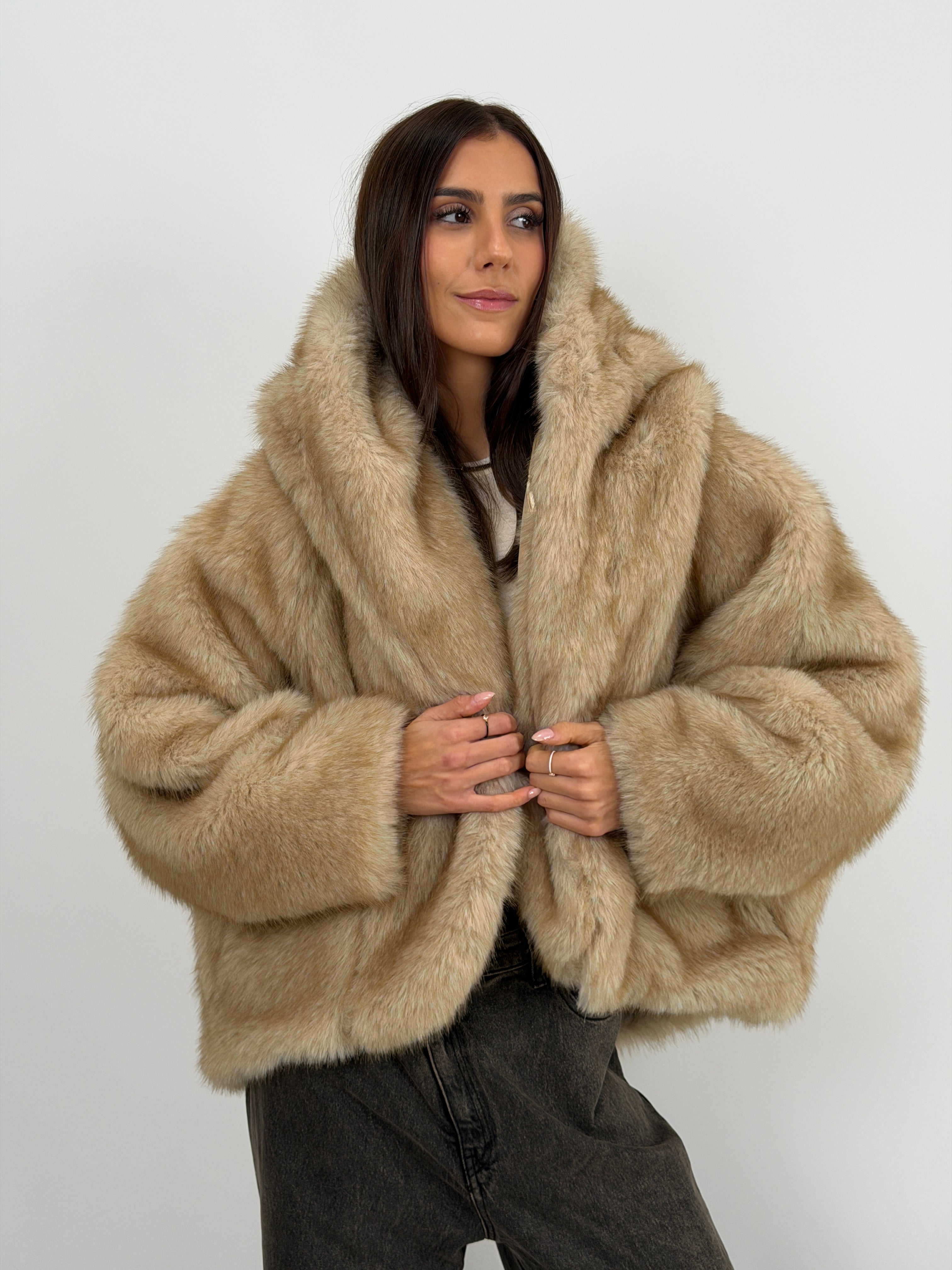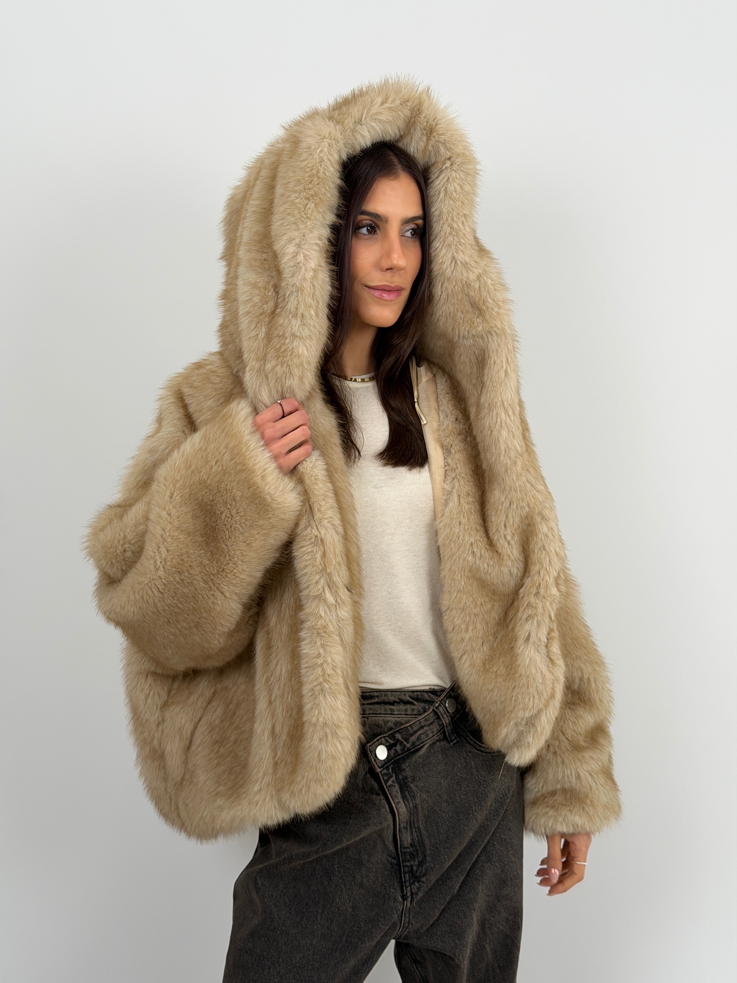 Morbida eco pelliccia beige caldo dal taglio ampio con maxi cappuccio, chiusura frontale con gancetti, tasche laterali e fodera interna.