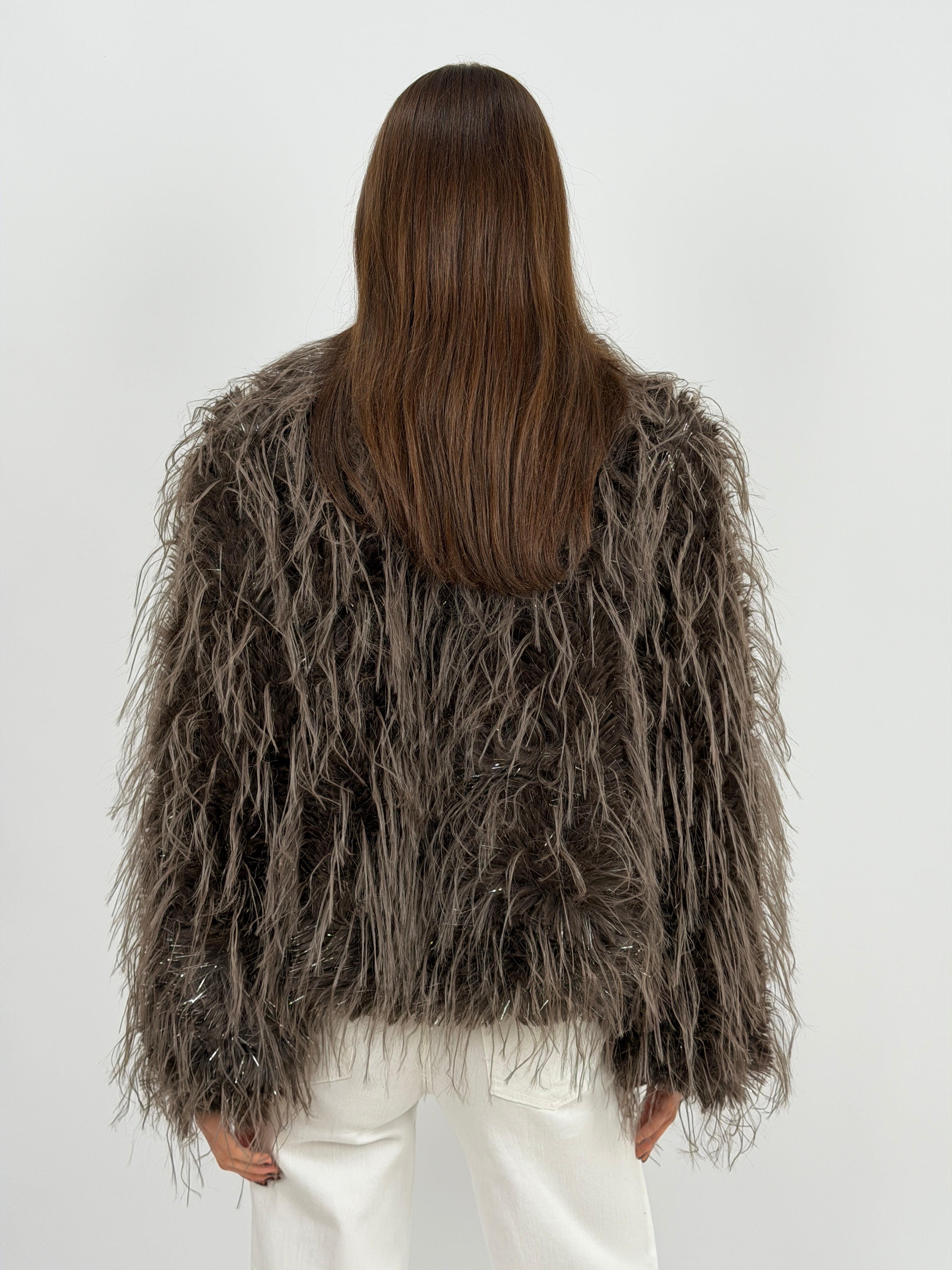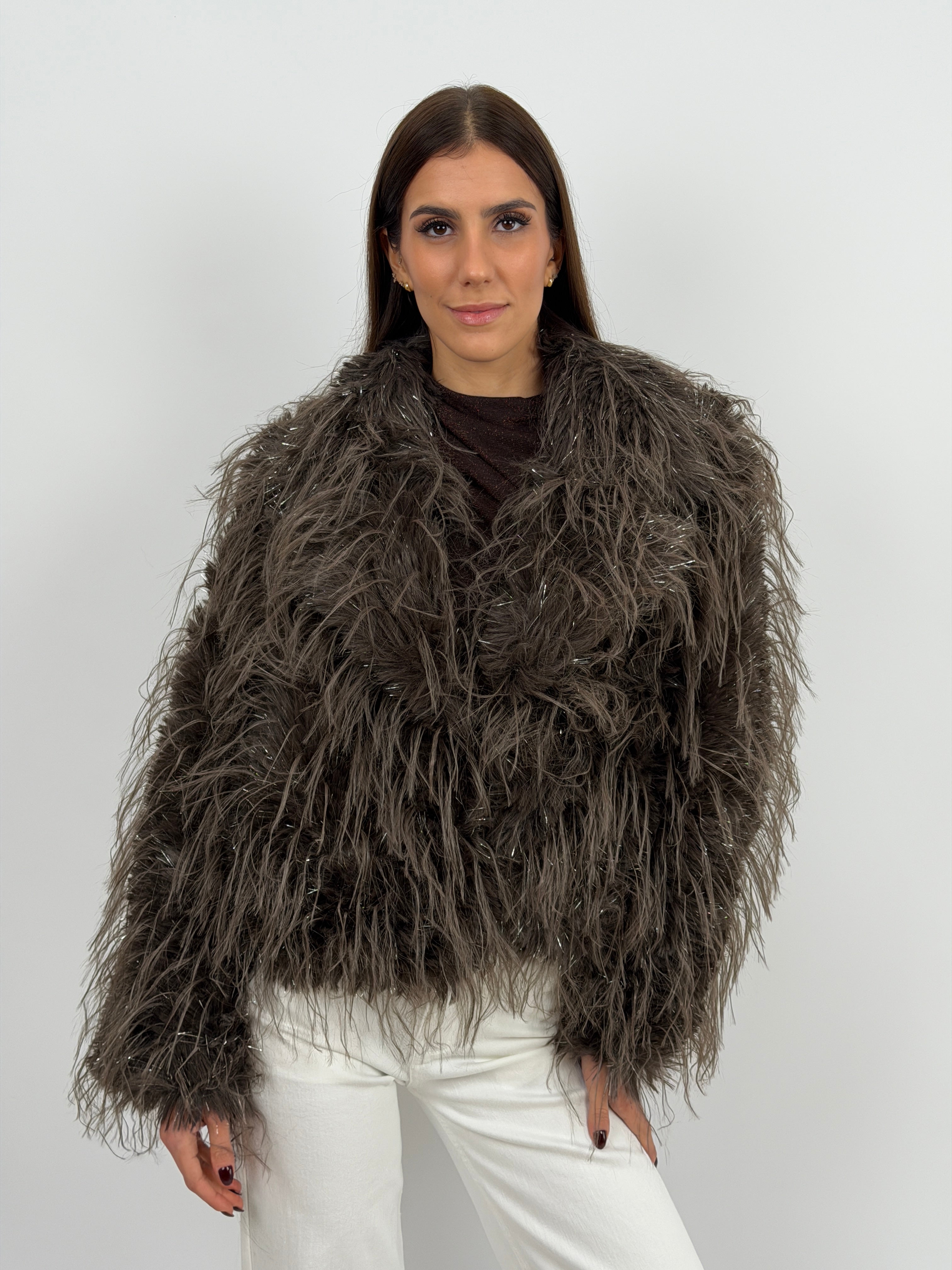 Eco pelliccia morbida marrone con lamé, collo a revers, chiusura frontale con bottone, tasche laterali e fodera interna.