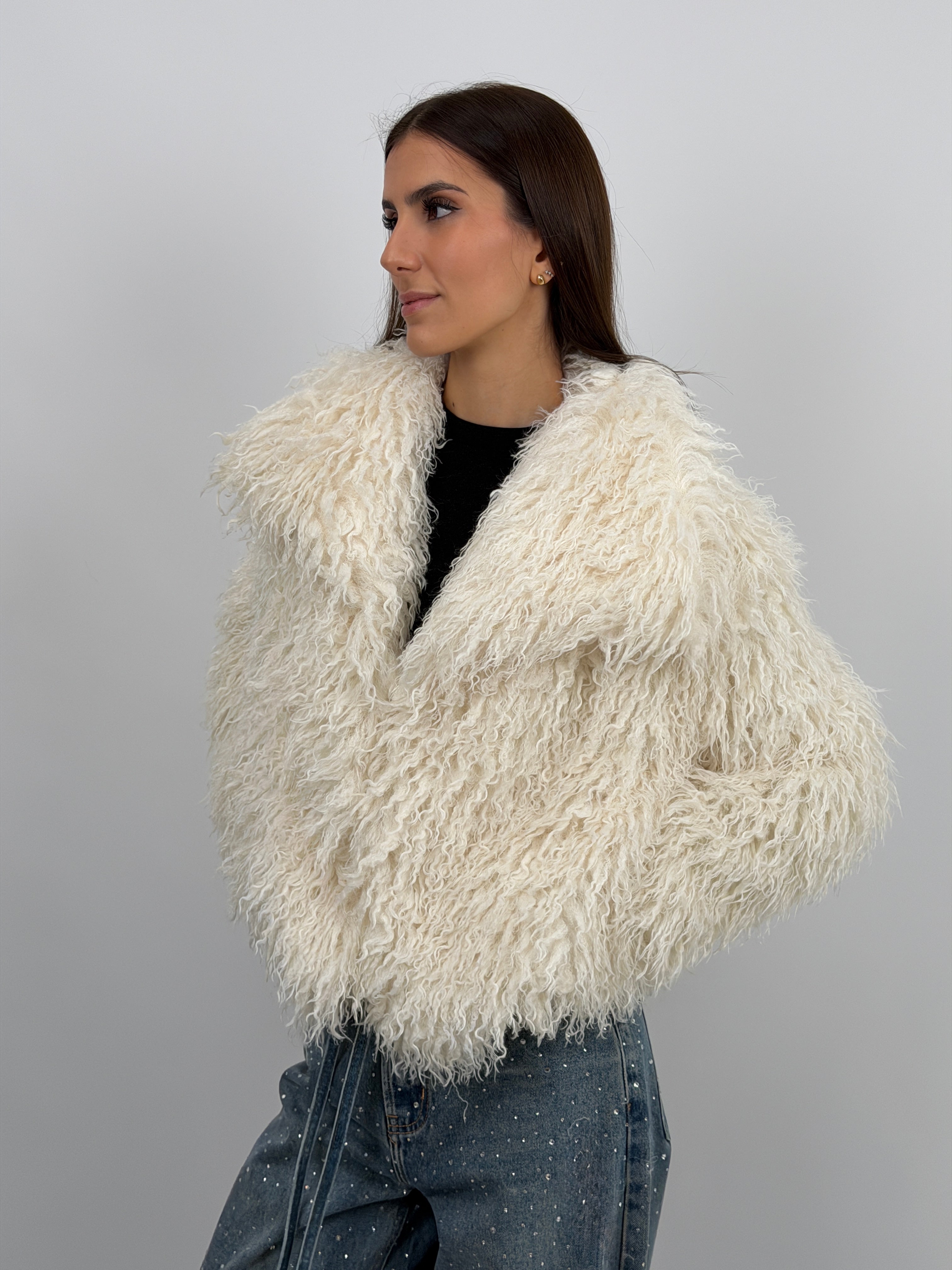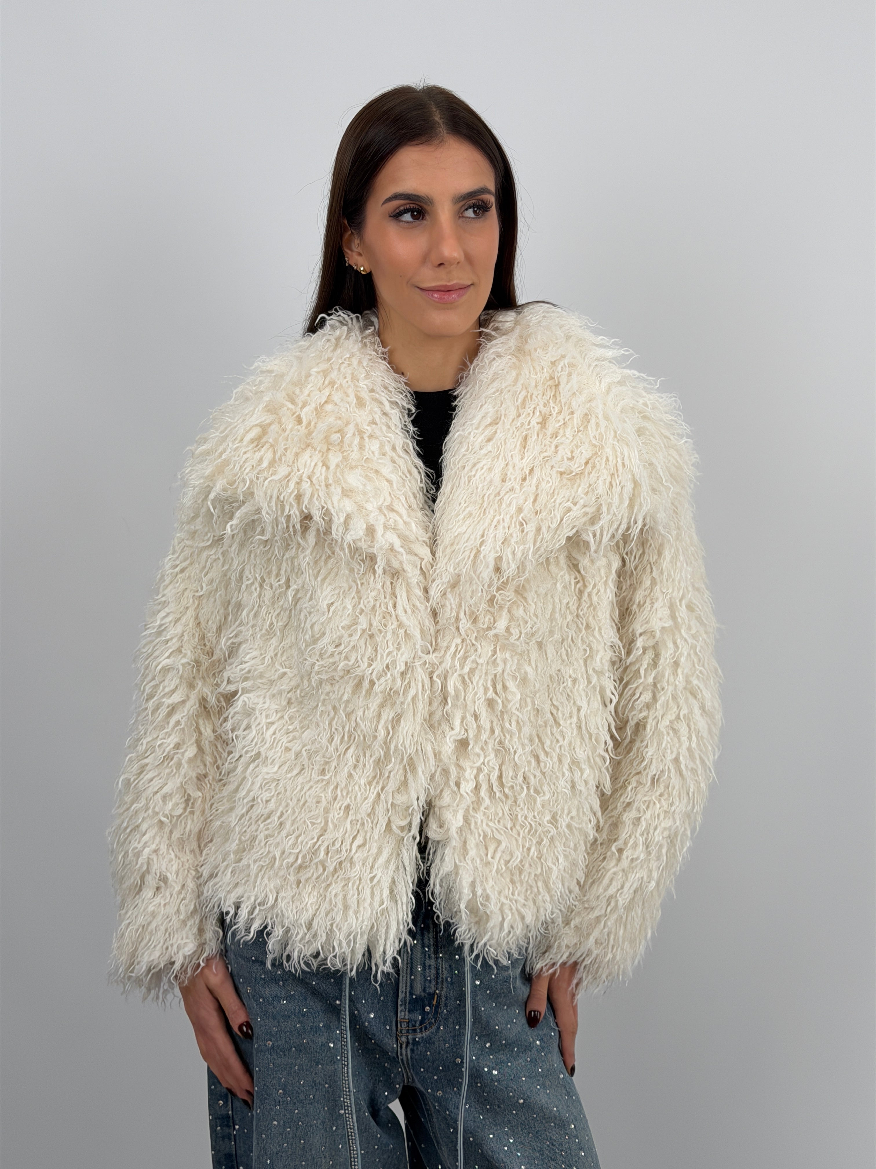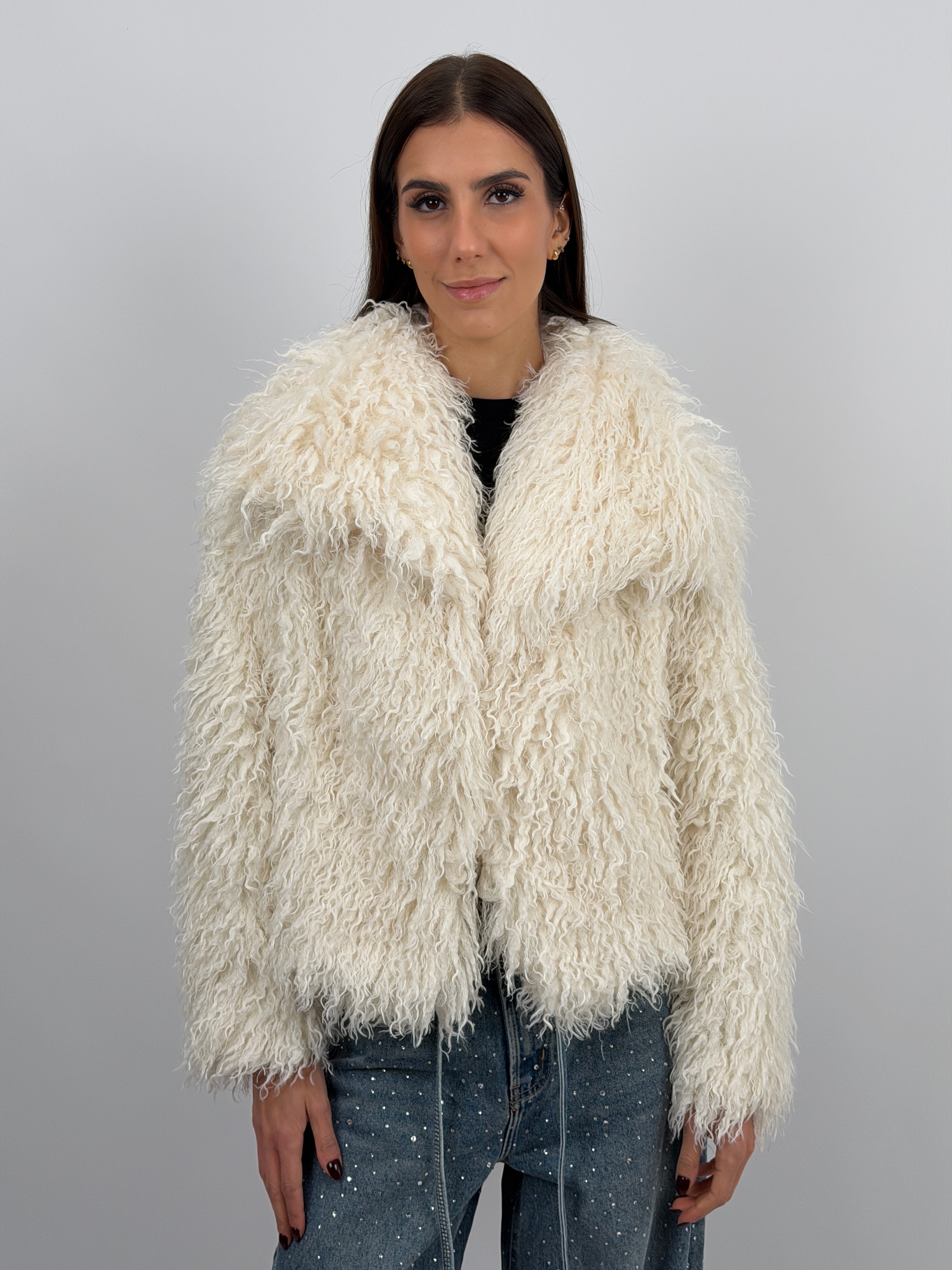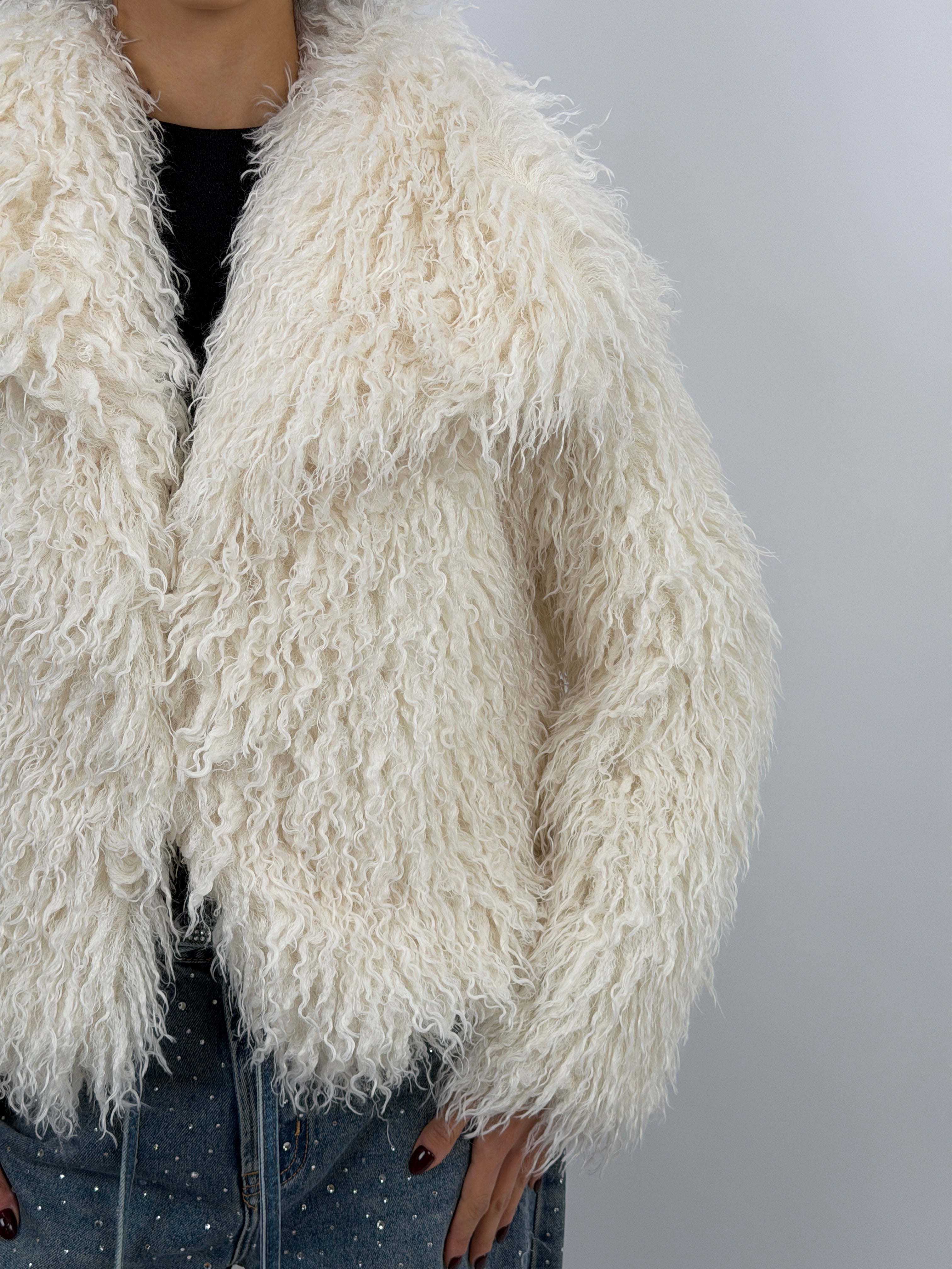 Eco pelliccia bianca effetto Mongolia, morbida con fodera interna, collo ampio, tasche laterali e doppio gancetto.