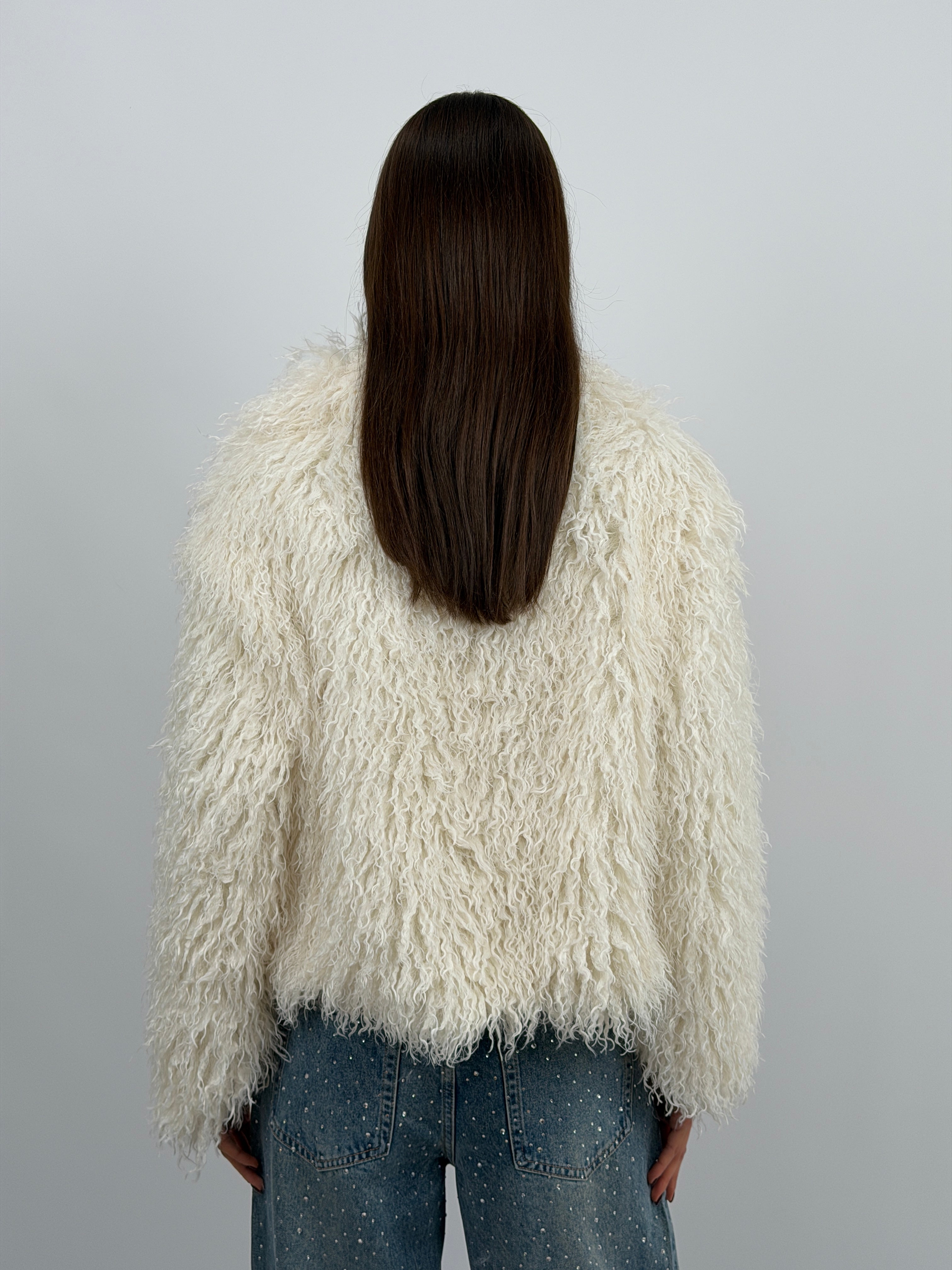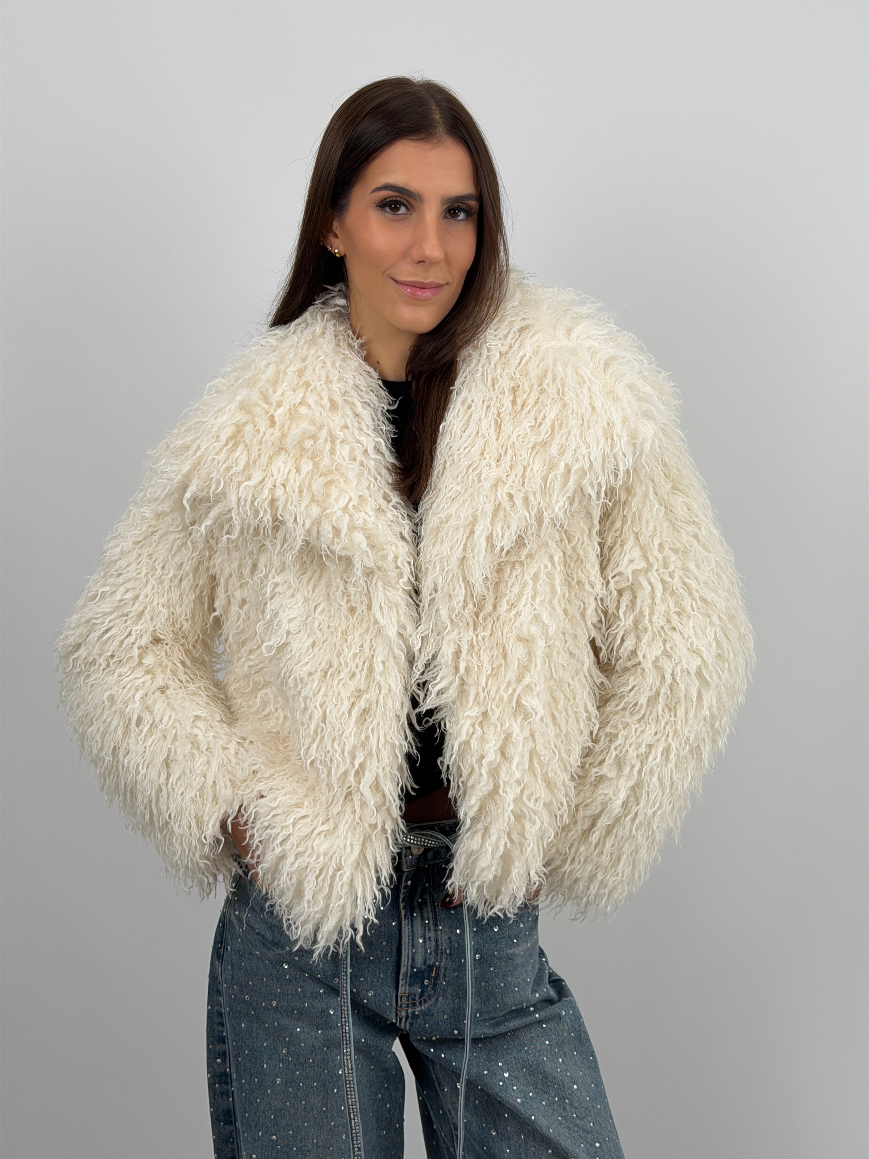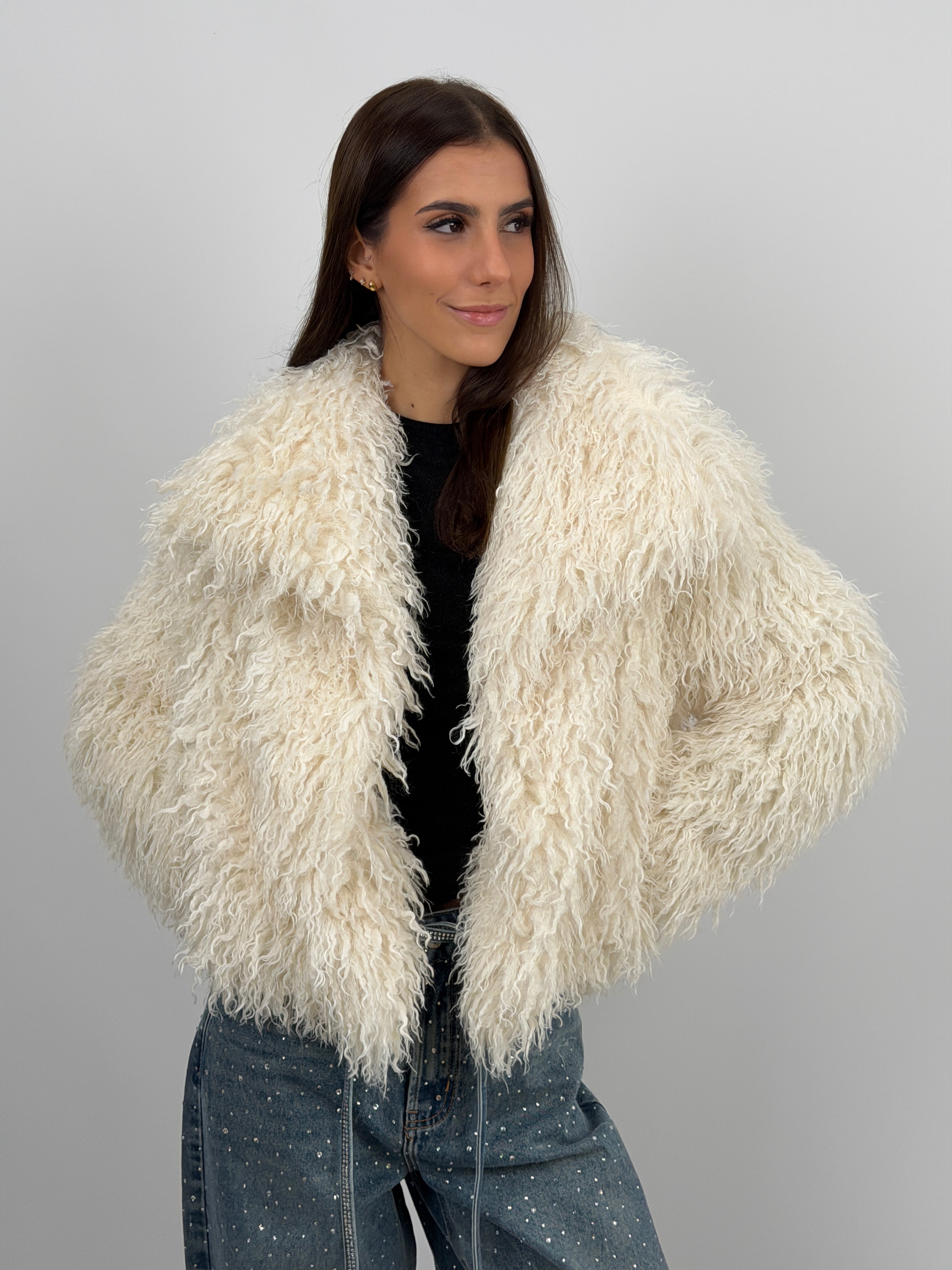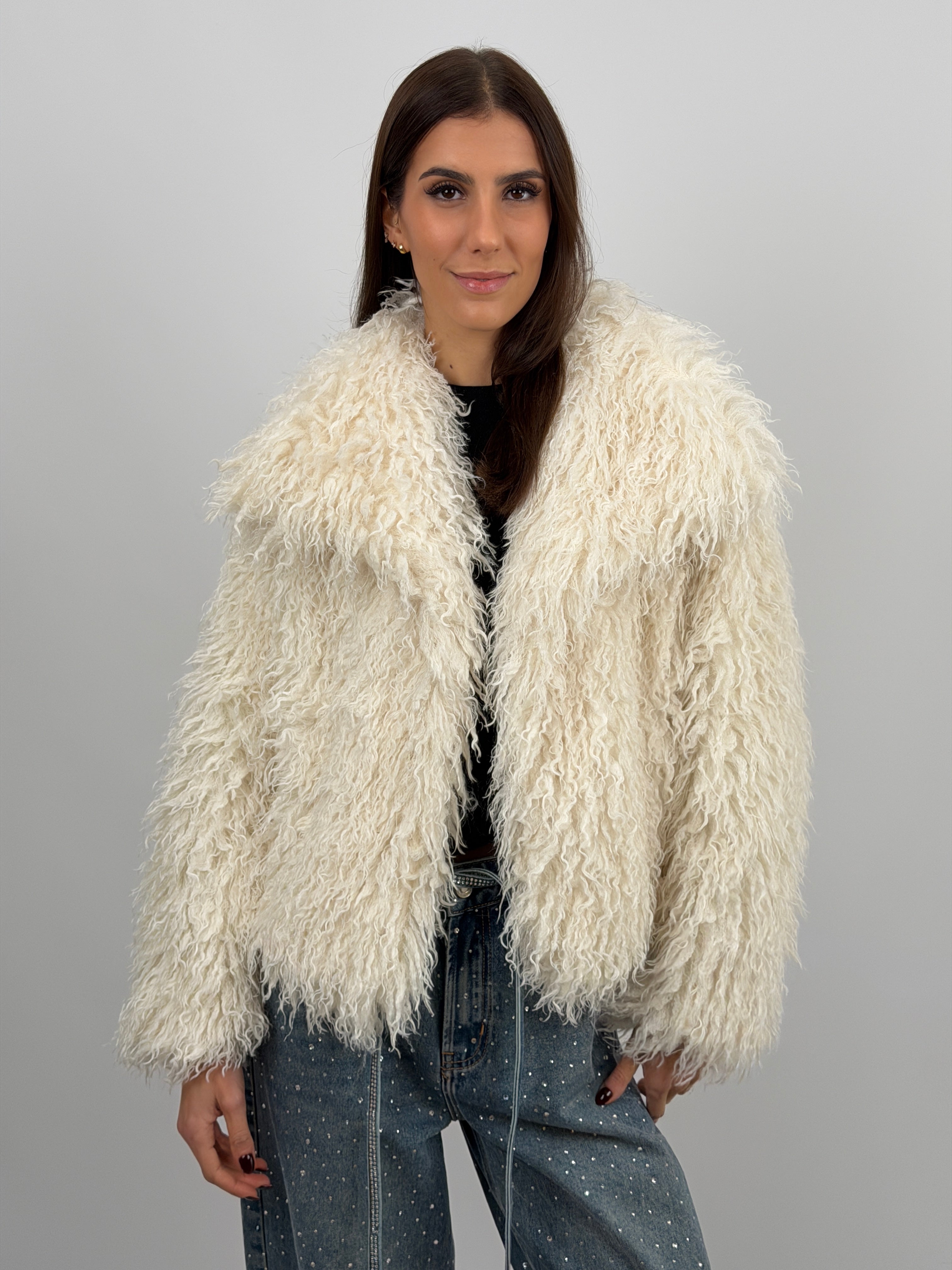 Eco pelliccia bianca effetto Mongolia, morbida con fodera interna, collo ampio, tasche laterali e doppio gancetto.