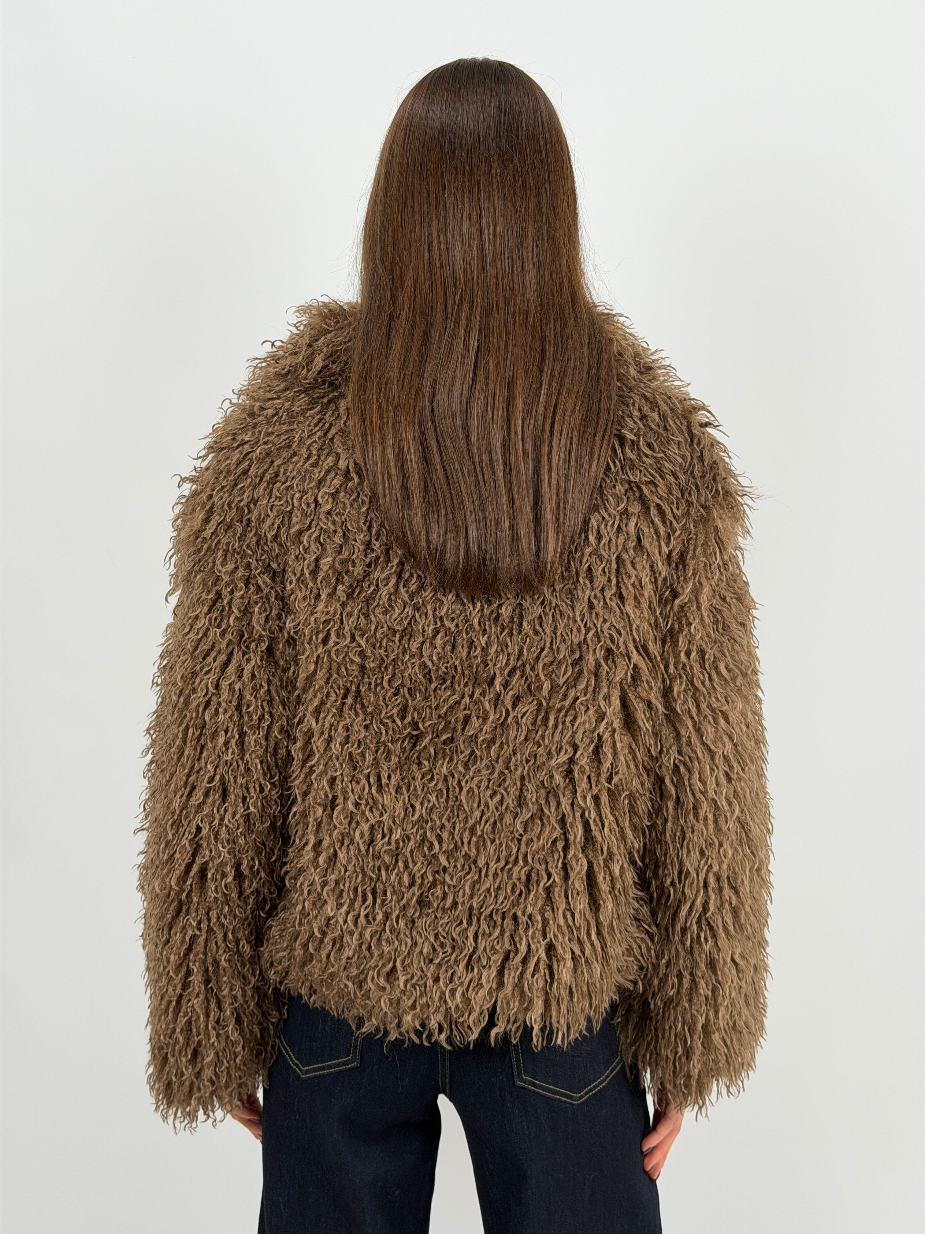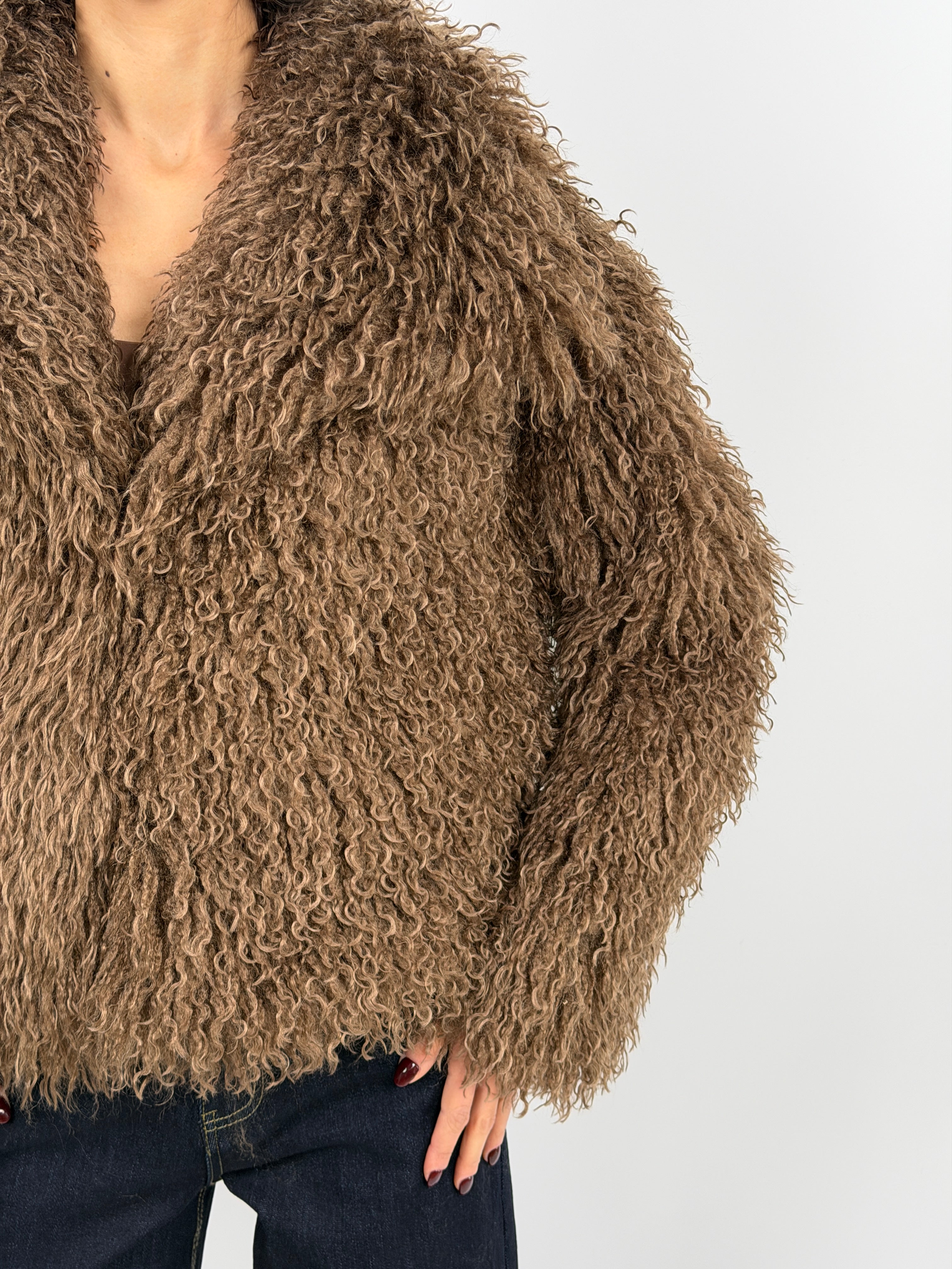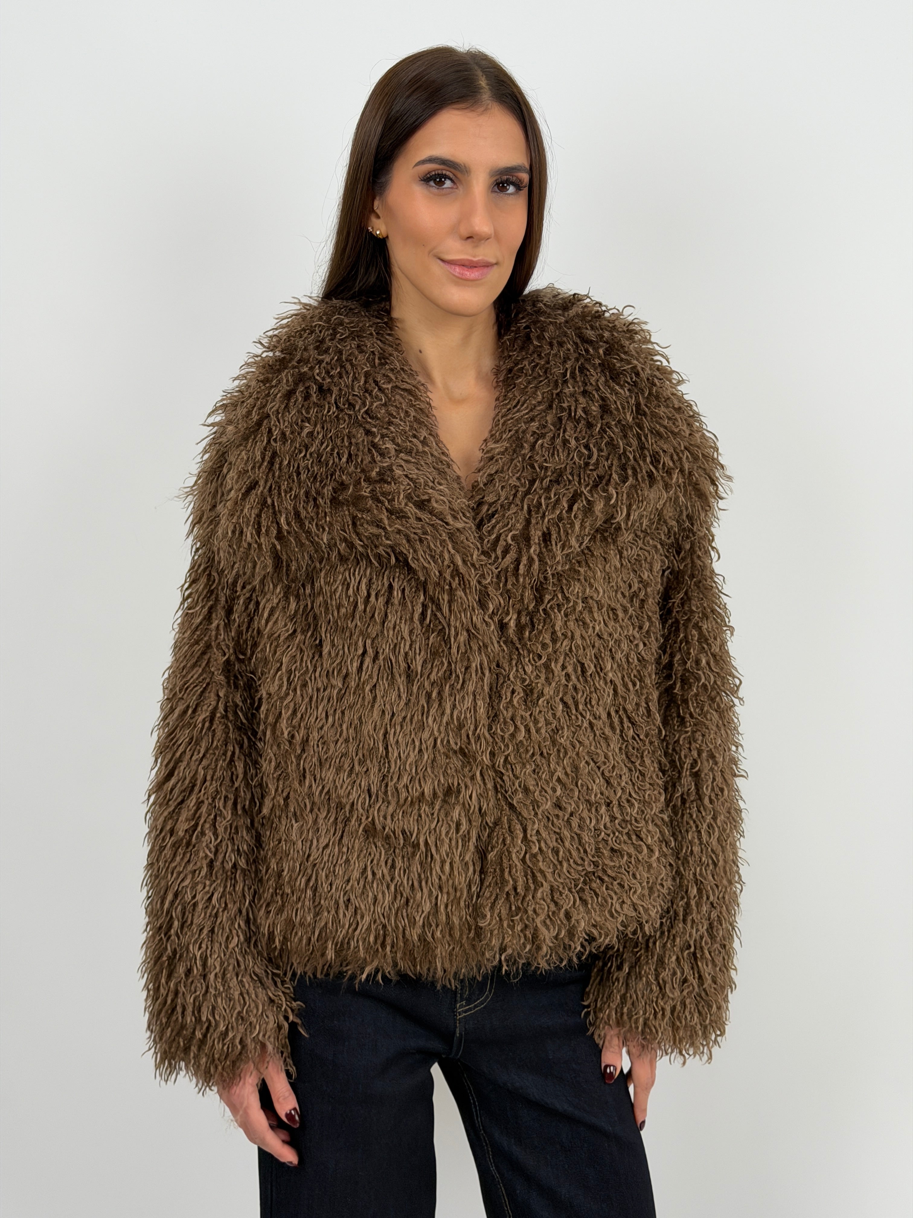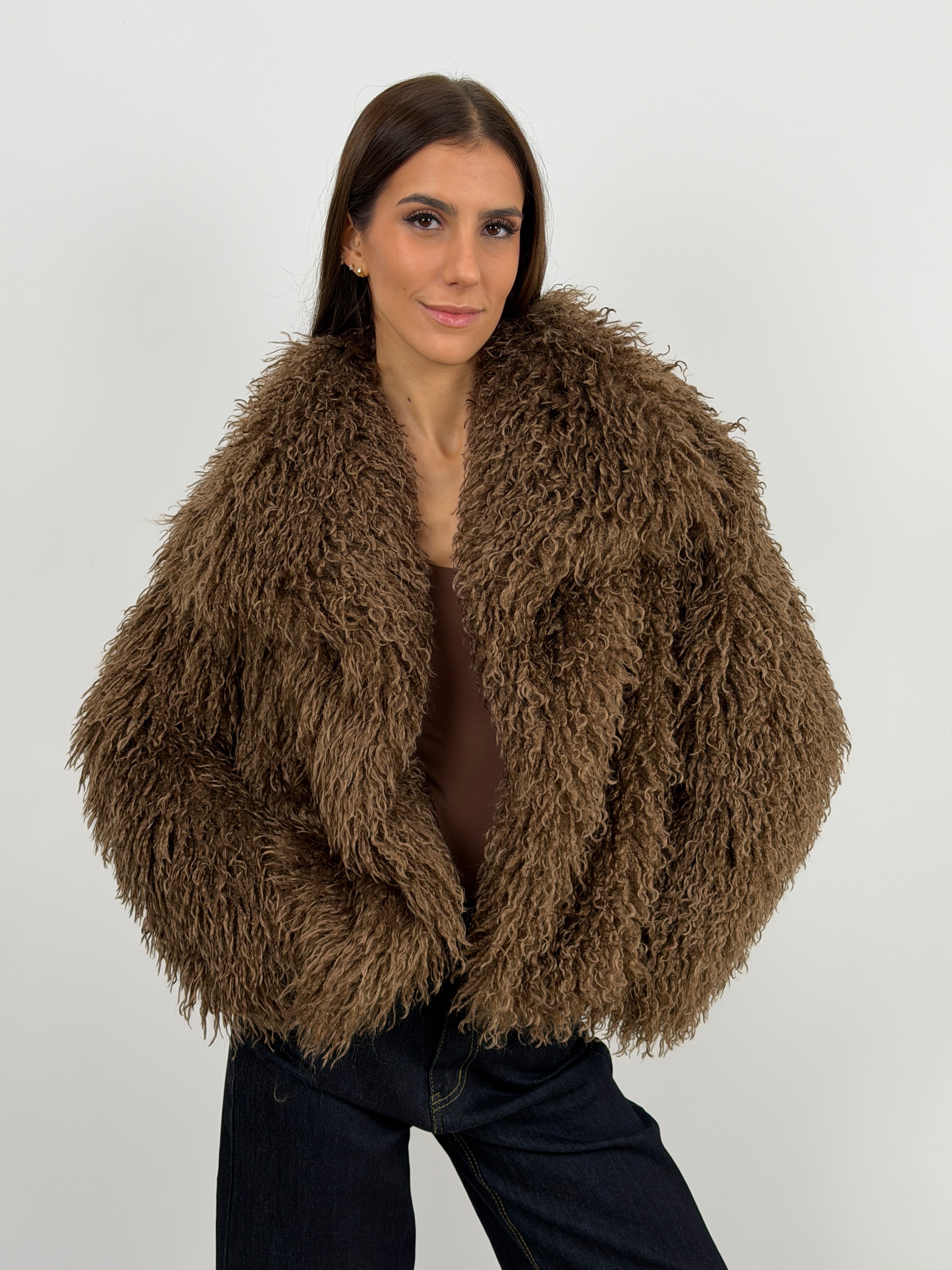 Eco pelliccia marrone effetto Mongolia, morbida con fodera interna, collo ampio, tasche laterali e doppio gancetto.