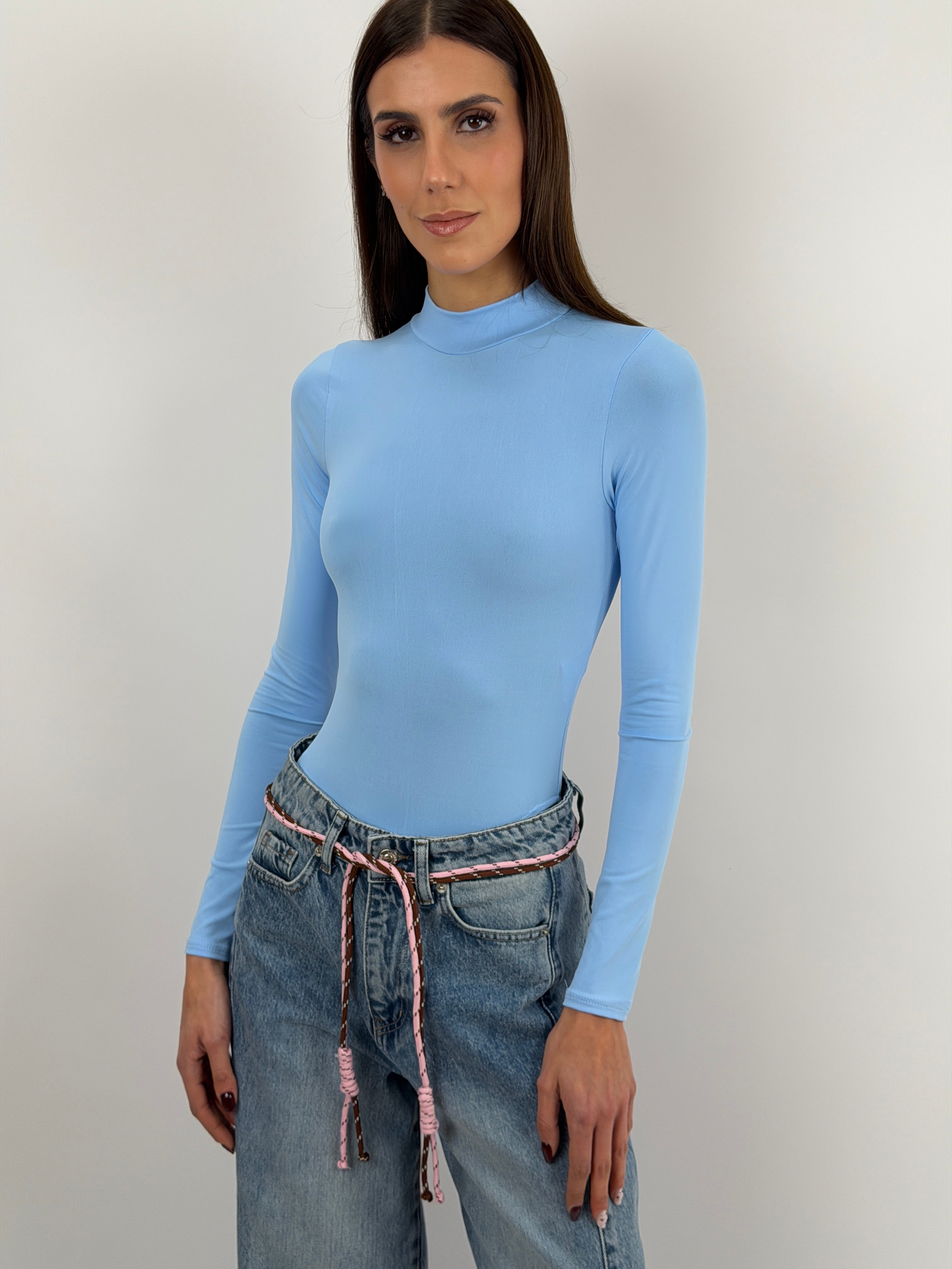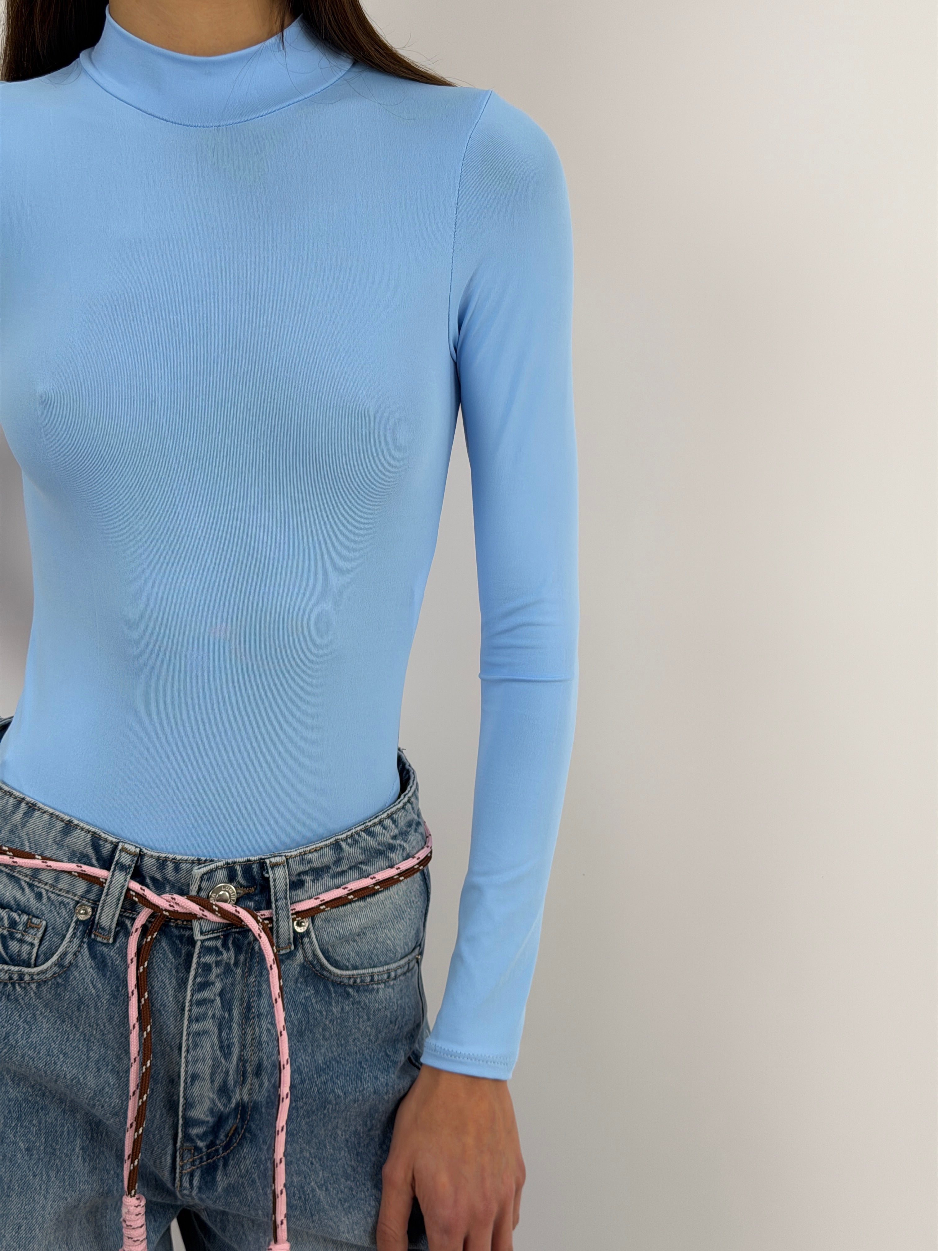 Body azzurro in lycra elasticizzata con maniche lunghe e collo alto.