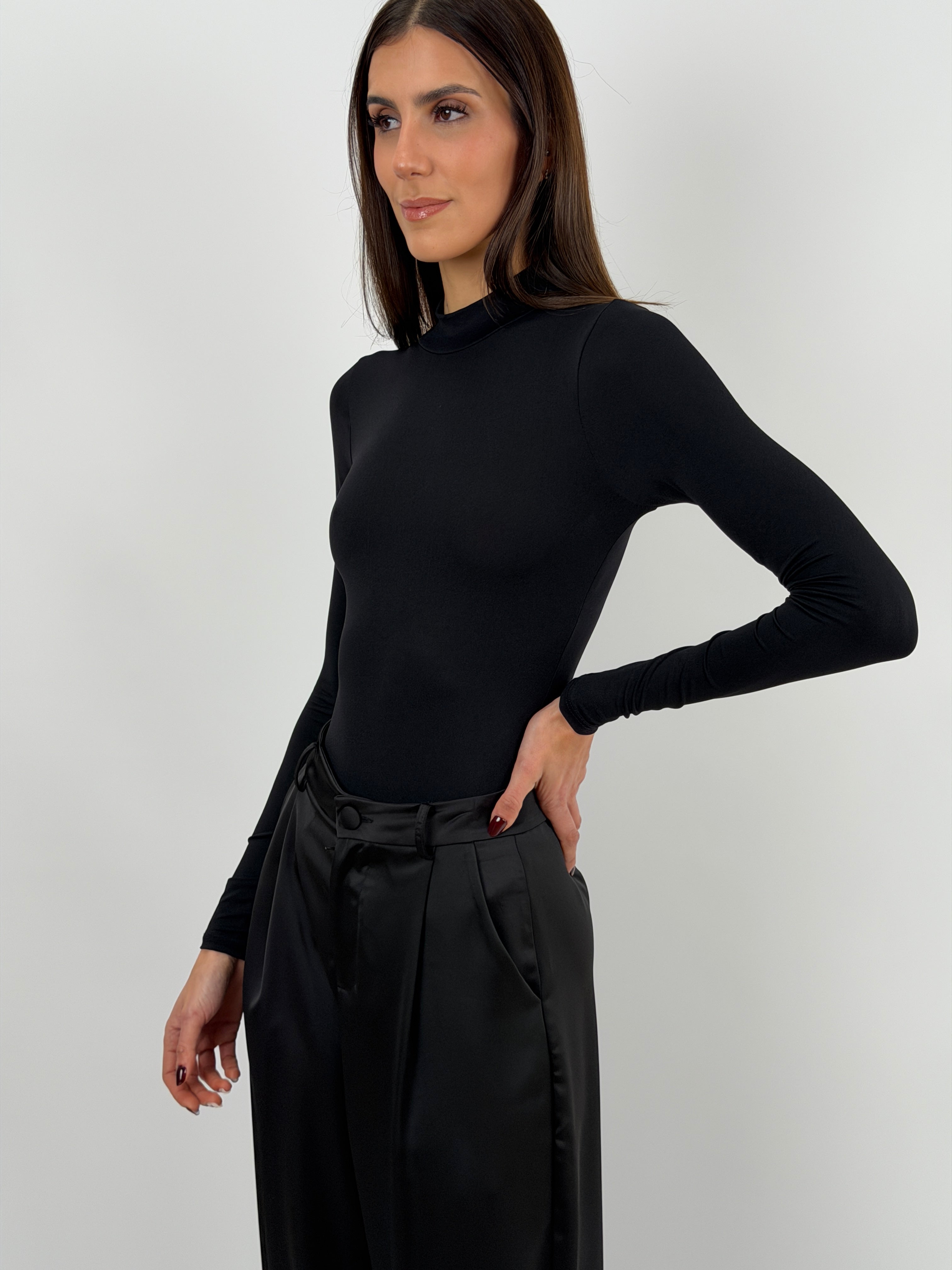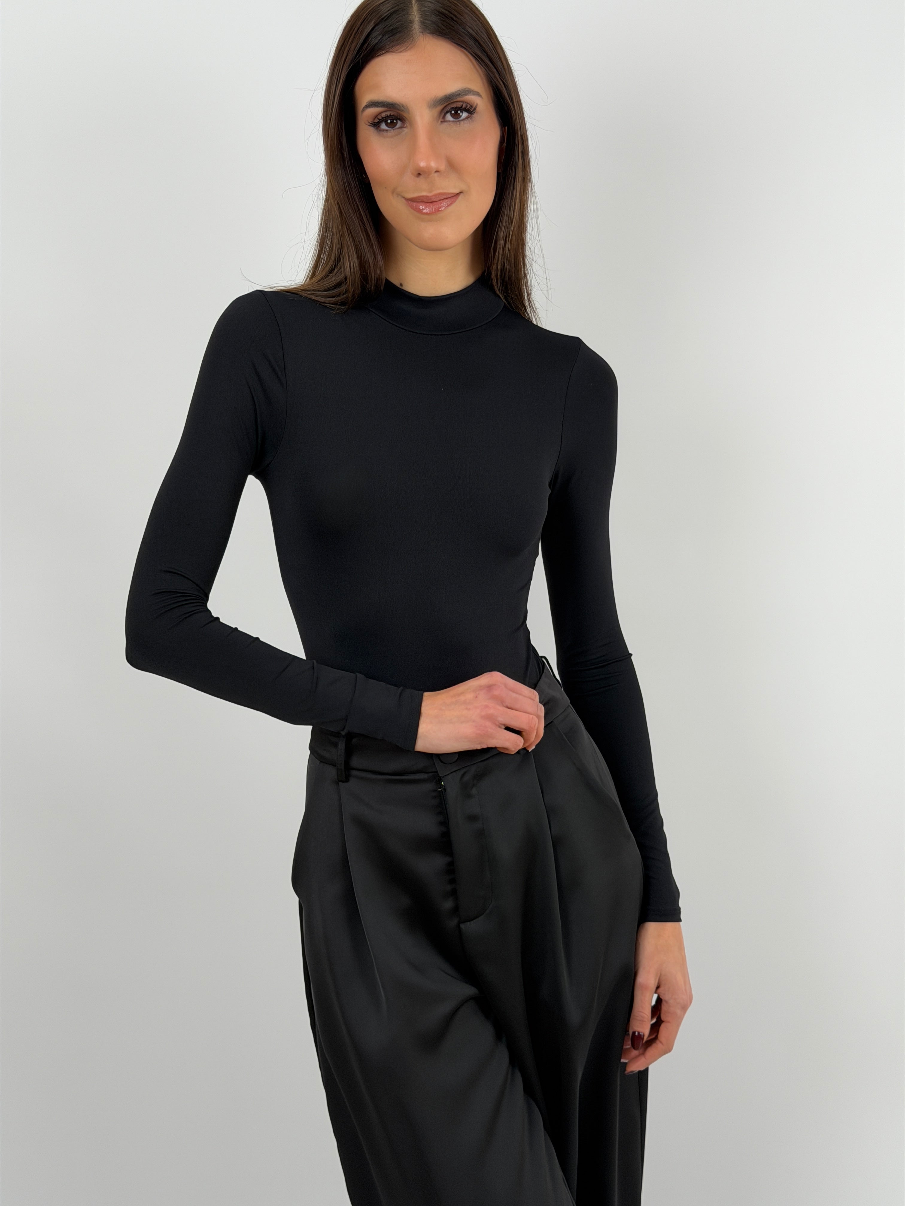 Body nero in lycra elasticizzata con maniche lunghe e collo alto.