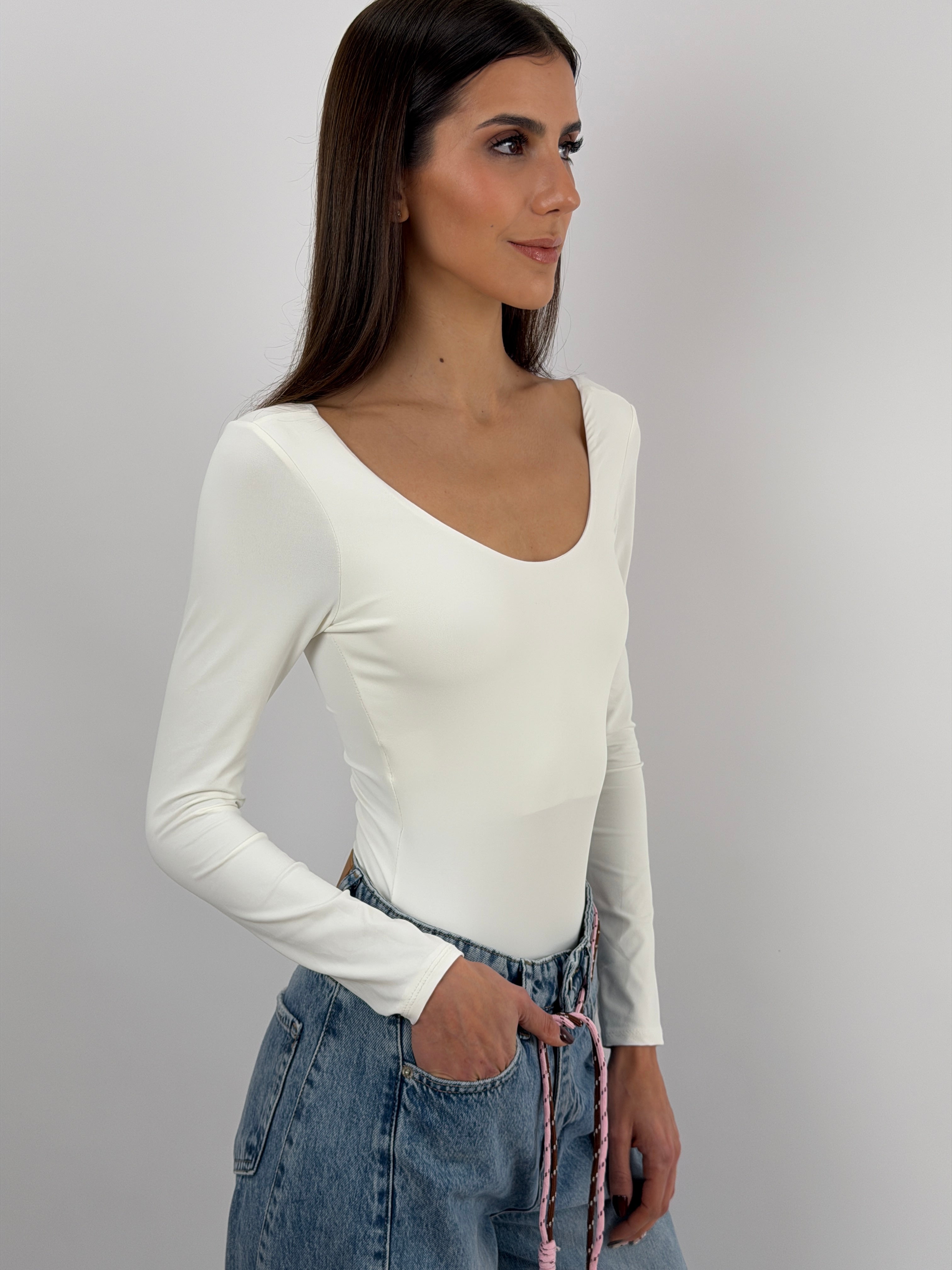 Body skim bianco a manica lunga, scollo tondo davanti e dietro, tessuto elasticizzato.