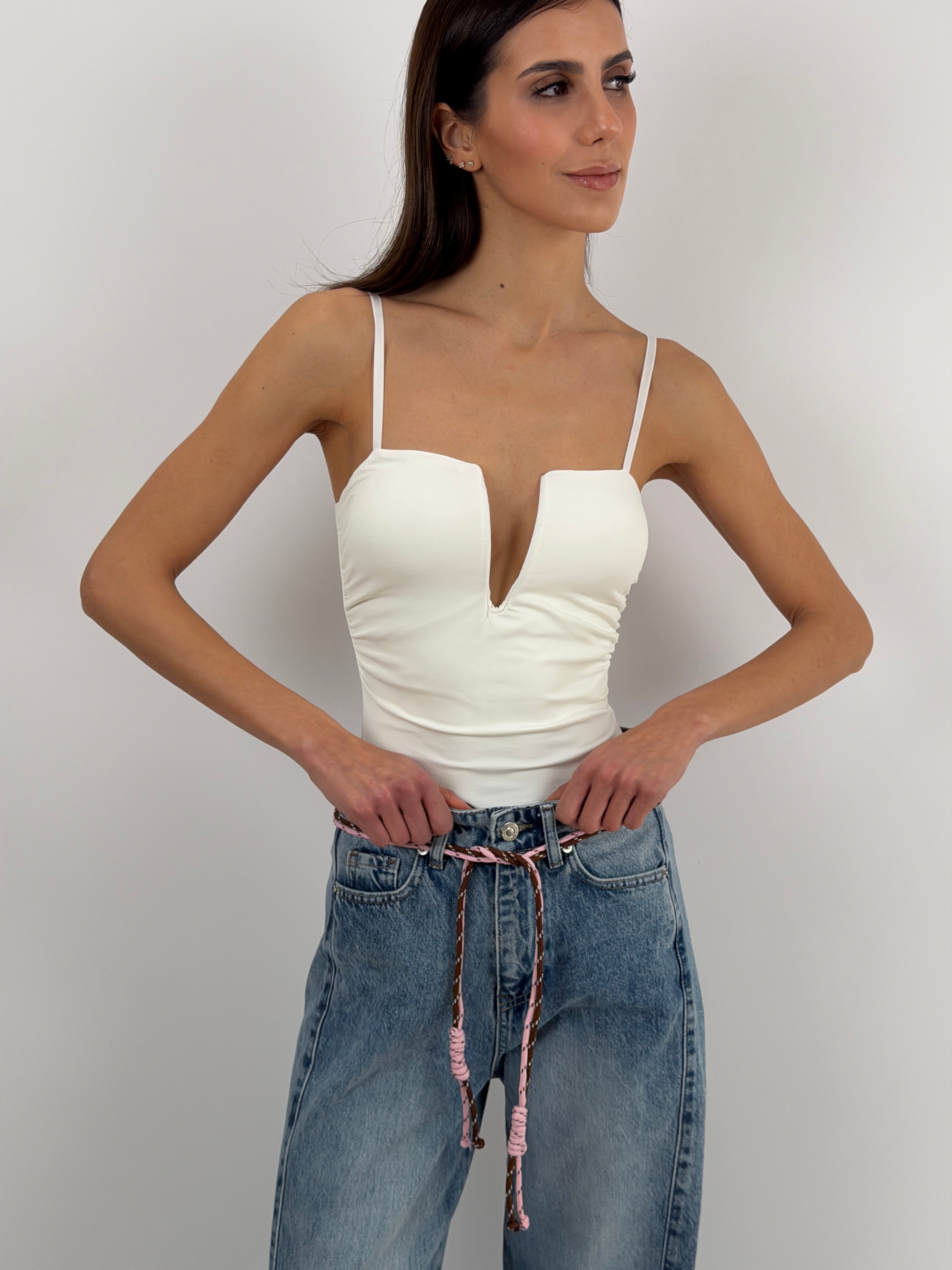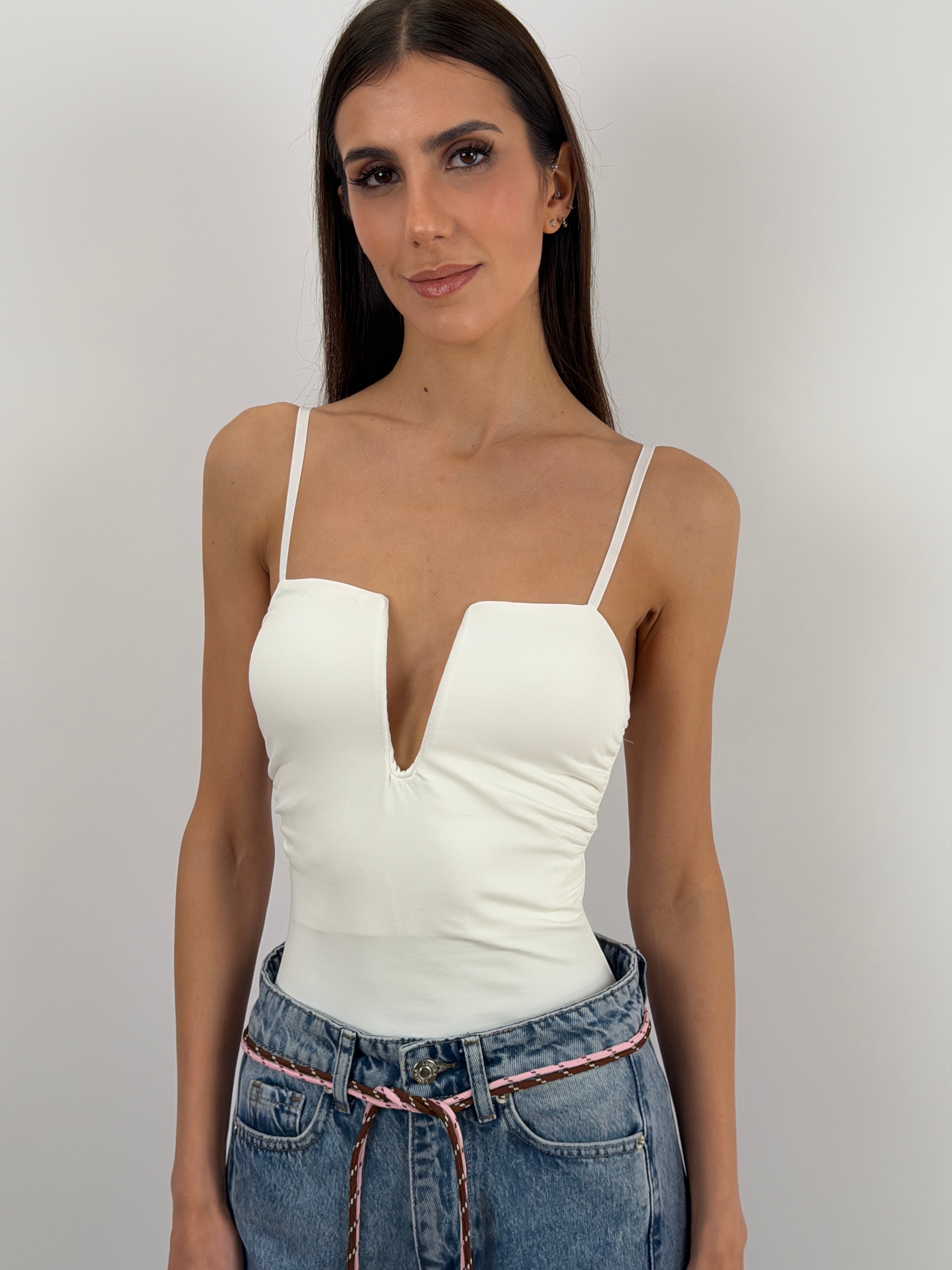 Body bianco con spalline regolabili, scollatura a V e arricciature laterali. Coppe preformate e tessuto elasticizzato