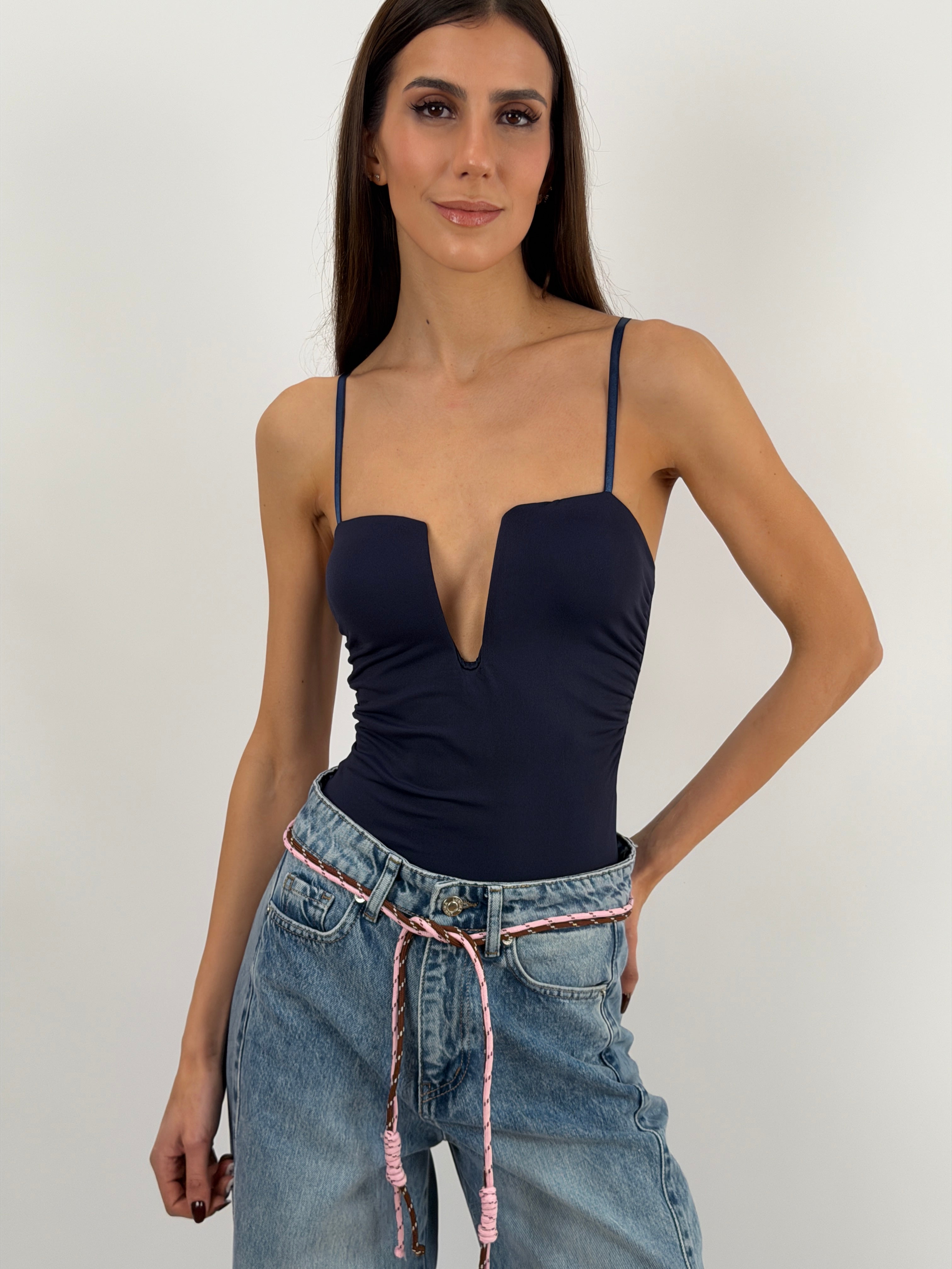 Body blu con spalline regolabili, scollatura a V e arricciature laterali. Coppe preformate e tessuto elasticizzato