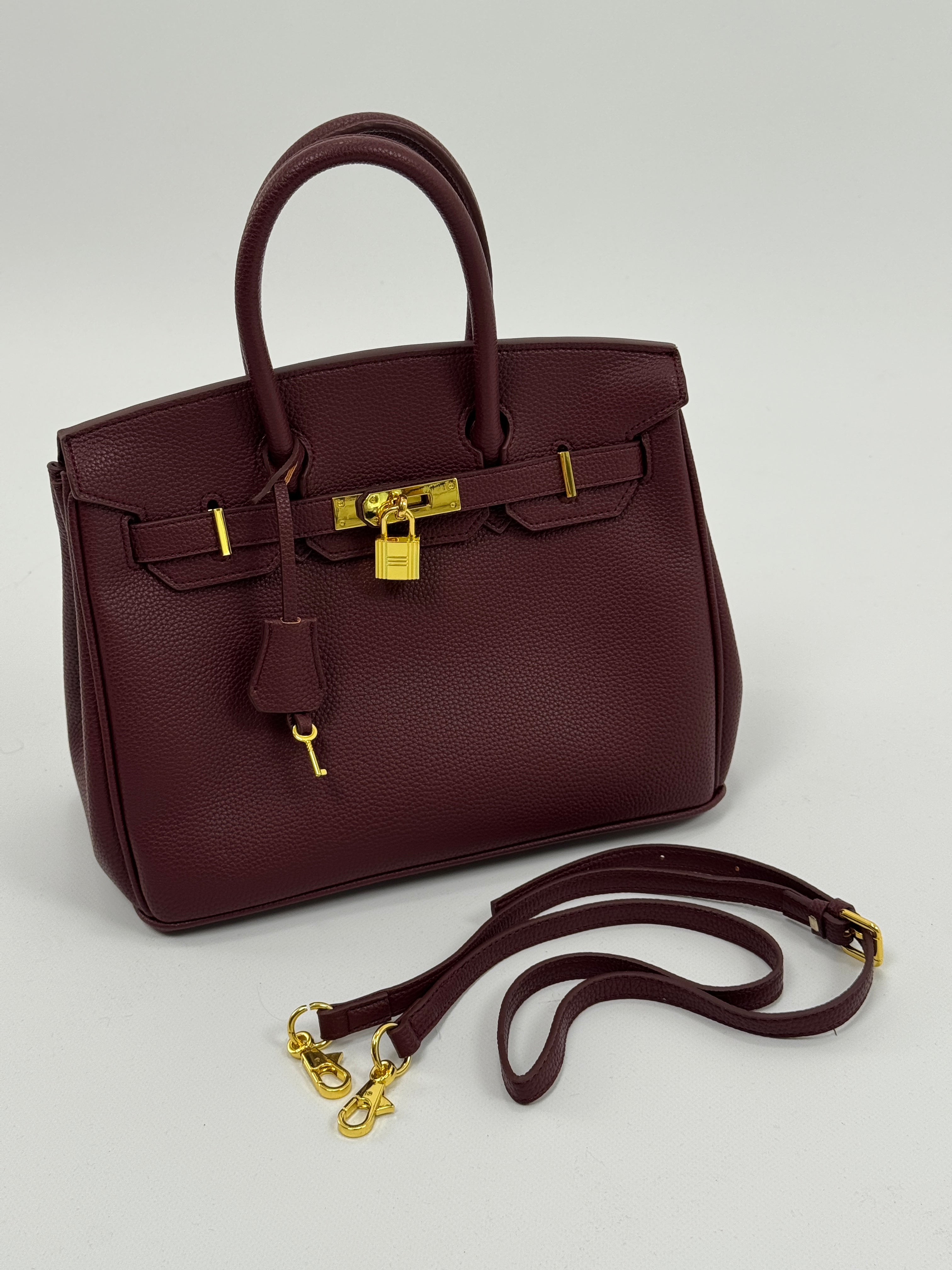 Borsa ampia bordeaux effetto pelle martellata con due manici, chiusura con fibbia e lucchetto, pendaglio con chiave, tracolla in dotazione e tasca interna con zip.
