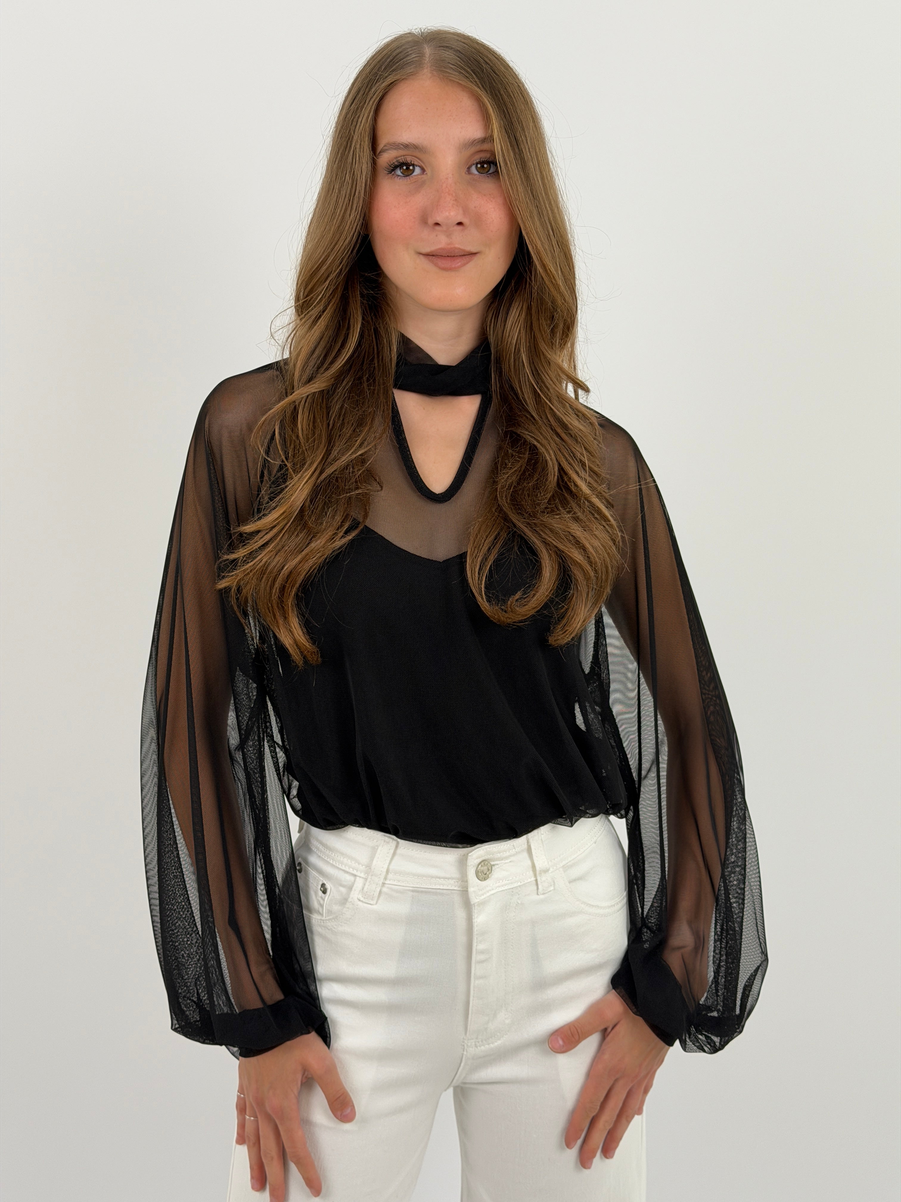 Blusa in tulle nera con cut out a triangolo sul davanti e collo avvolto, maniche lunghe leggere e fit elegante per look raffinati.