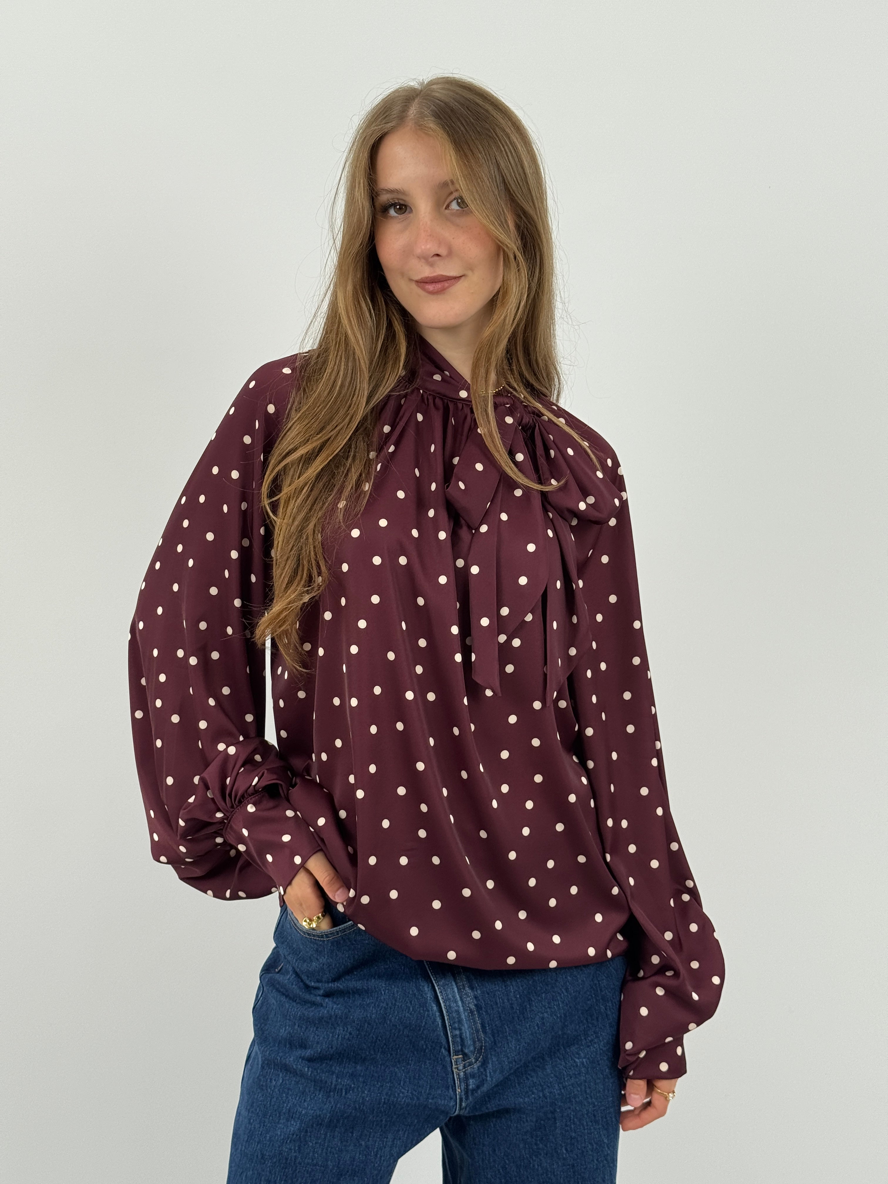 Blusa burgundy in tessuto satinato con pois a contrasto, nodo frontale e maniche ampie.