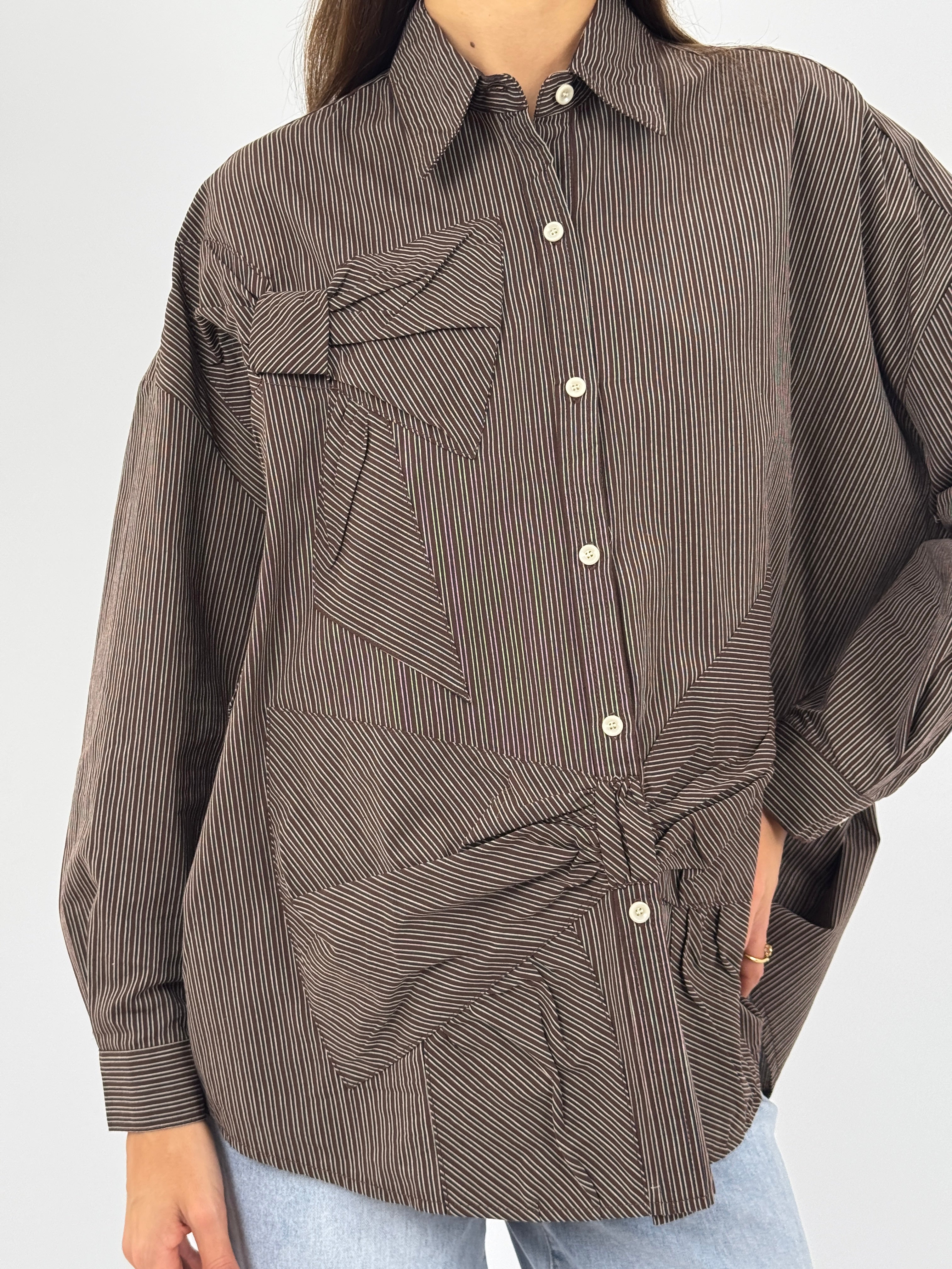 Camicia marrone in cotone a righe con fiocchi frontali, colletto classico e chiusura con bottoni.
