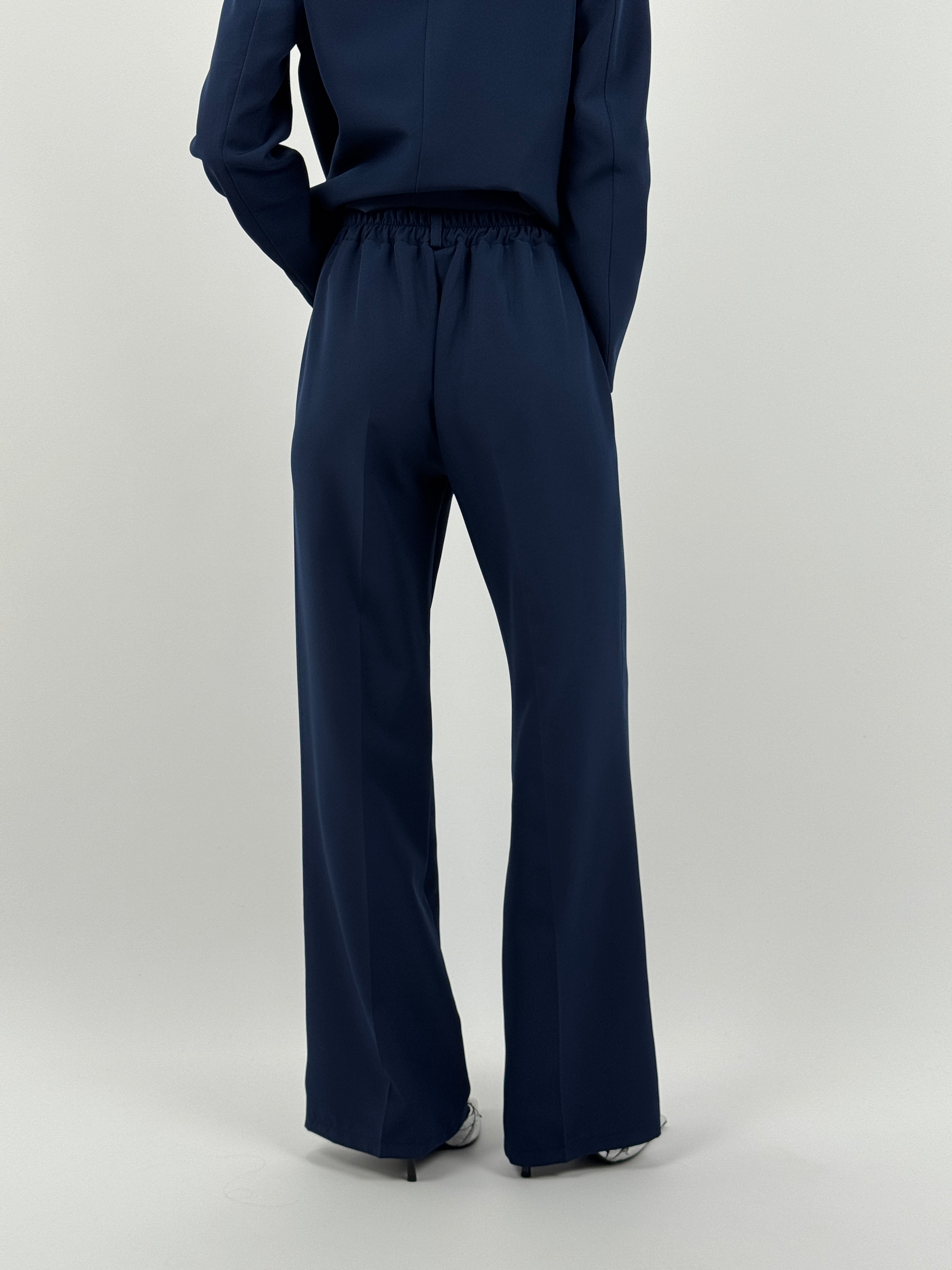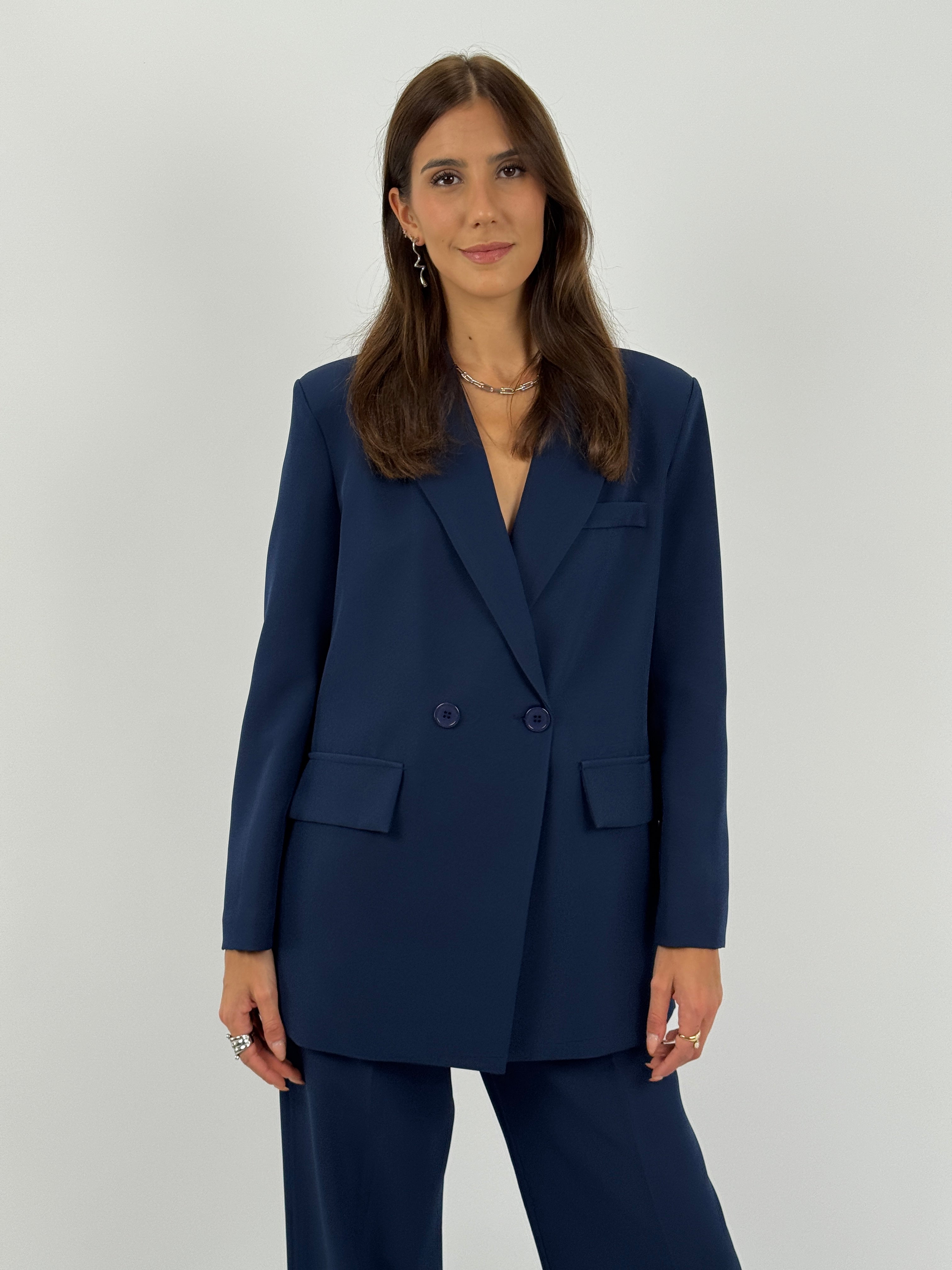 Tailleur blu con giacca doppiopetto con fodera interna, abbinata a pantalone a palazzo con tasche laterali, chiusura zip e bottone, elastico sul retro.