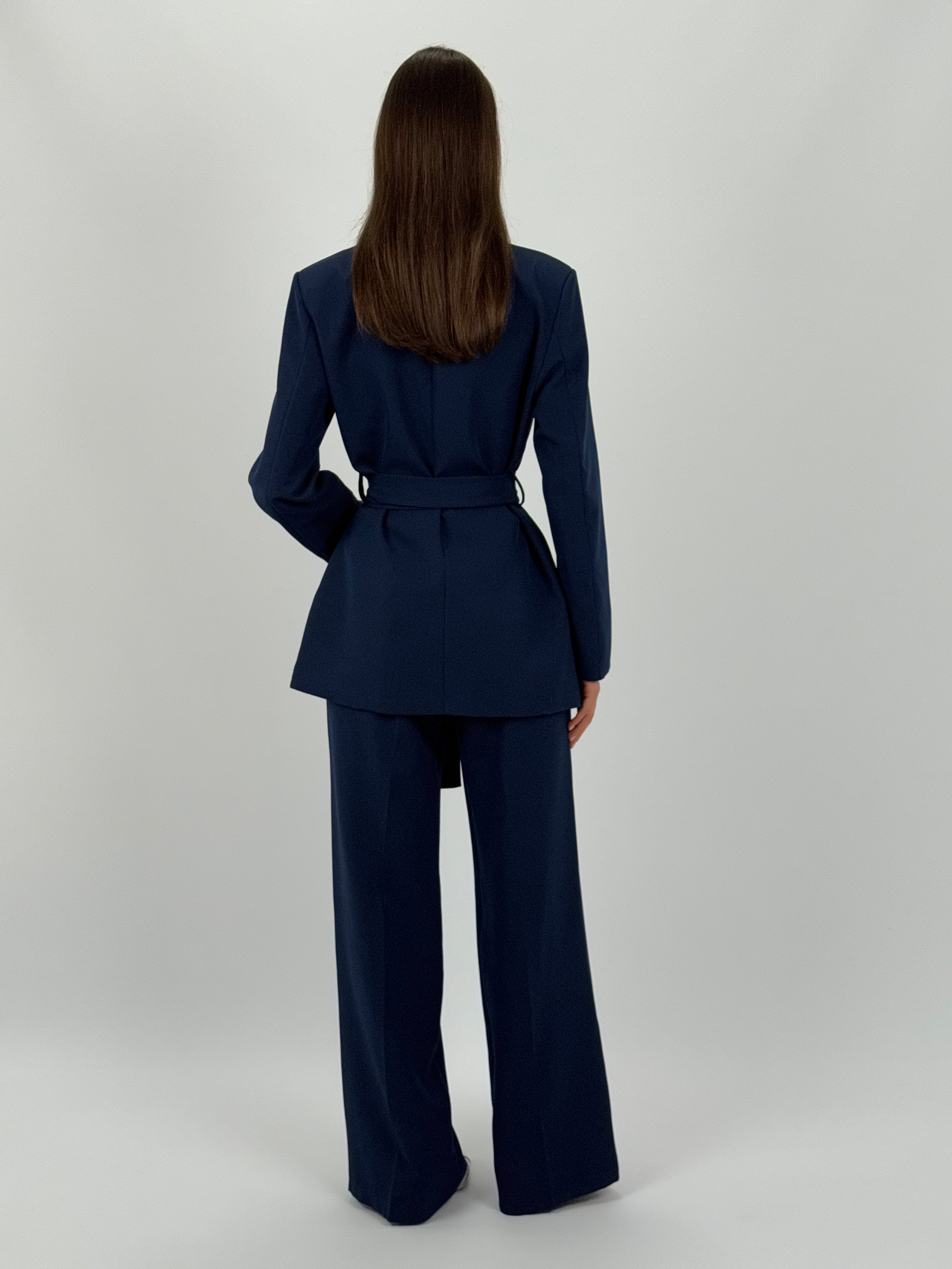 Tailleur blu con giacca doppiopetto dotata di cintura e fodera interna, abbinata a pantalone a palazzo con tasche laterali, chiusura zip e bottone, elastico sul retro.