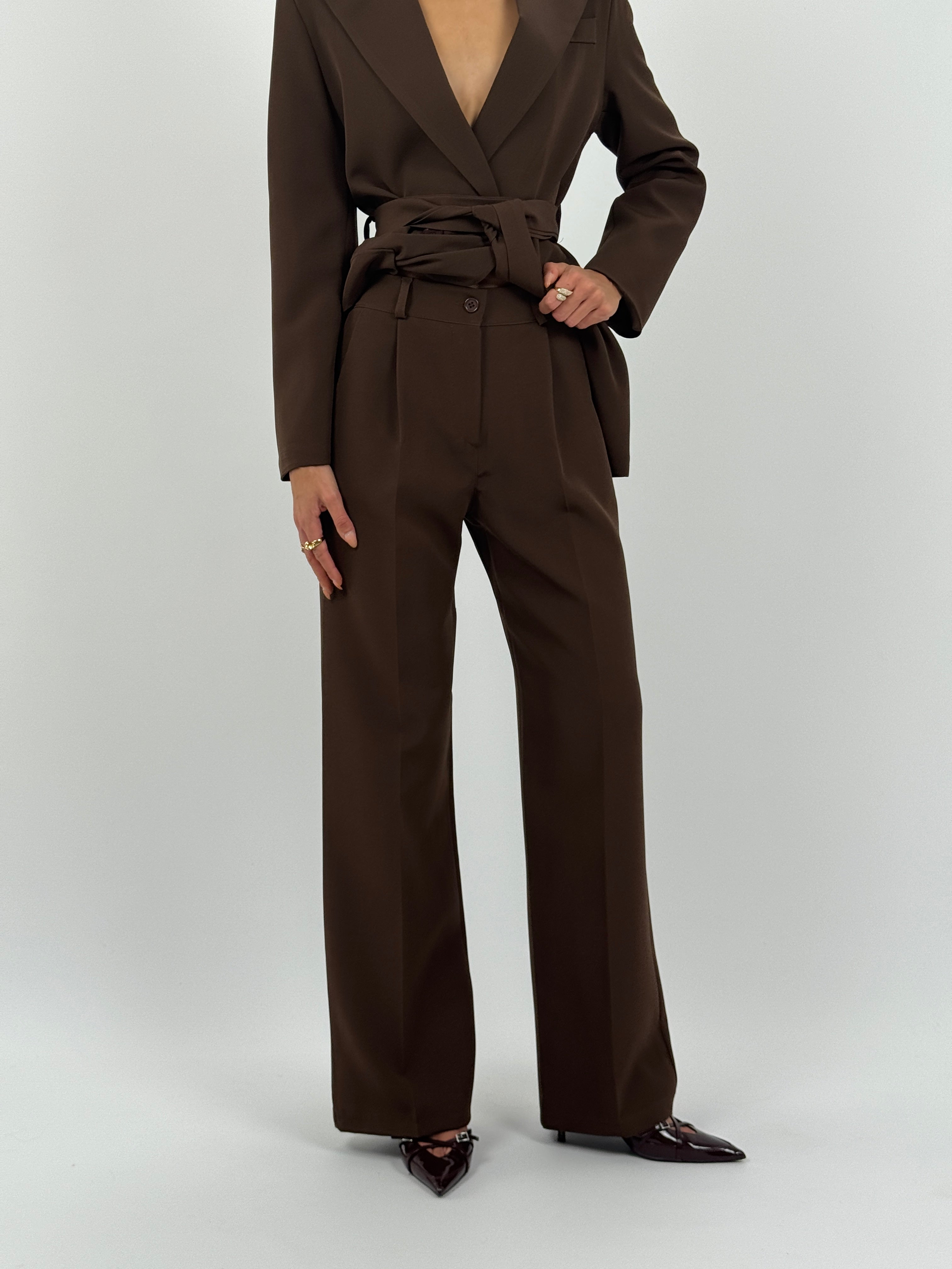 Tailleur marrone con giacca doppiopetto dotata di cintura e fodera interna, abbinata a pantalone a palazzo con tasche laterali, chiusura zip e bottone, elastico sul retro.