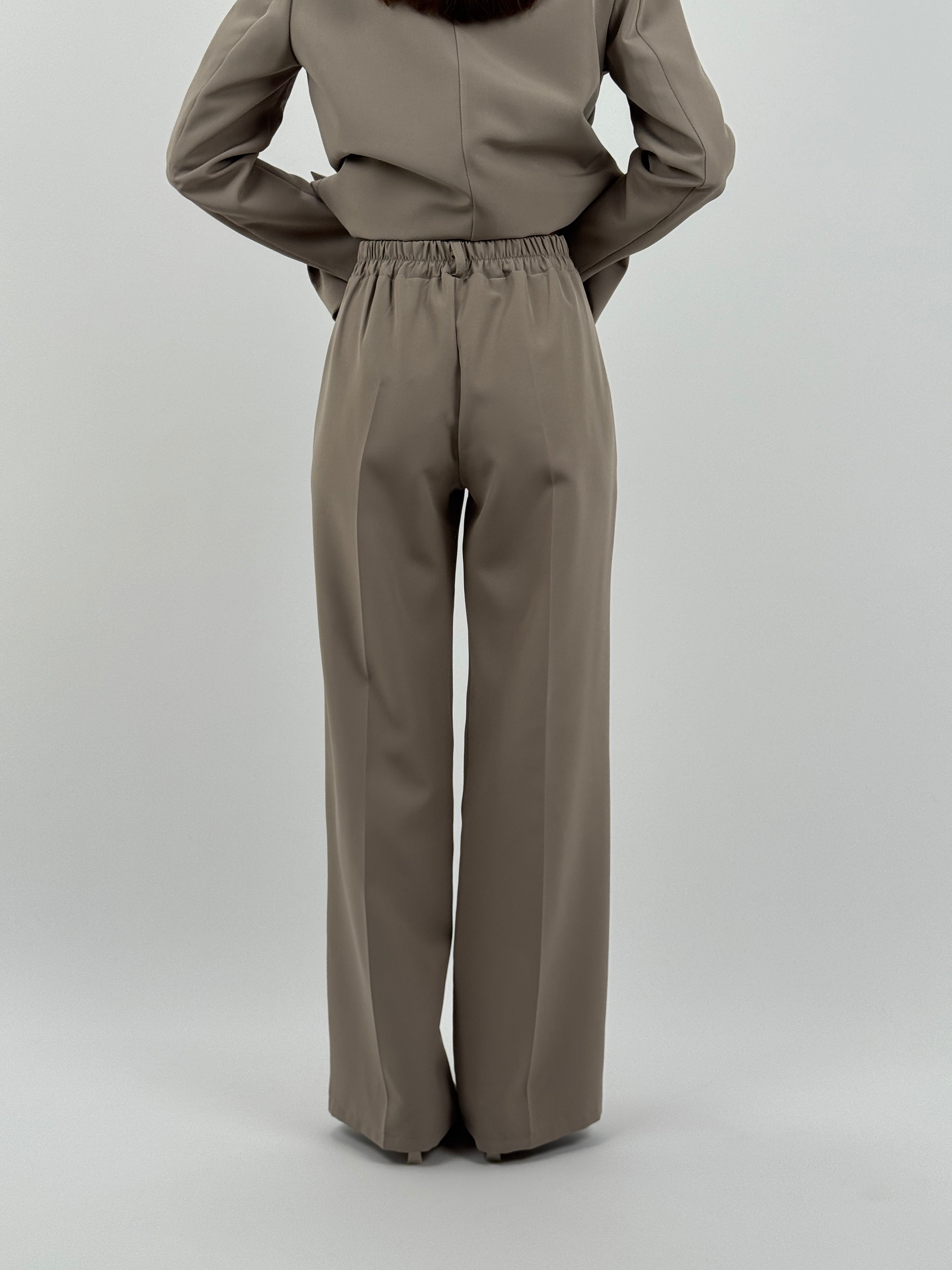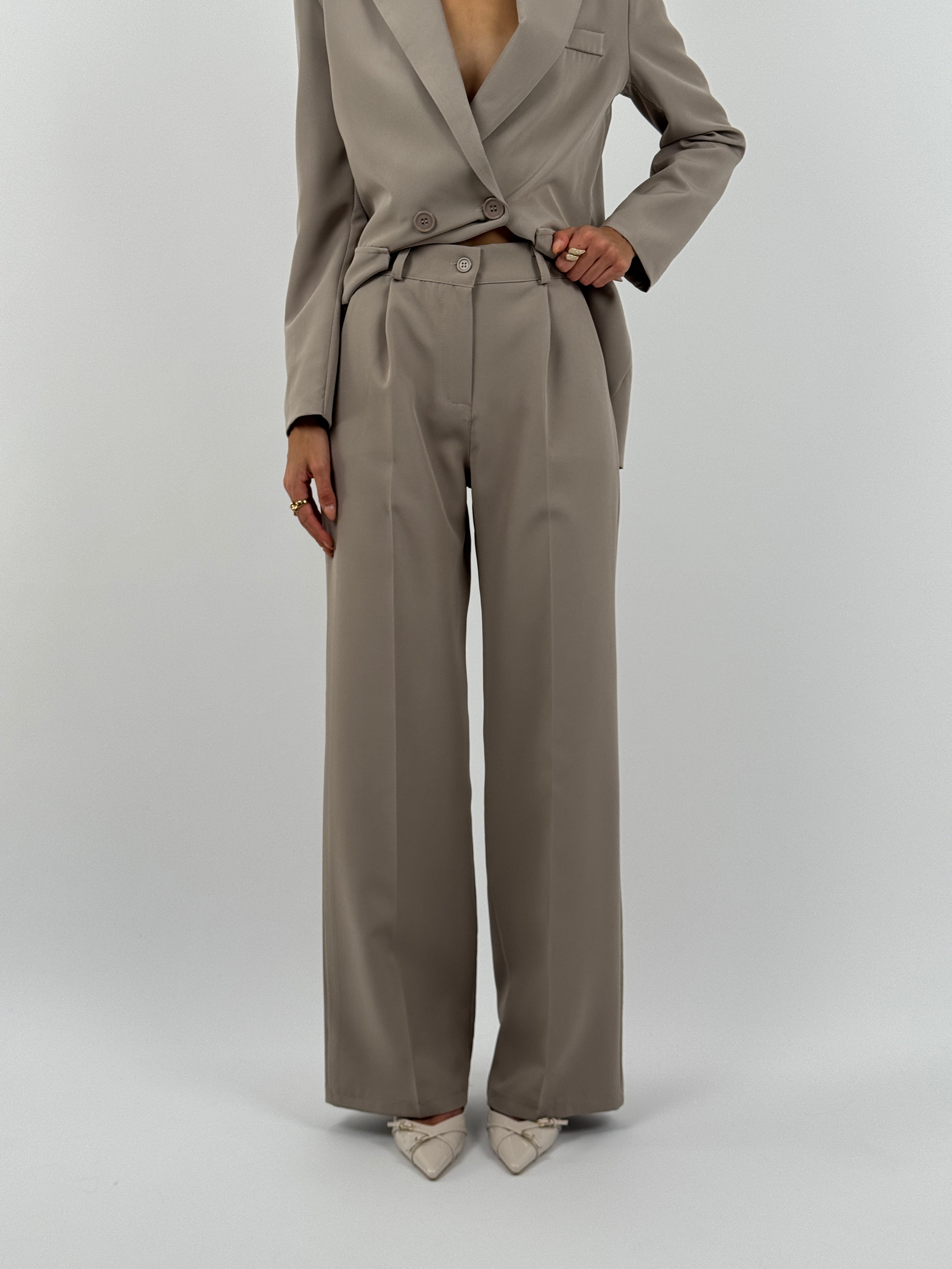 Tailleur tortora con giacca doppiopetto con fodera interna, abbinata a pantalone a palazzo con tasche laterali, chiusura zip e bottone, elastico sul retro.