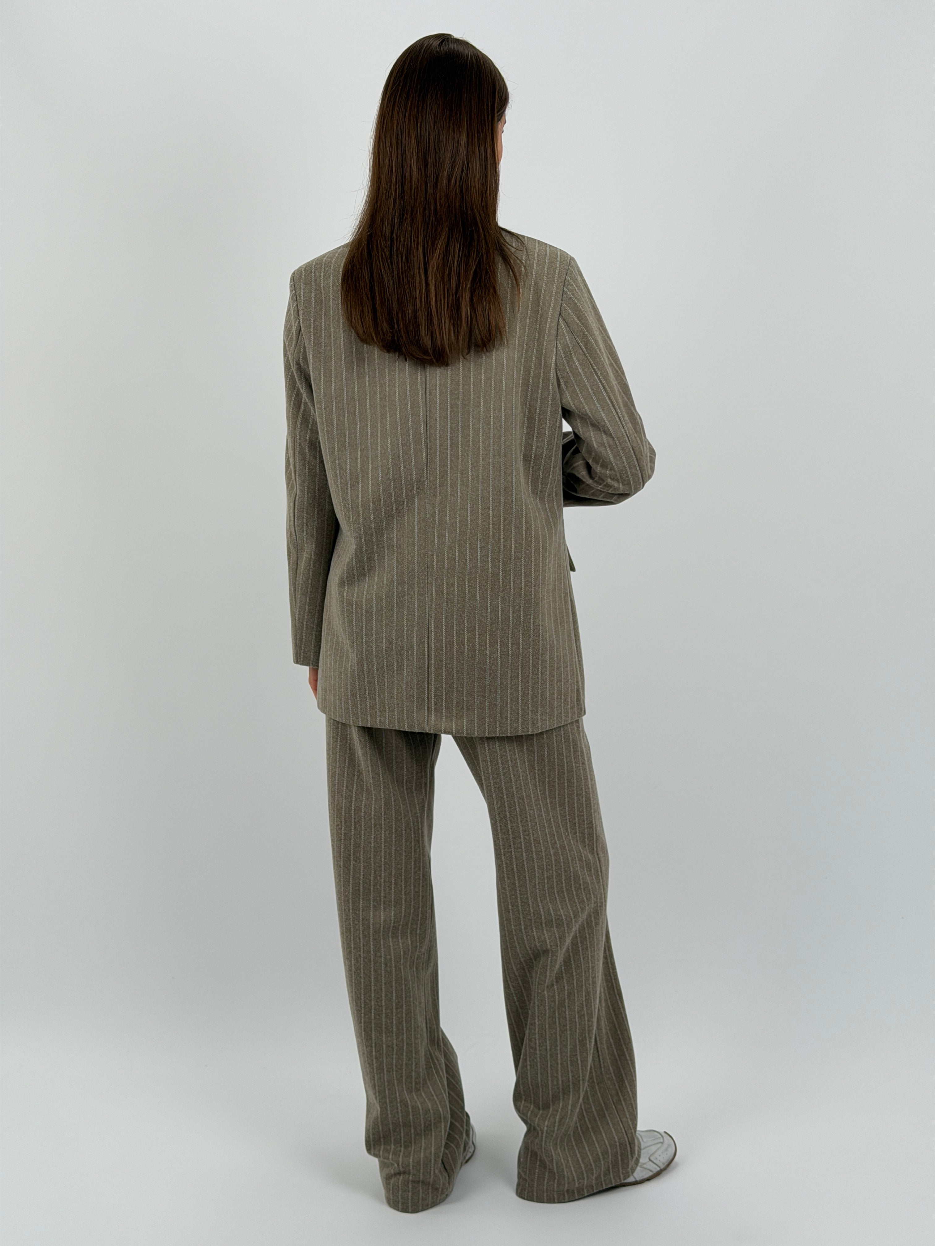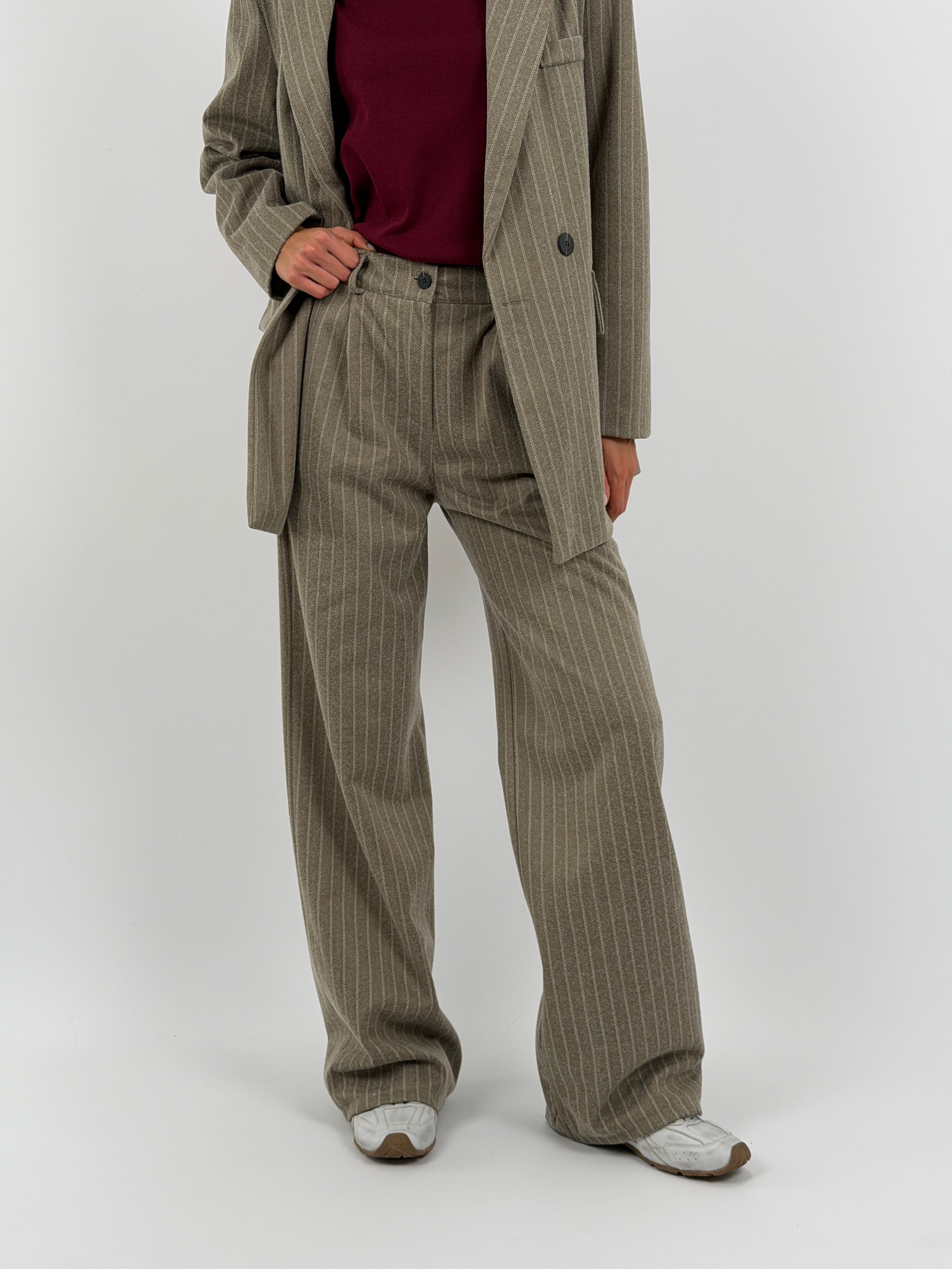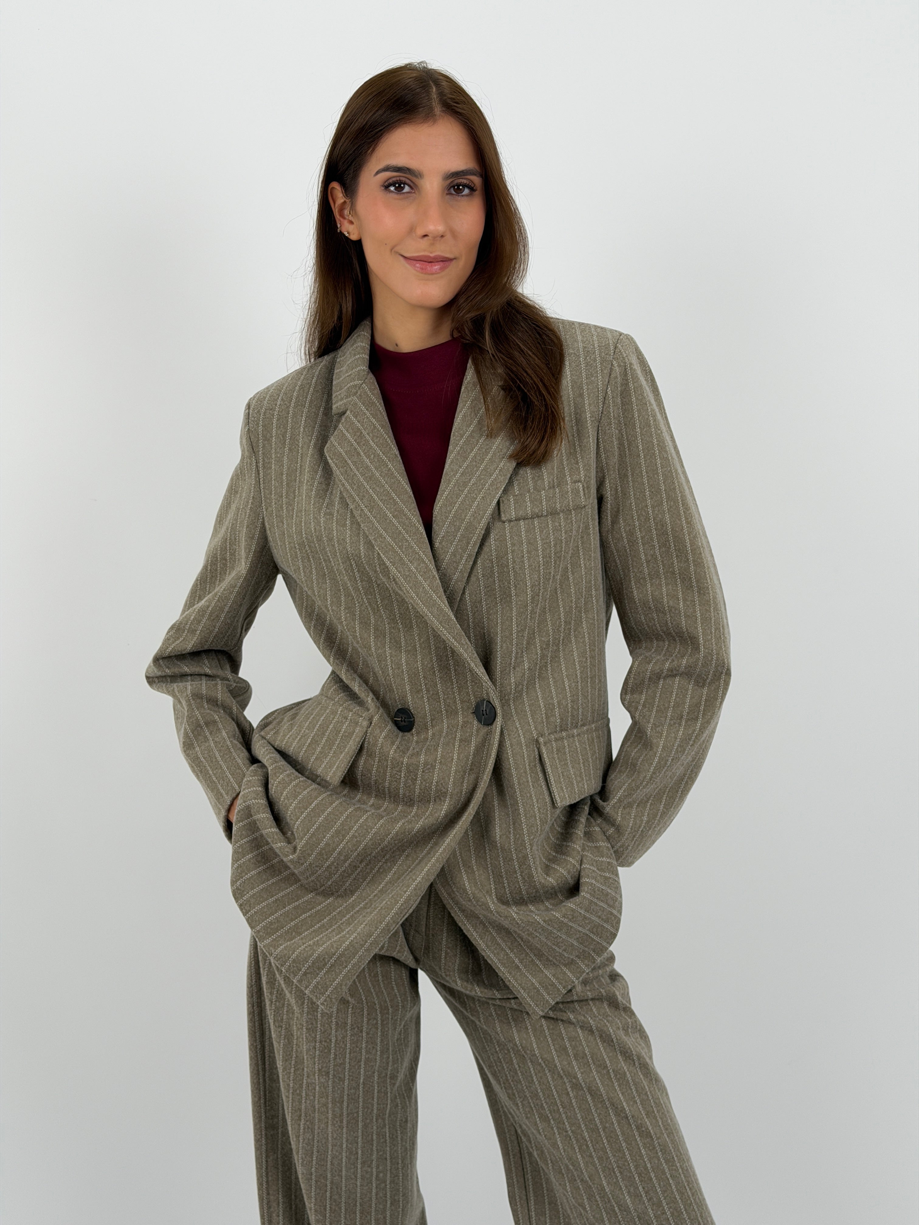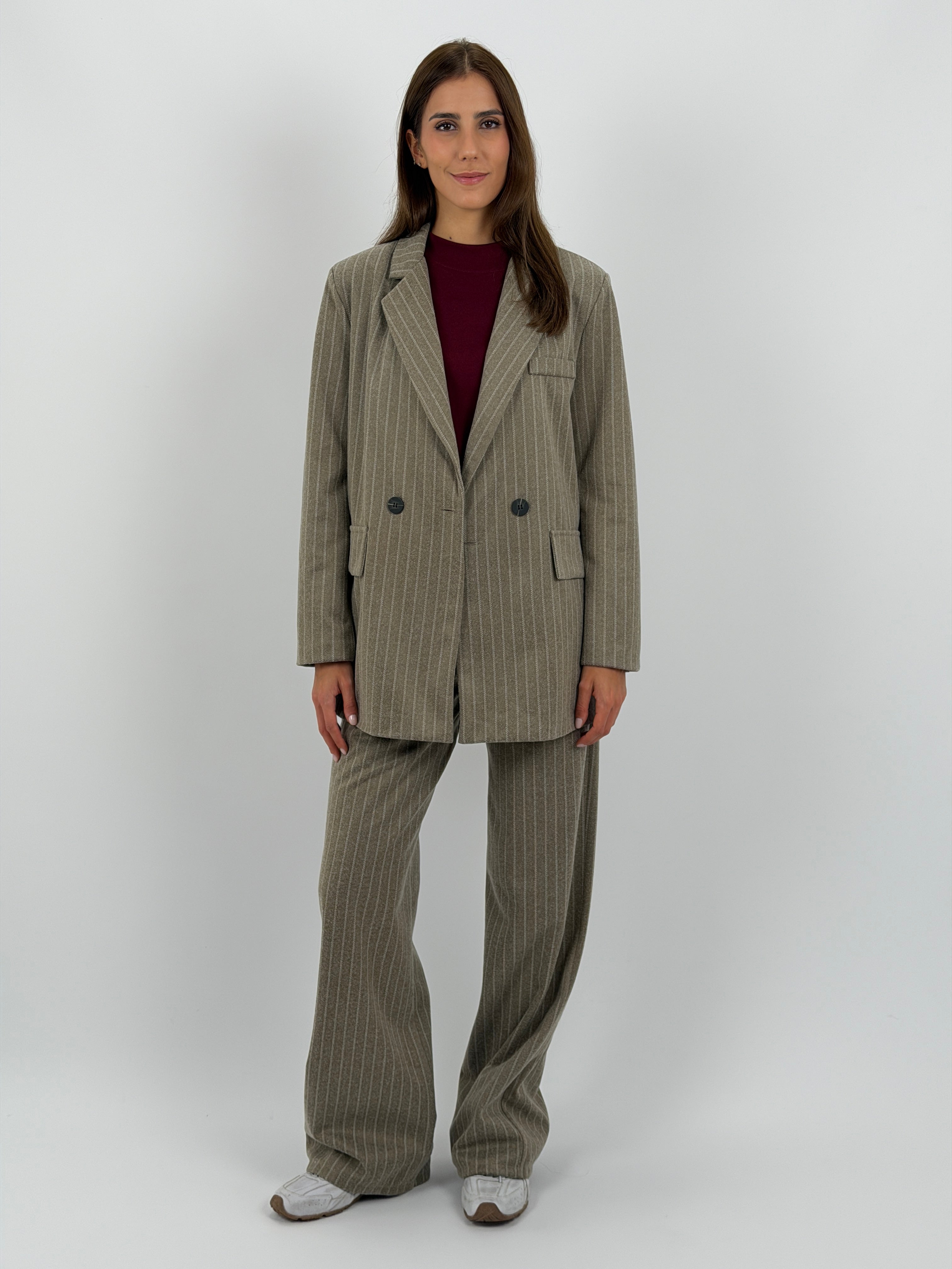 Elegante completo in panno beige gessato da donna, composto da giacca a doppio petto e pantaloni a palazzo. La giacca ha chiusura con bottoni, mentre il pantalone presenta un elastico in vita.