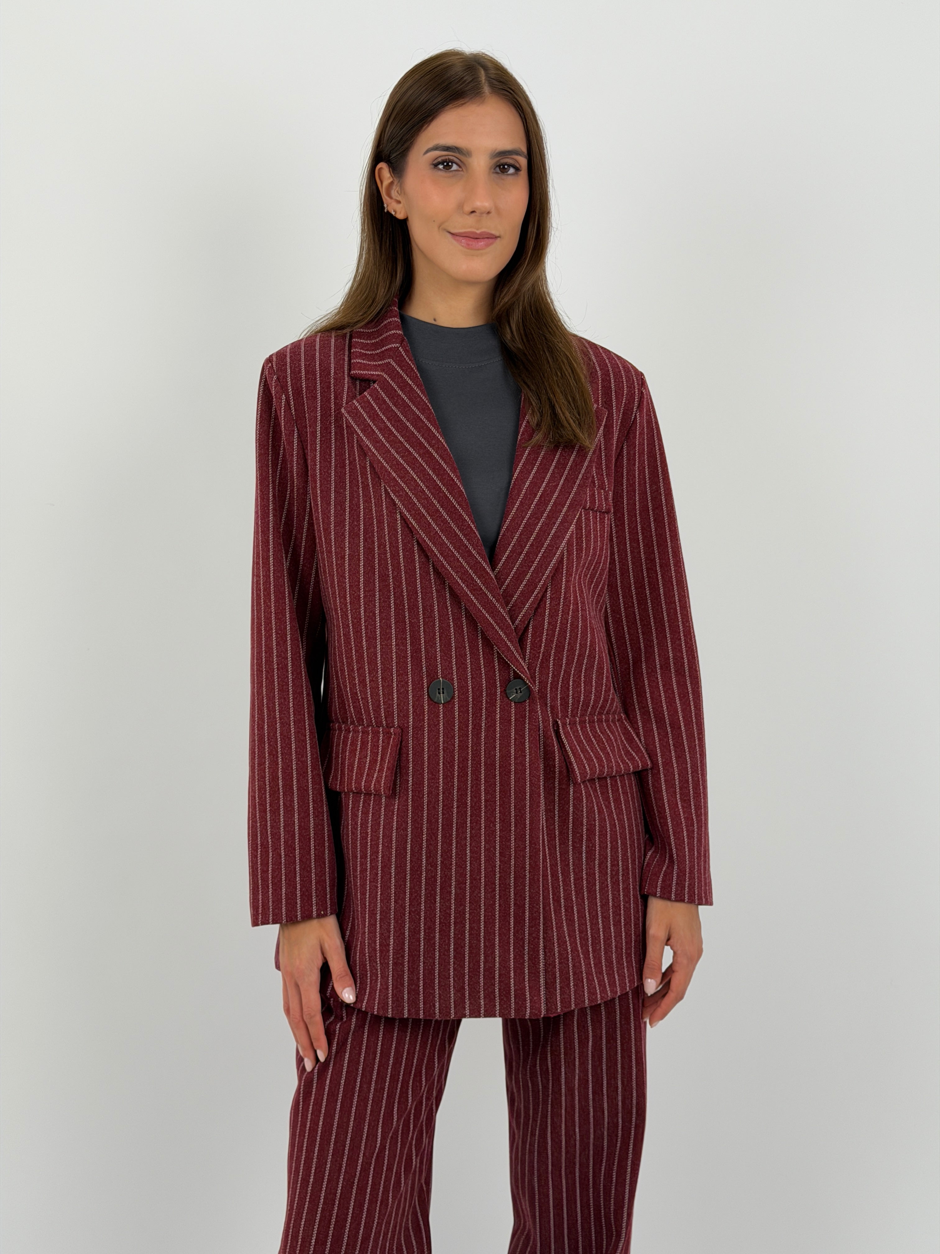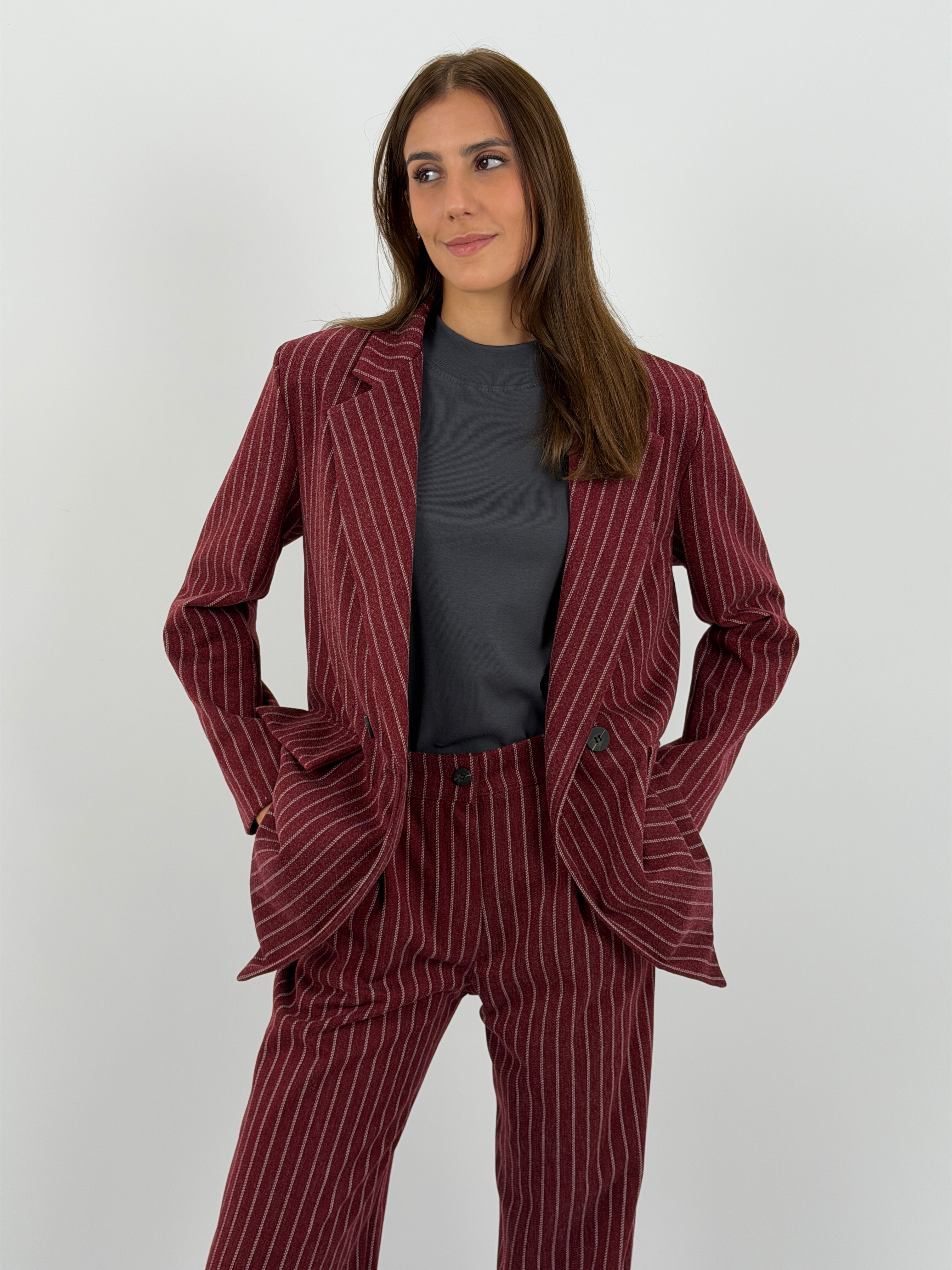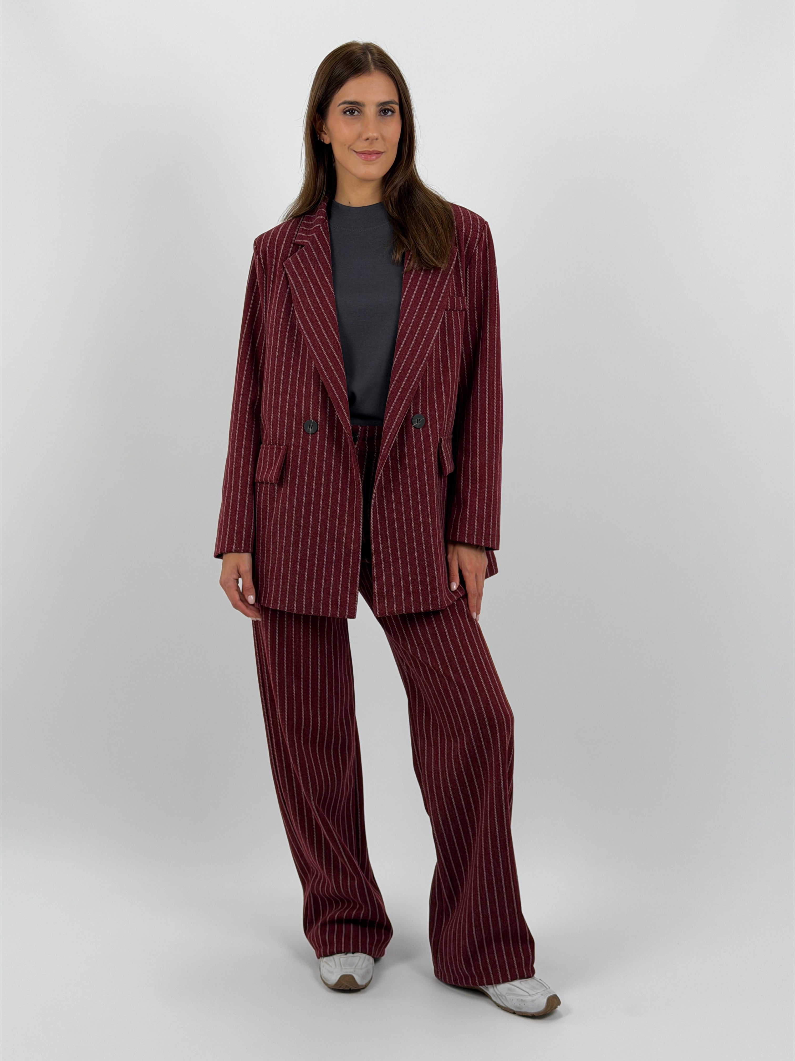 Elegante completo in panno bordeaux gessato da donna, composto da giacca a doppio petto e pantaloni a palazzo. La giacca ha chiusura con bottoni, mentre il pantalone presenta un elastico in vita.