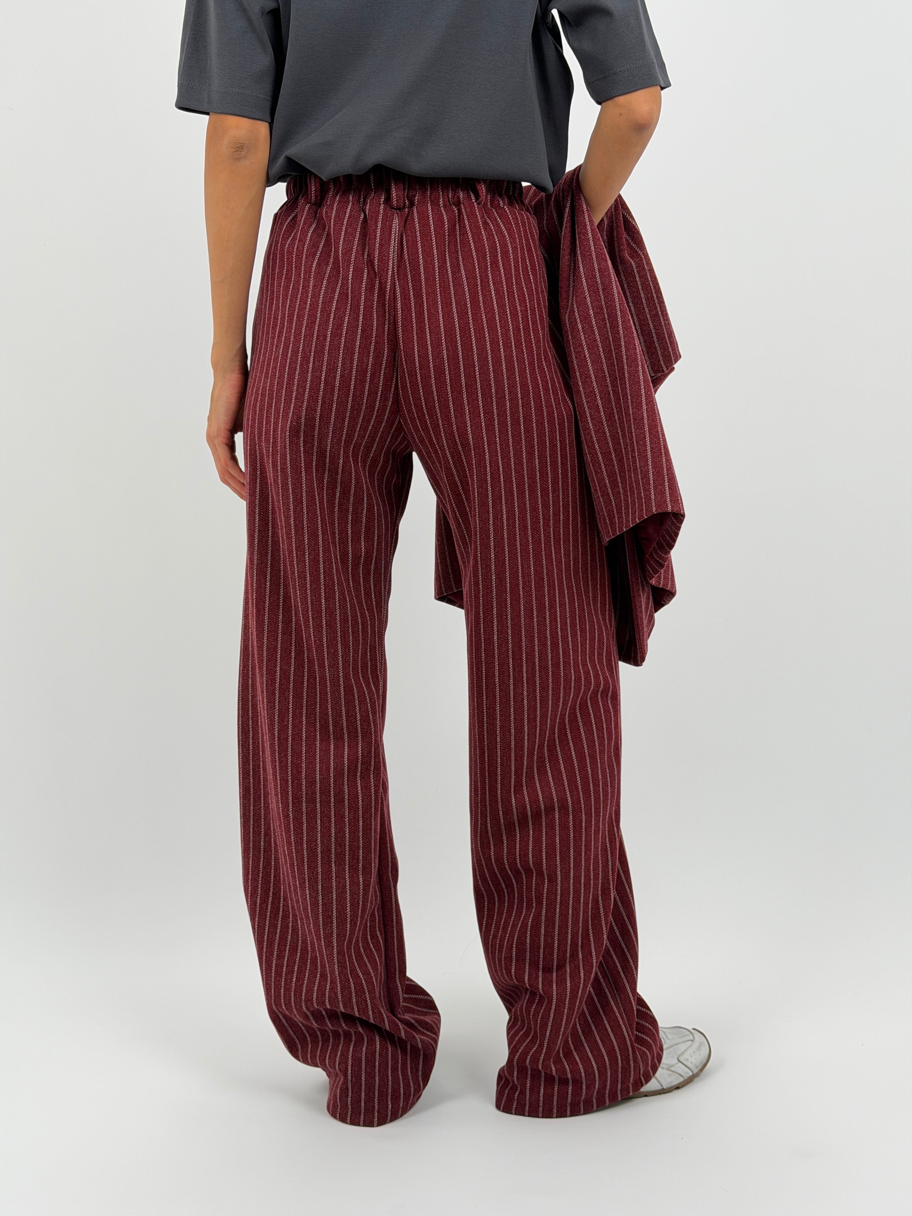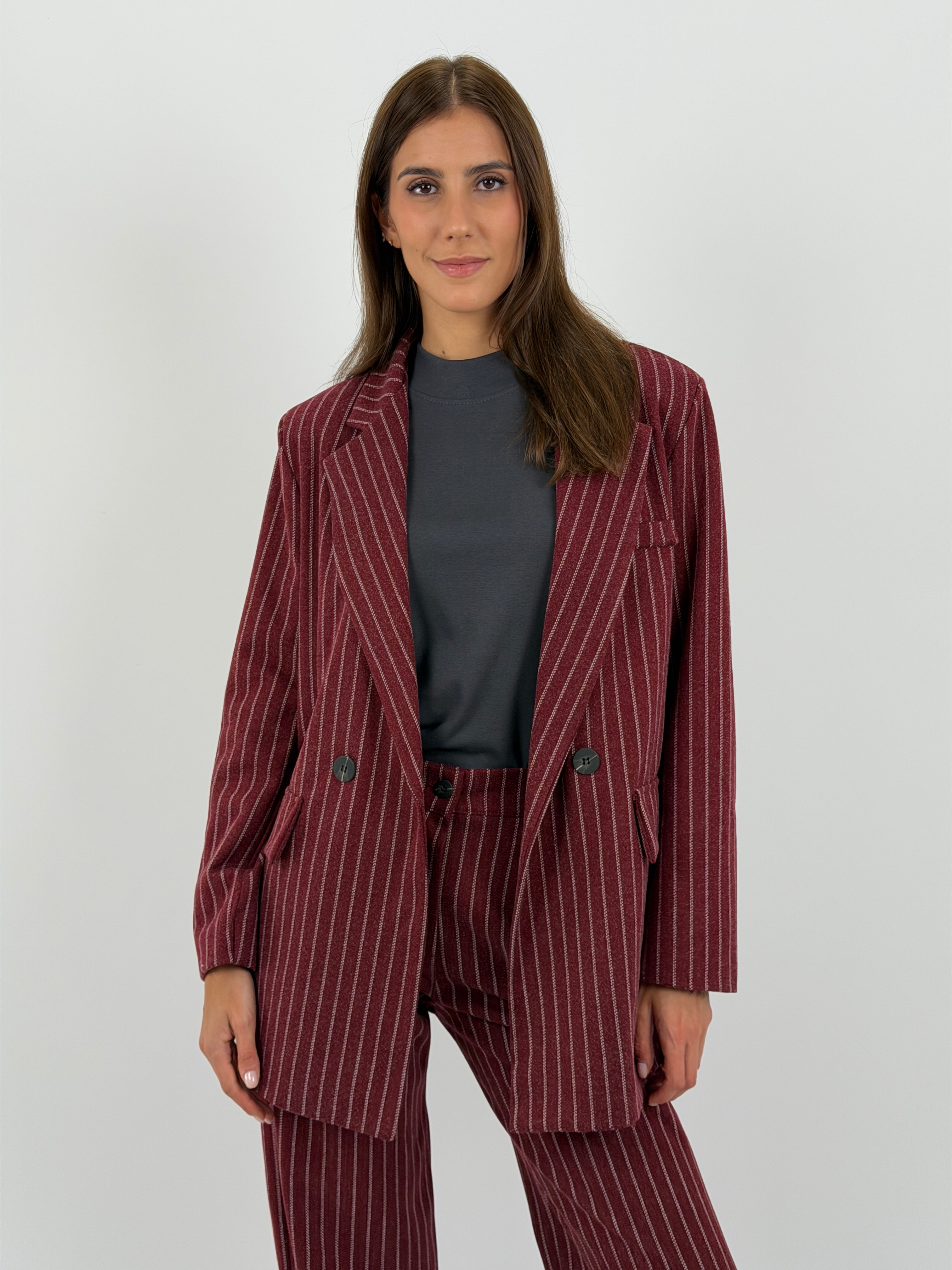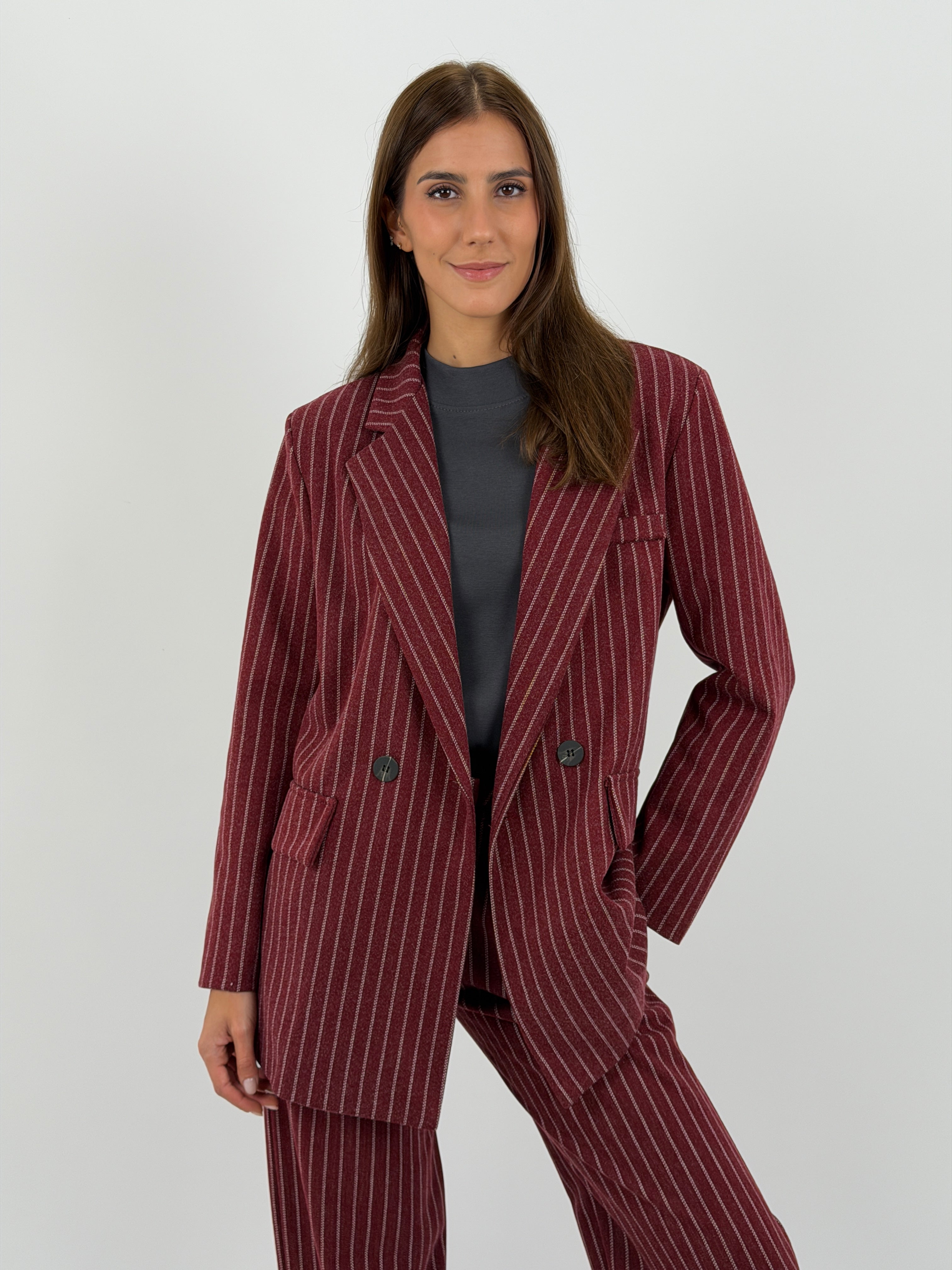 Elegante completo in panno bordeaux gessato da donna, composto da giacca a doppio petto e pantaloni a palazzo. La giacca ha chiusura con bottoni, mentre il pantalone presenta un elastico in vita.