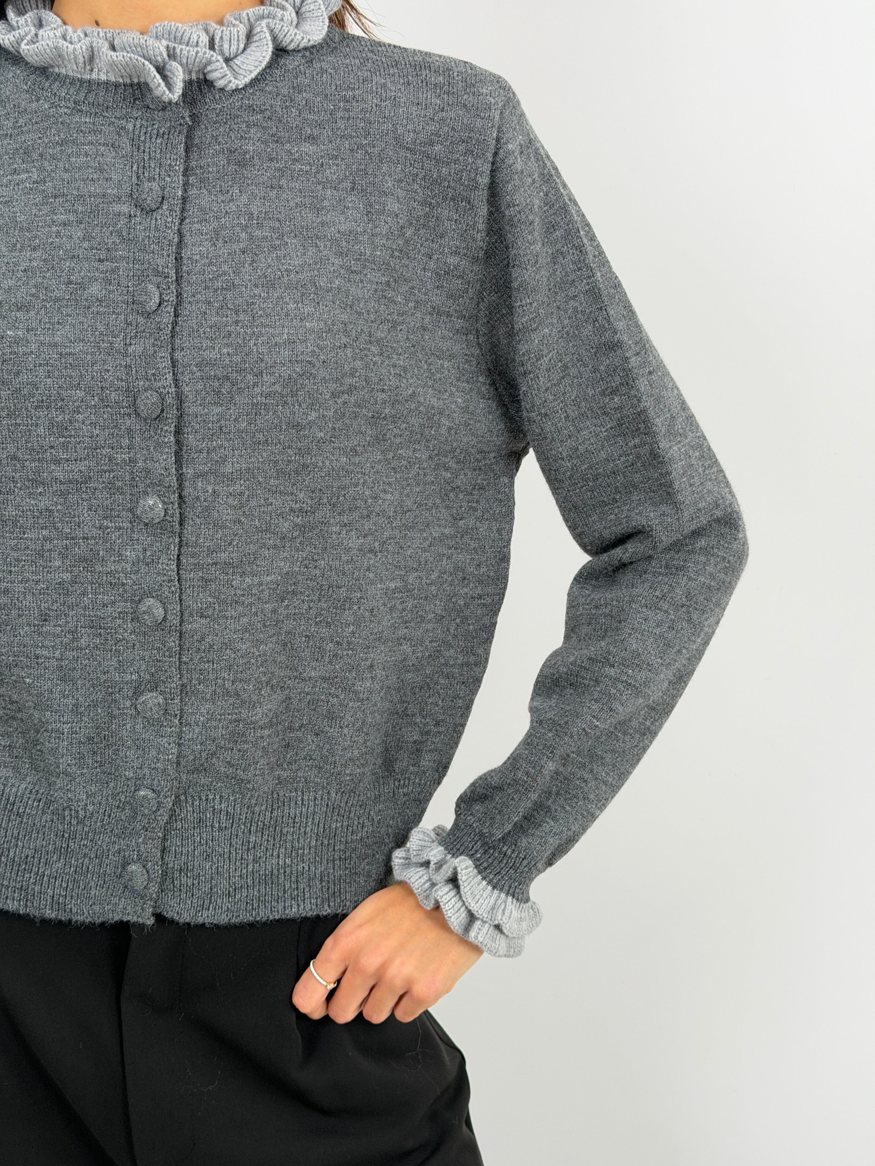 Maglione grigio con bottoncini tono su tono, finiture a coste e volant arricciati sulle maniche.