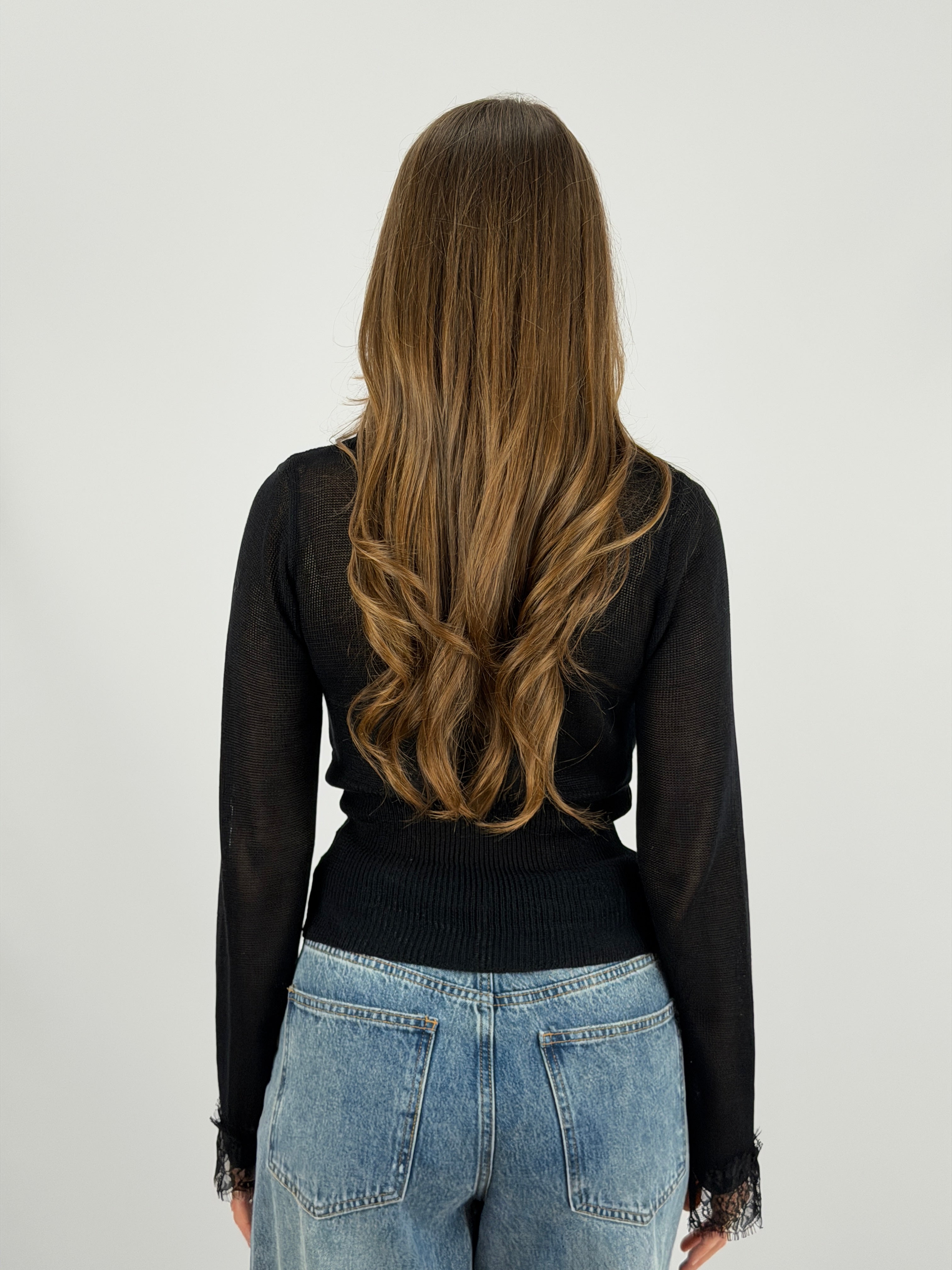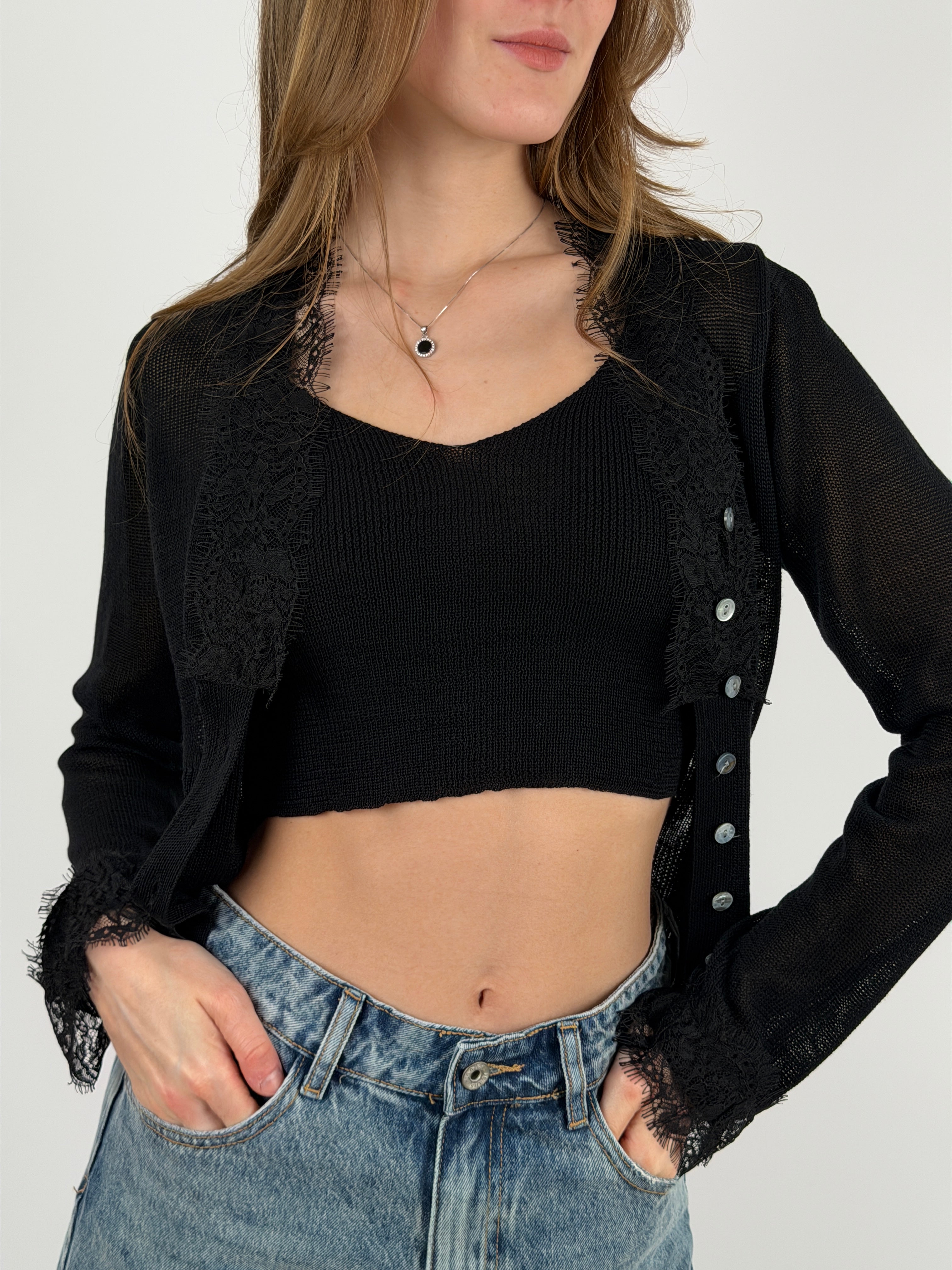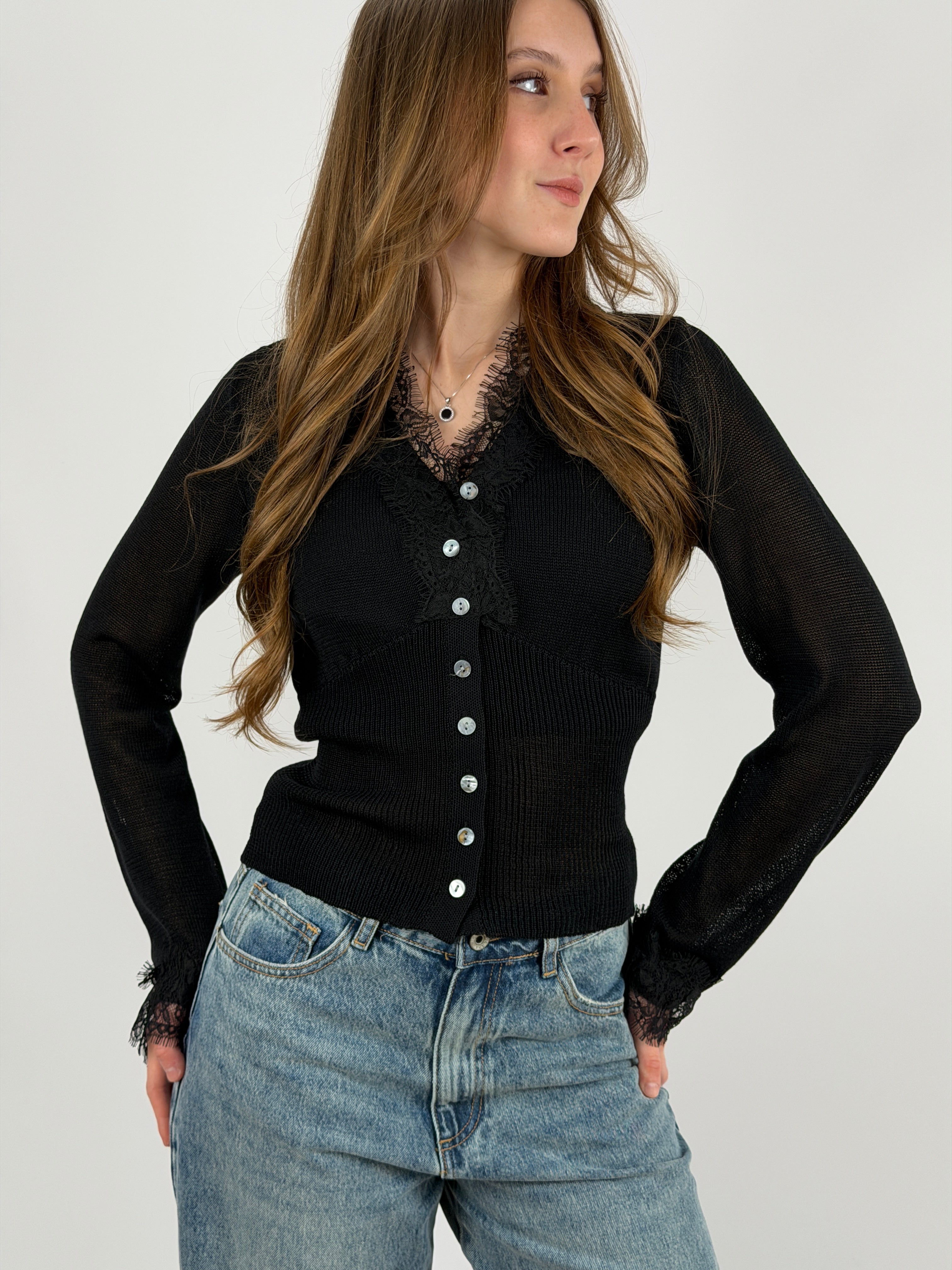 Cardigan in maglia nero con bottoni e inserti in pizzo tono su tono, caratterizzato da top incorporato con spalline sottili