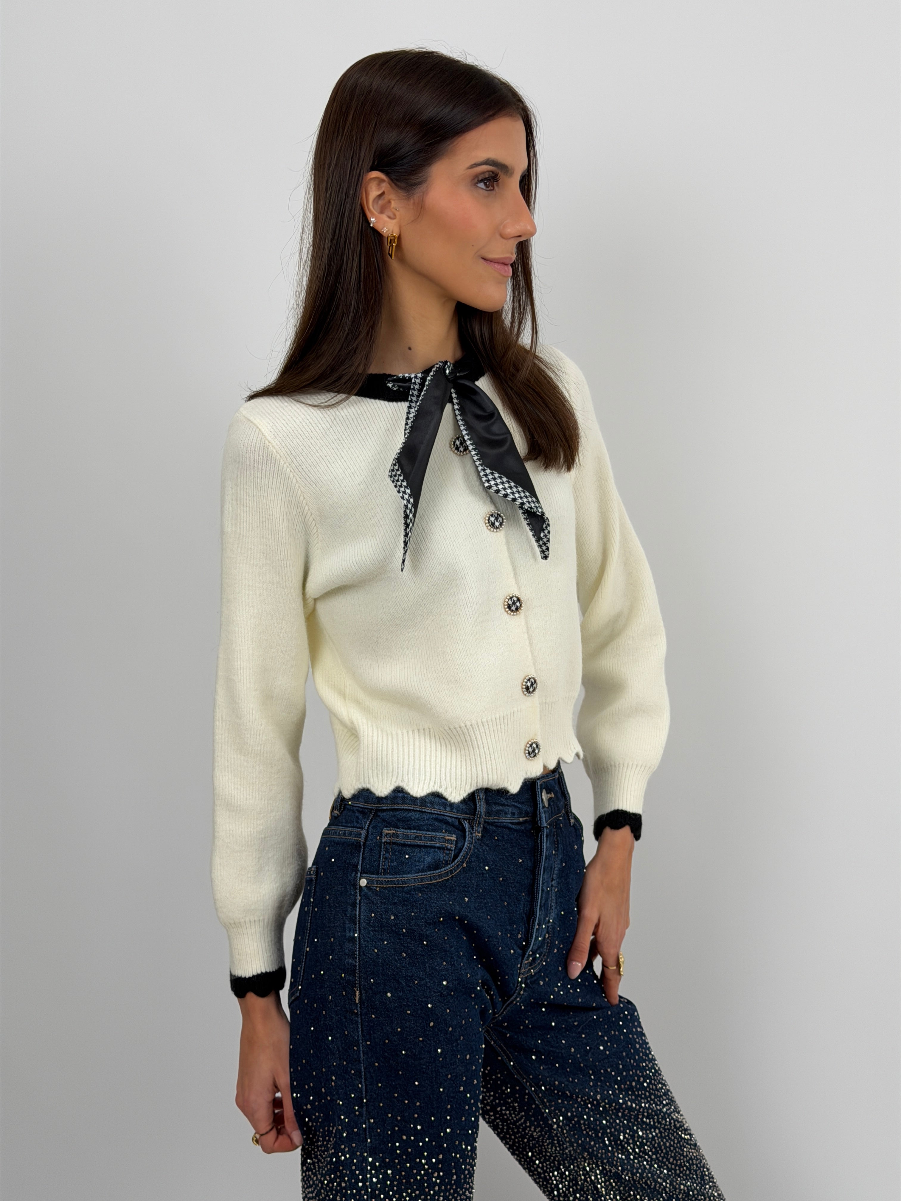 Cardigan crema con bordi a contrasto e finiture a onde, arricchito da fiocco e bottoni con motivo pied de poule.