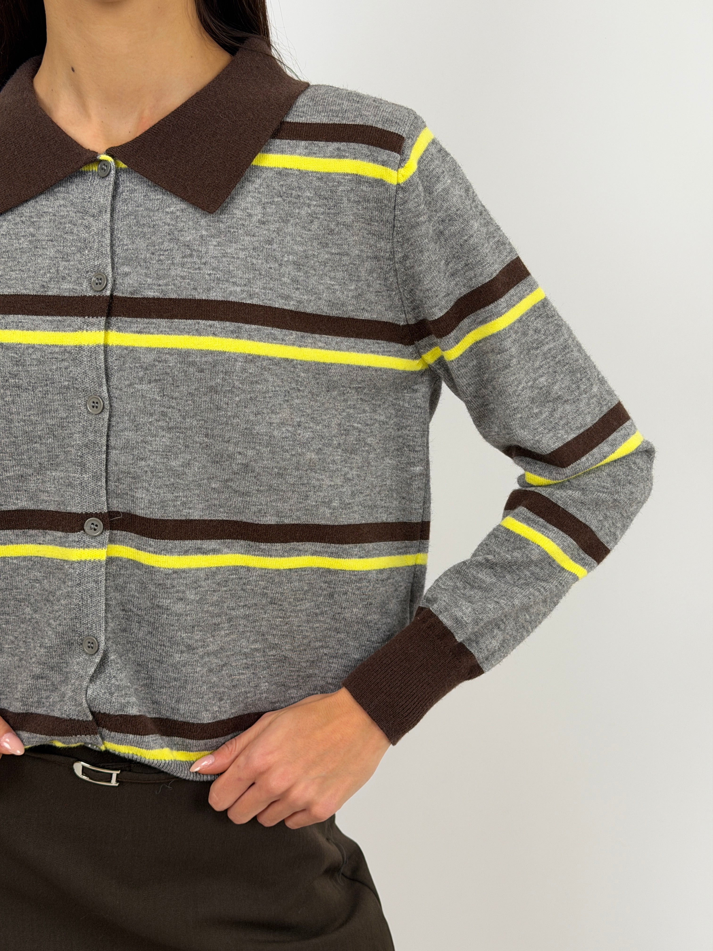 Cardigan in maglia grigio modello polo con colletto a righe marroni e gialle. Bottoncini tono su tono.