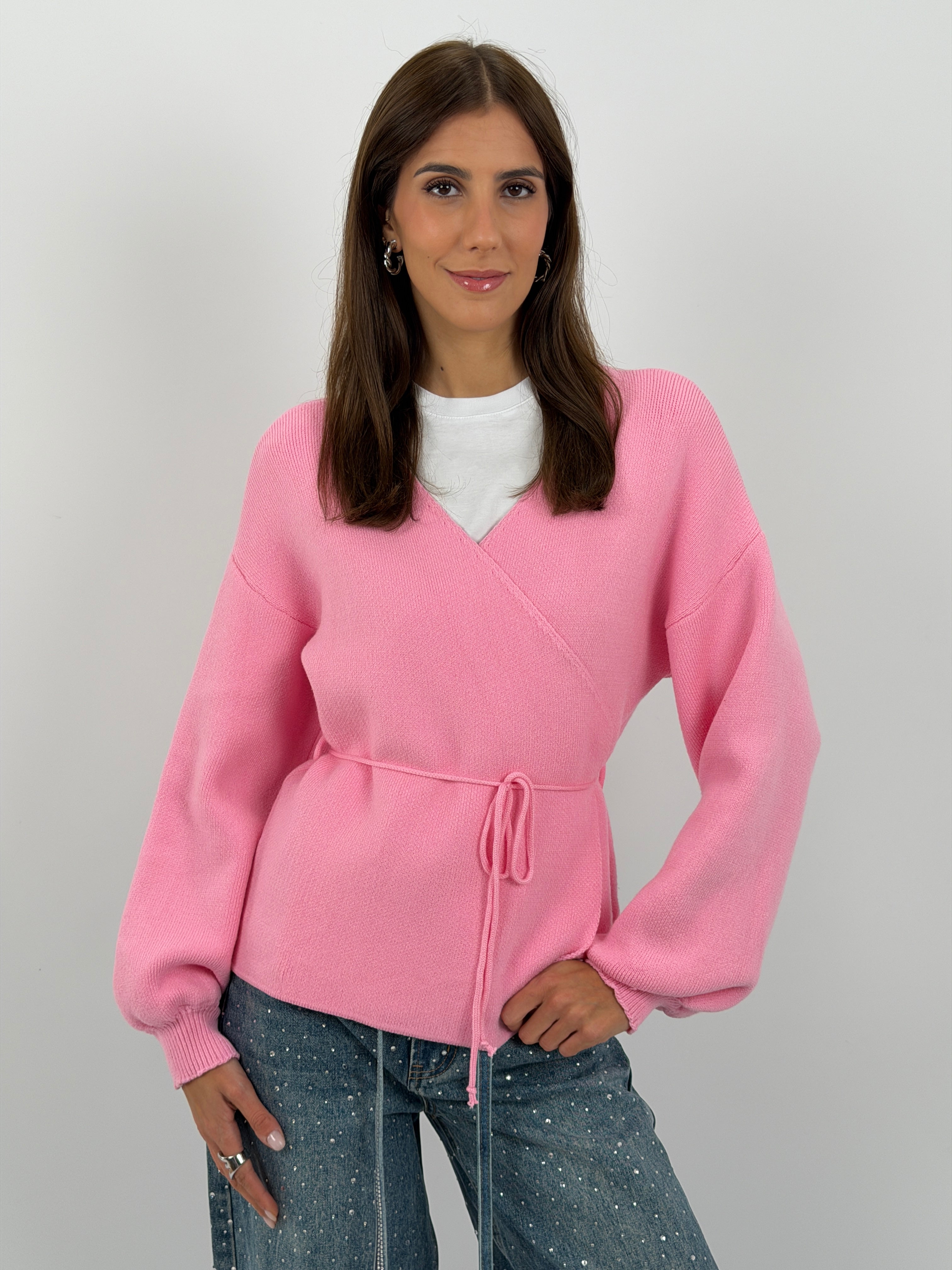 Cardigan rosa incrociato con chiusura a laccetti interni ed esterni. Scollo a V, maniche lunghe e fit versatile. Perfetto per un look casual-chic, ideale per ogni occasione.