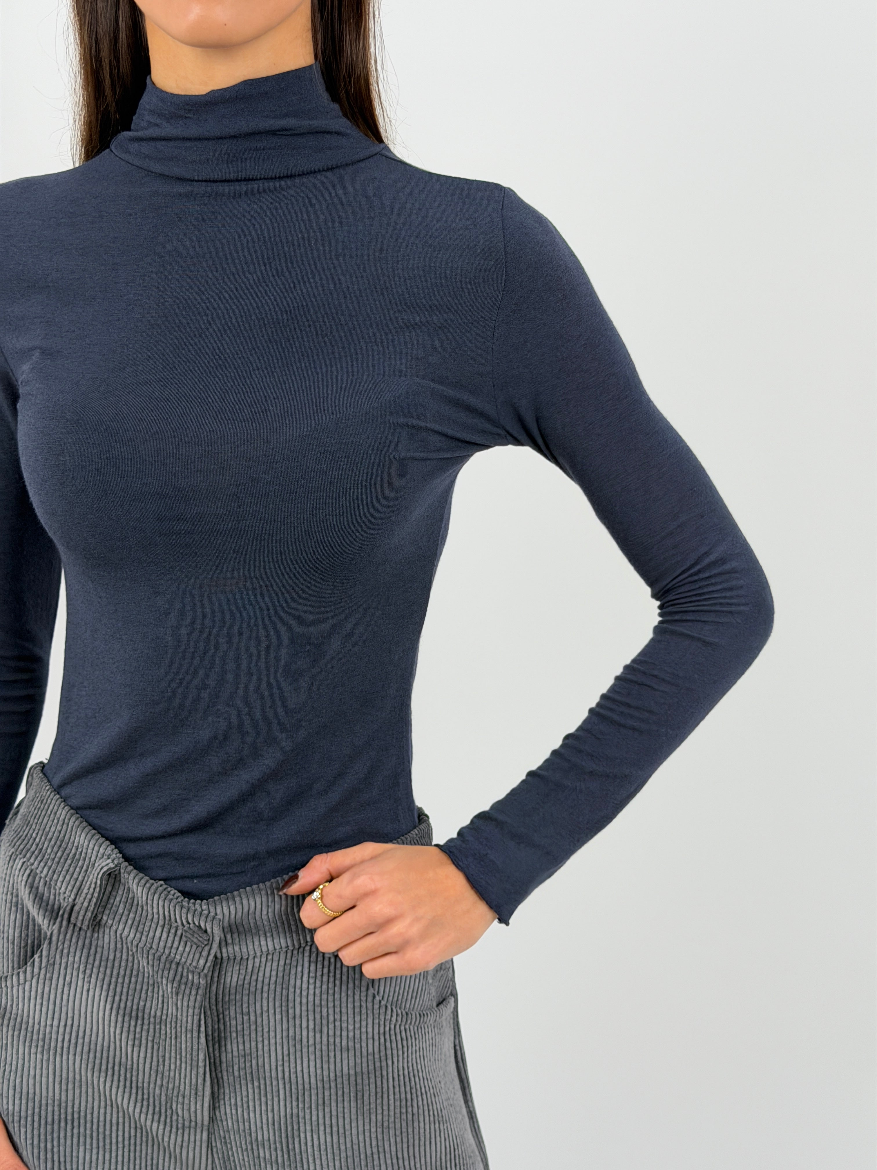 Maglia dolcevita blu con collo alto in tessuto morbido e sottile misto cashmere.